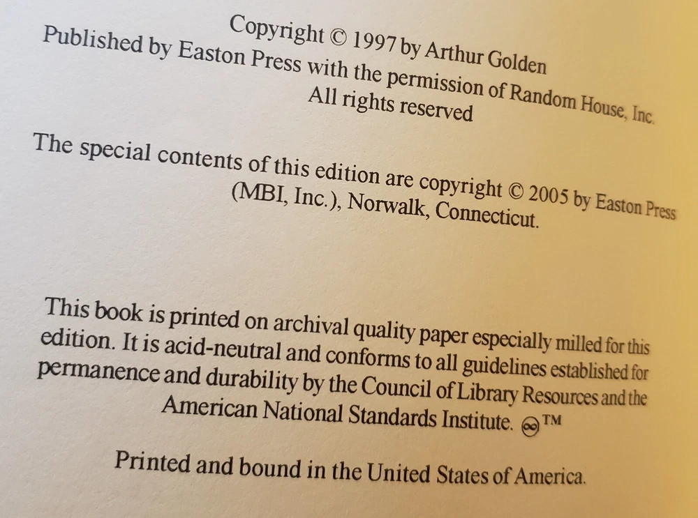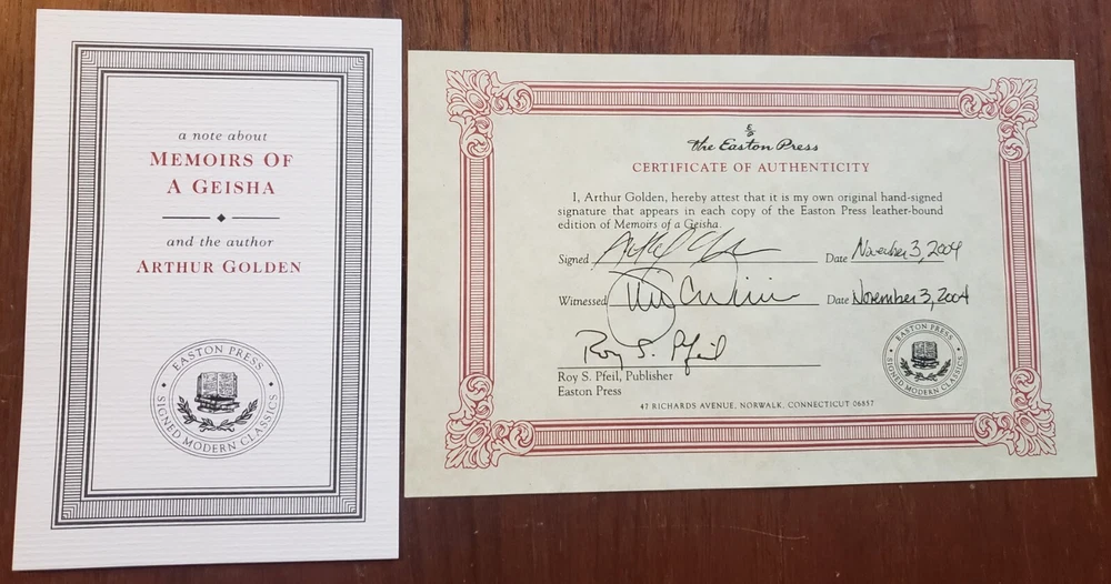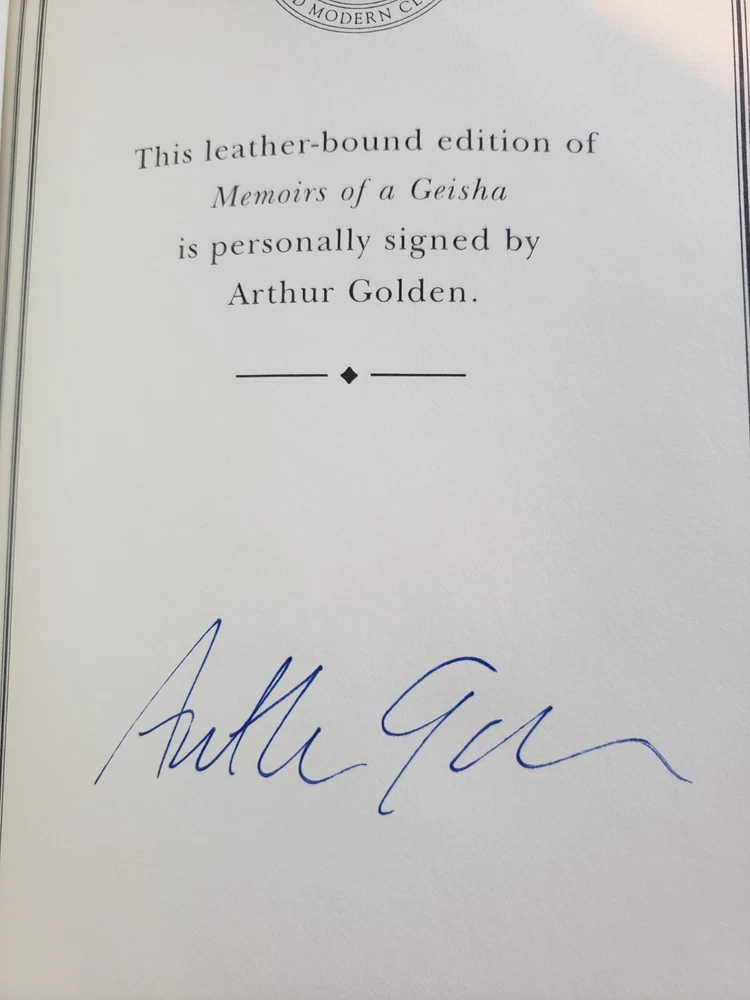 This is an Easton Press Arthur Golden Signed "Memoirs of a Geisha" Leather HC with Certificate of Authenticity. Book looks to be in Like New condition , some wear on gold edge, looks like never read . Has very light smoke odor. Pl ease see photos for condition. I have other items in my E-Bay store if you are interested. Please see above for shipping and handling. E-mail me with any questions. Thank You!!!