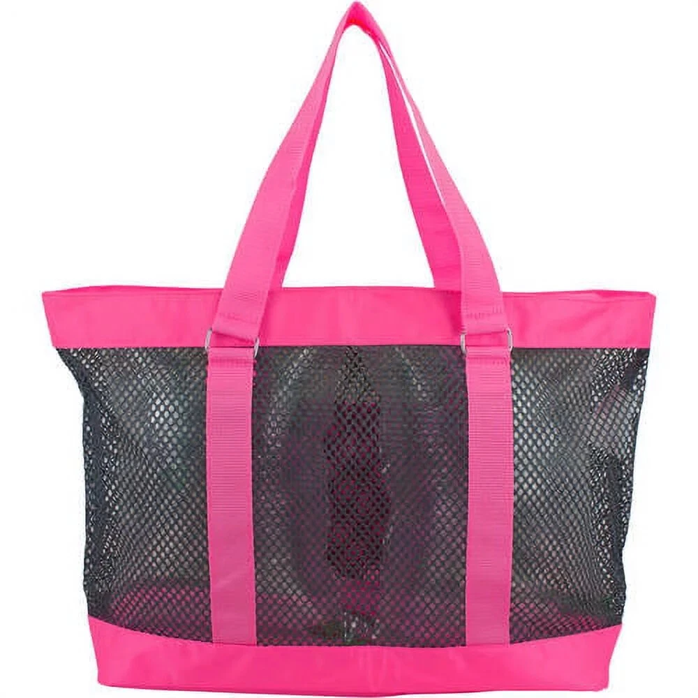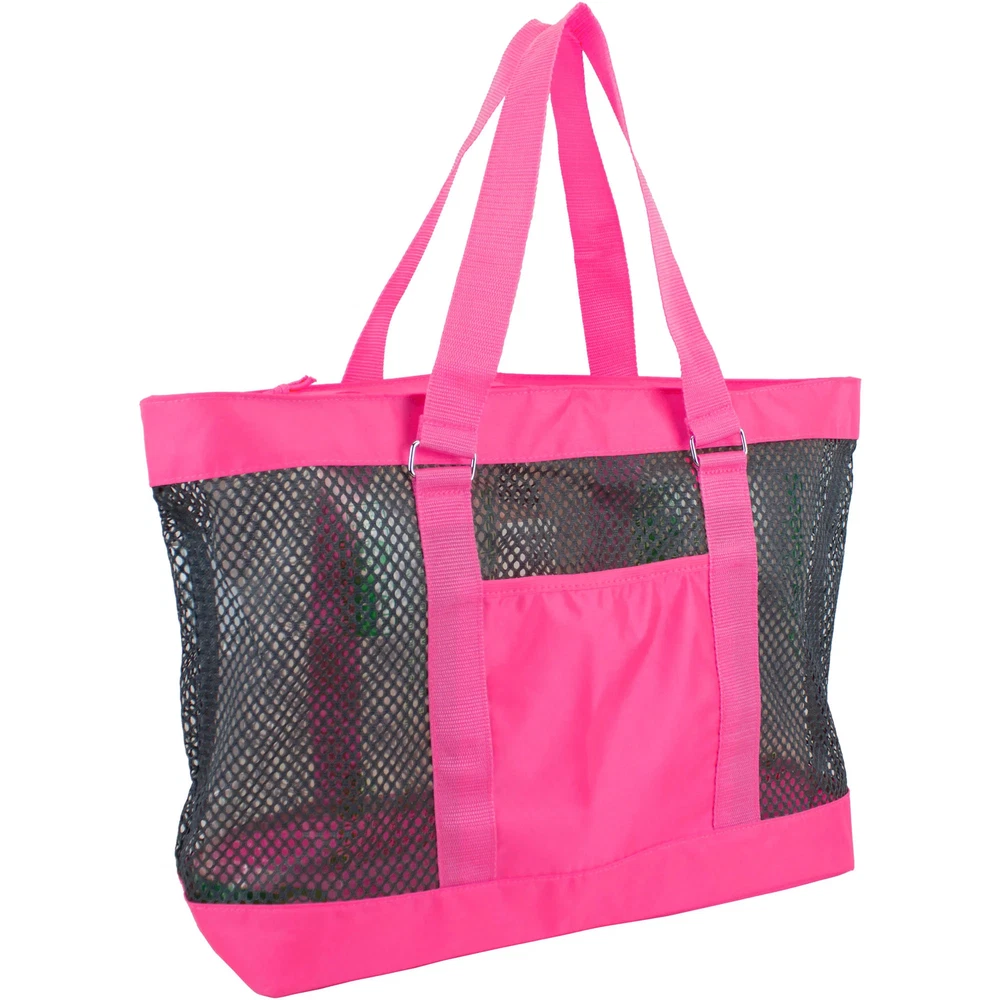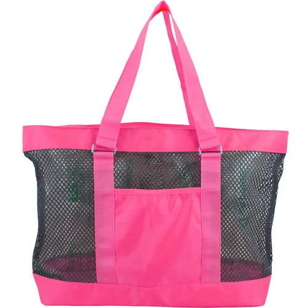 Go for the casual, eye-catching fun Mesh Beach Tote Bag. This cool women's tote is constructed of sturdy polyester in a bright Coral shade that's a transparent Graphite mesh pattern throughout the body, with a thick, solid-colored polyester mesh reinforcing the base and double straps. The solid pocket keeps your valuables out of sight. It has a metal magnet closure to fully secure items. You can use this cool mesh tote as a purse or to carry anything you need for the day-beachwear, towels, books, extra clothes, or anything else you can think of. Spacious main storage compartment Reinforced front storage drop pocket Zipper closure for secure storage on the go Breathable mesh lightweight construction