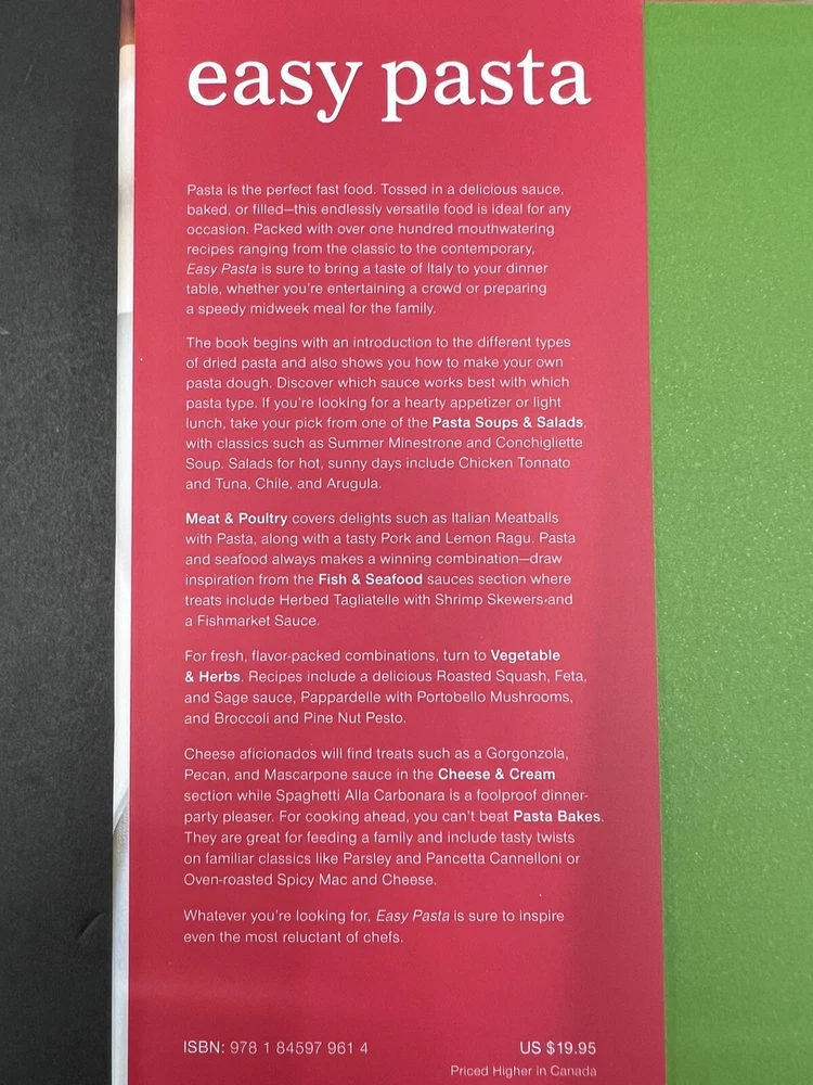Experience the taste of Italy with this hardcover cookbook, "Easy Pasta: Simple Recipes for Great-Tasting Pasta." With 240 pages of classic recipes and cooking techniques, this book is perfect for anyone who loves Italian cuisine. From cooking by ingredient to specific pasta dishes, this cookbook covers it all. Featuring a dust jacket and illustrations, this first edition book was published in 2010 by Ryland Peters & Small. Measuring 8 inches in length, 8 inches in height, and 1 inch in width, it weighs 25.6 ounces and is in excellent condition. Whether you're a beginner or an experienced cook, this cookbook is a great addition to your collection.