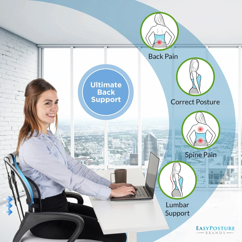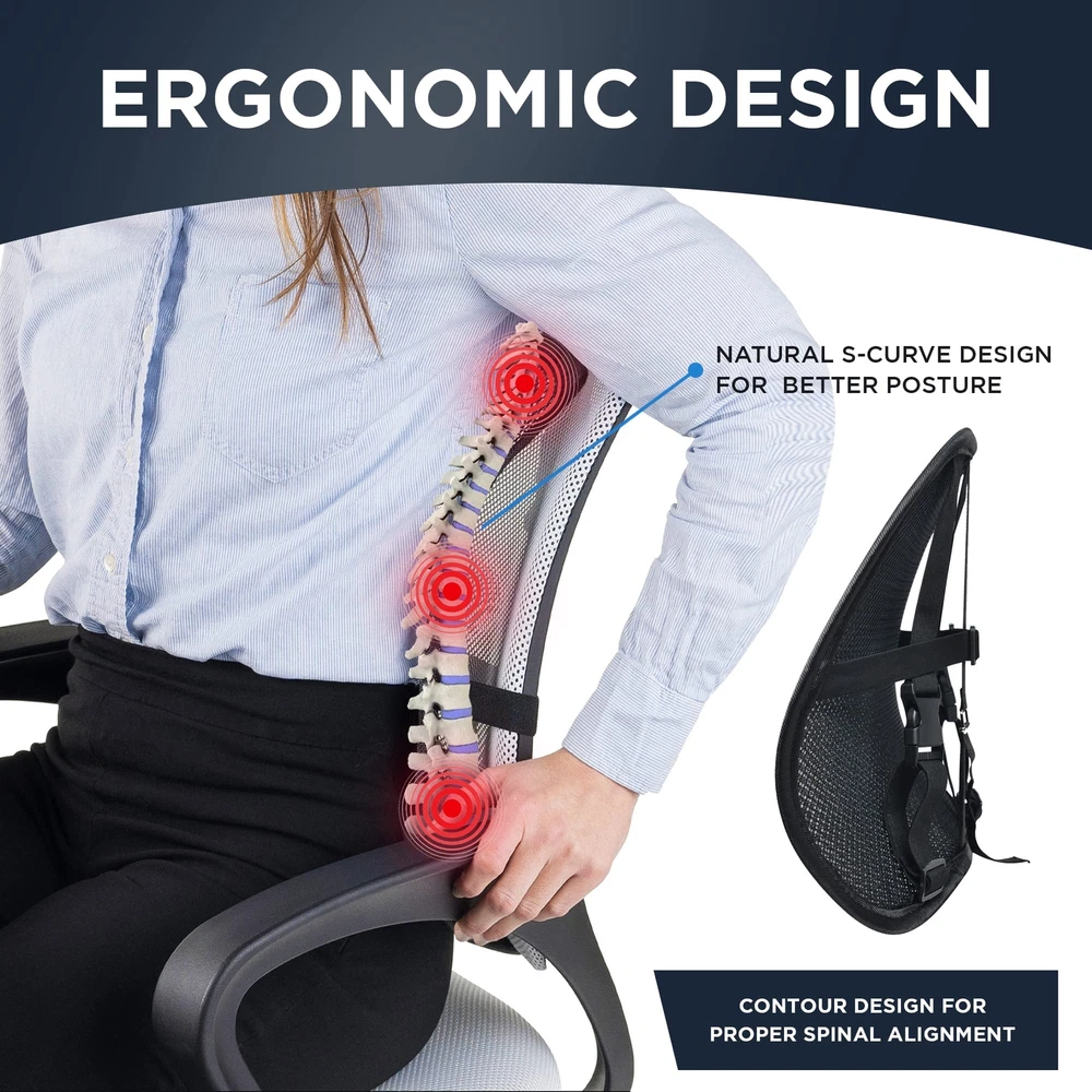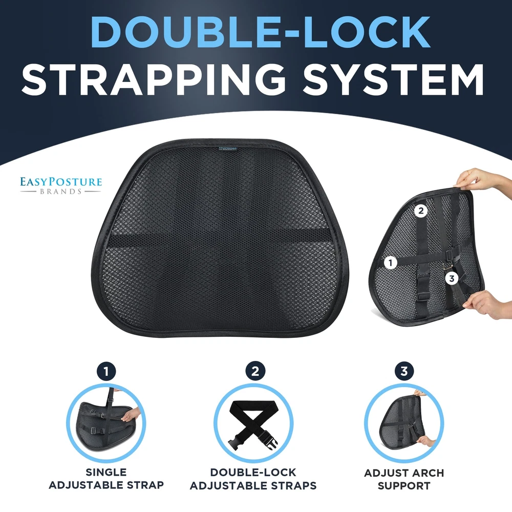 Premium Double-Layered Mesh Lumbar Support (2 Pack) - For Car, Office Chair, Truck Seat, Gaming Chair 🧘♂️【Get Better Posture & Back Support While Sitting】- Our Back Support for Office Chair is made with an ergonomic natural S-curve design and premium breathable double-layer mesh for complete air flow for your back. Our mesh back support for office chair or car contours to your back, thereby relieving pressure and pain from your lower back while sitting or driving. 🛑【Stops Slouching & Poor Posture】- Our Easy Posture corrector for chair helps you to sit up straight in office chairs, desk chair, car seat, or truck seat. Keeps your spine properly aligned to improve & correct your posture. Our back lumbar support for chair will give you firm lower back support. 💦【Say No! to Sweaty Backs】- Unlike memory foam that makes your back sweat, the Easy Posture Back Rest for Chair has a great ventilation system of breathable double mesh fabric designed for great air circulation for your back; very therapeutic! 🛑【 Stops Slippage in Office Chair or Car Seat】- Tighten our lumbar support by using our 3-Way Adjustable Strap System (buckles & snap) (horizontal & vertical) to firmly secure our lumbar support for office chair, desk chairs, car or truck seats & recliners. Adjust & tighten the horizontal strap around most car seats or truck seats. 🚗【No More Back Discomfort While Driving】- Most car seats lack adequate lumbar support. Easy to install our car lumbar support for driving seat and your lower back will feel like you're sitting in a new car with good car seat back support. Our lumbar pillow for car has an ergonomic contoured design with good back support for car seat driver. Perfect for short or long car drives. ✅【Invest in a Chair Support for Better Posture】- Our office chair lumbar support will give you better back support so you can sit longer. Sit & relax with our lumbar support for chair that provides great arch support with dimensions of 15.5"x12.75"x5" (may vary slightly). ✅【Our Policy: Lifetime Replacement Guarantee】If anything goes wrong with your Easy Posture Back Rest for Office Chair, we got your back (literally)! You will be protected under our lifetime warranty. will take good care of you before & after your purchase.