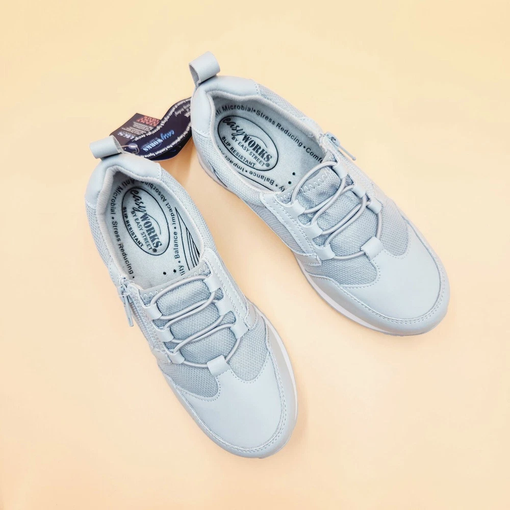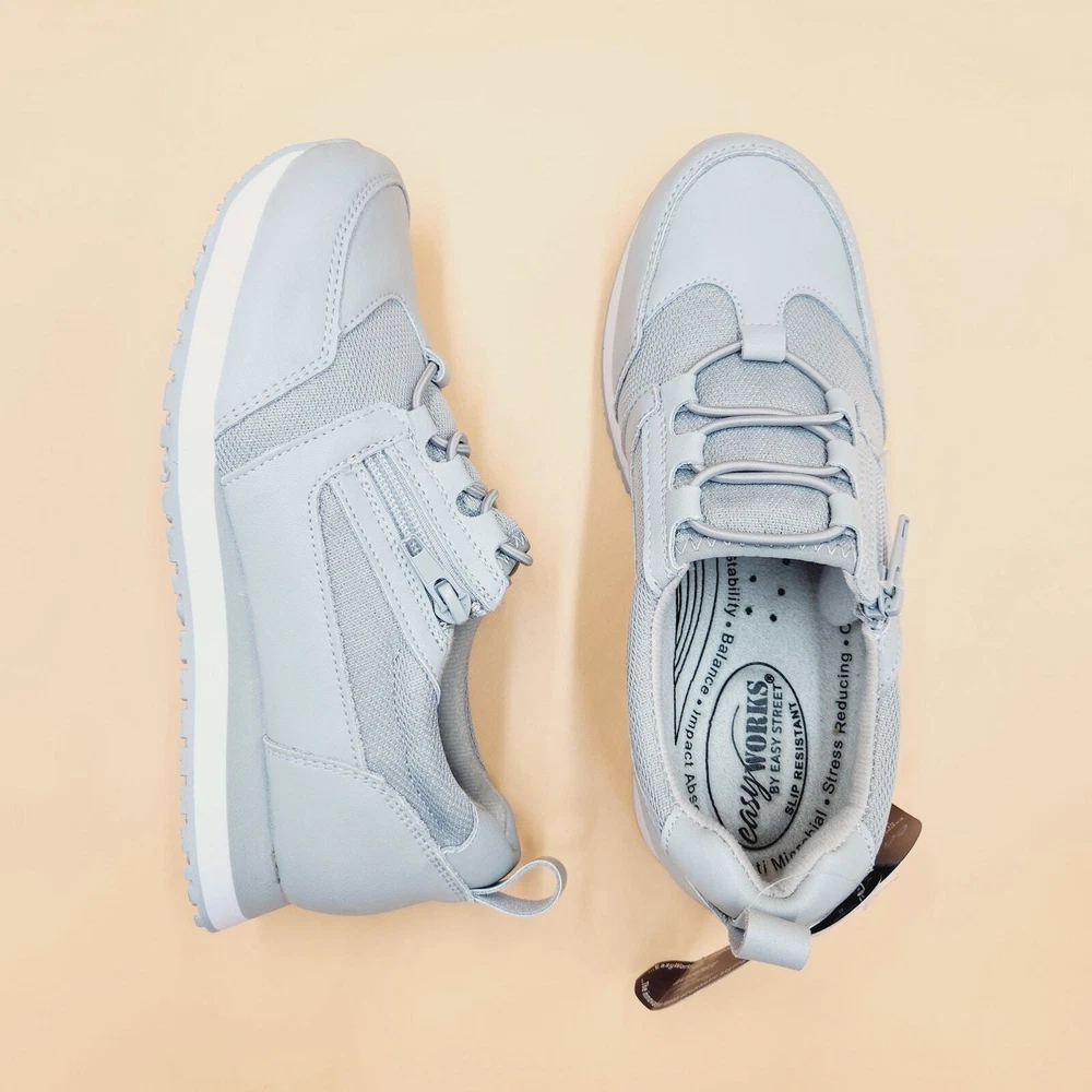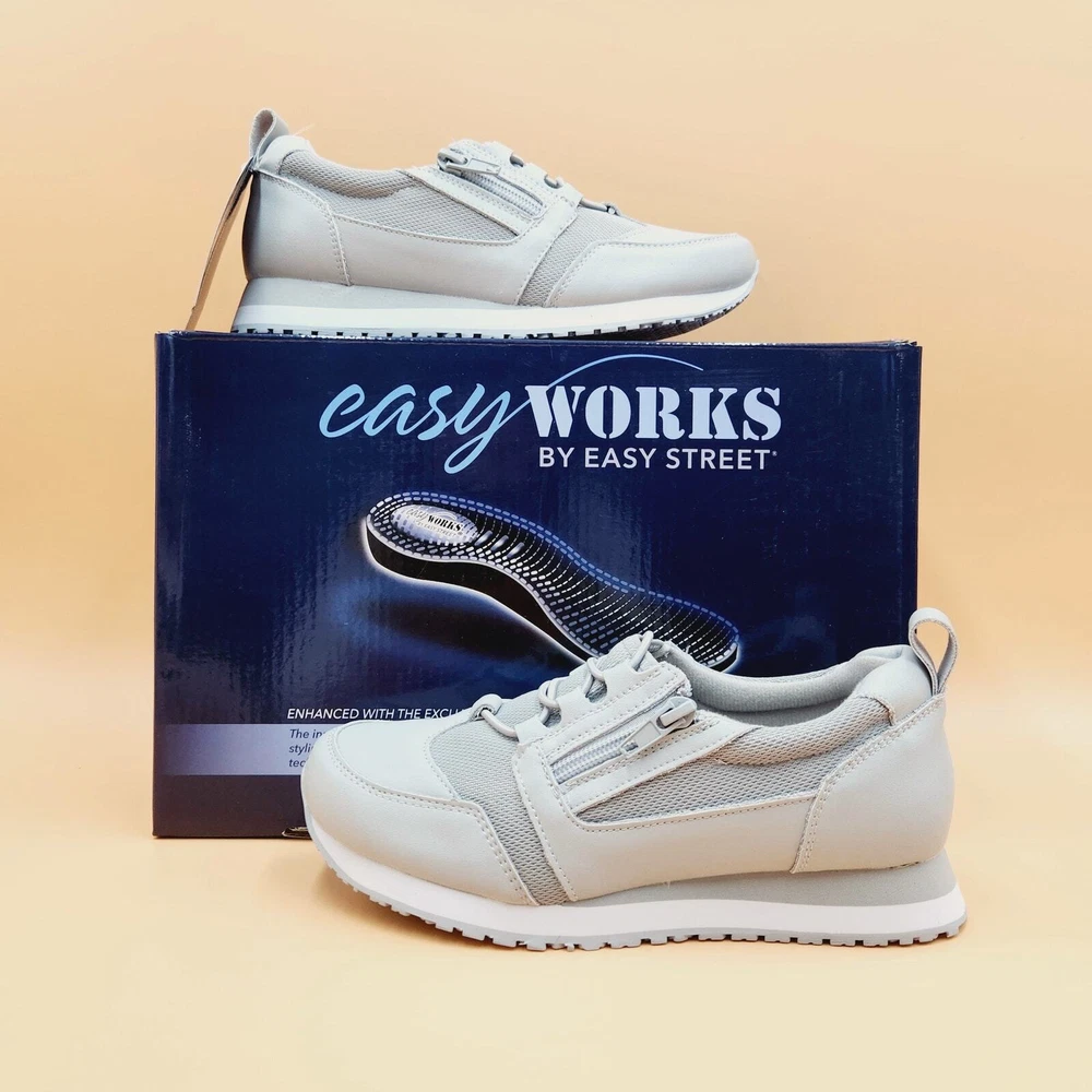 Easy Street Women Grey Leather McKinley Slip Resistant Oxford Sneakers Size 5.5M New with box Leather & fabric upper Outside zipper Bungee lace closure Round toe Fabric lining Removable anti-microbial footbed with arch support 1" EVA midsole Slip &-oil resistant rubber sole
