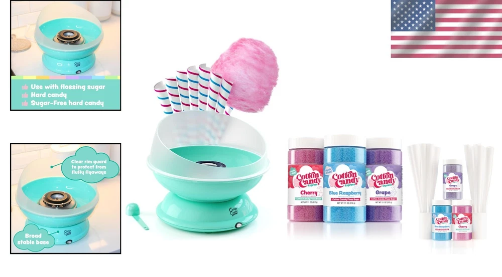 Easy-Clean Cotton Candy Machine with Floss Sugar Variety - Perfect for Parties ‹ › ‹ › ‹ › ‹ › ‹ › ‹ › ‹ › ‹ › ‹ › Easy-Clean Cotton Candy Machine with Floss Sugar Variety Bring the joy of the carnival right to your kitchen with this delightful Cotton Candy Machine! Designed for ease and fun, it's perfect for any party and will create unforgettable sweet memories. Features: Simple operation: Just turn it on, let it heat, add sugar, and watch the magic happen! Versatile usage: Not only for the included flossing sugars, but you can also use crushed hard candy for fun flavor combinations. Retro design: A charming teal mini version reminiscent of festival cotton candy machines from your childhood. Easy cleanup: A quick wash with water and a little soap is all it takes. Allergen-friendly: Flossing sugars are free from peanuts, tree nuts, eggs, dairy, and soy. Enjoy worry-free sweetness! Compact and lightweight: Weighs just 4.7 pounds; easily store it in your cupboard when not in use. What's Included: Home-use cotton candy maker Three flavors of fluffy floss sugar (red Cherry, Grape, & Blue Raspberry) in 11-ounce plastic jars - 22 servings per jar! 50 white paper cotton candy cones for a delightful serving experience. Why Choose Our Cotton Candy Machine? Transform any gathering into a spectacular event with your very own cotton candy maker. It's the ultimate treat for birthdays, holidays, and backyard BBQs! Delight your guests with colorful, melt-in-your-mouth cotton candy in a variety of flavors—let your imagination run wild and experiment with tie-dye colors! With every kit capable of creating over 60 servings, you'll be the life of the party! Enjoy the fun of the fair without ever leaving home. Order your Cotton Candy Machine today and let the sweet moments begin! Shipping Free & Fast Shipping - We offer free shipping to most of the USA with a normal delivery time of 3-7 days. However, due to the current situation, additional delivery time (up to 3 weeks) may be required for some items. Alternative Carriers - We may use alternative carriers (e.g. USPS, FedEx, UPS, etc.) to ensure your package arrives safely and on time. Due to the use of multiple carriers, we are unable to provide a tracking number automatically. Handling Time - Orders are processed and shipped within 1-2 business days of receiving cleared payment. Shipping Restrictions - Shipping to Alaska, Hawaii, Puerto Rico, Guam, and other US territories may incur shipping charges or delivery restrictions. Please contact us before ordering, or your order can be refunded/cancelled. State Restrictions - There may be restrictions based on your state of purchase. For example, certain items may not be shipped to California due to state regulations. Contact for Tracking Updates - If you require tracking updates or have any concerns about the delivery of your order, please feel free to contact us, and we will be happy to assist you. Return 30-Day Hassle-Free Returns - We want you to be completely satisfied with your purchase. If you are not, you can return the item within 30 days of receiving it for a full refund or exchange. Easy Return Process - To start a return, simply contact us and we will provide you with a prepaid return shipping label and detailed instructions. Restocking Fee - There are no restocking fees for returns. However, the buyer is responsible for return shipping costs if the return is not due to a seller's error. Refund Processing Time - Refunds will be processed within 5 business days of receiving the returned item in its original condition. Payment We accept all major credit cards, PayPal, and Apple Pay for your convenience. Your payment information is secure and encrypted to ensure a safe and seamless transaction. Please complete your payment within 3 days of purchase to avoid any delays in shipping. Feedback Your feedback is extremely important to us. We strive to provide the best products and customer service possible. If you are satisfied with your purchase, please take a moment to leave us a positive review. If you have any concerns or issues with your order, please contact us before leaving negative feedback. We are committed to resolving any problems and ensuring your satisfaction. Contact Us If you have any questions or concerns, please feel free to reach out to our customer support team. You can contact us through the eBay messaging system. We are available Monday to Friday, 9:00 am to 5:00 pm EST, and we will do our best to respond to your inquiry within 24 hours. Buy it now and enjoy a pleasant shopping experience! UPC: Not Set Model: Not Set MPN: Not Set Unit Quantity: 60 Servings Bowl Material: Plastic Brand: Unbranded Output: 60 Servings RPM: Not Specified Country/Region of Manufacture: Not Set Unit Type: Unit