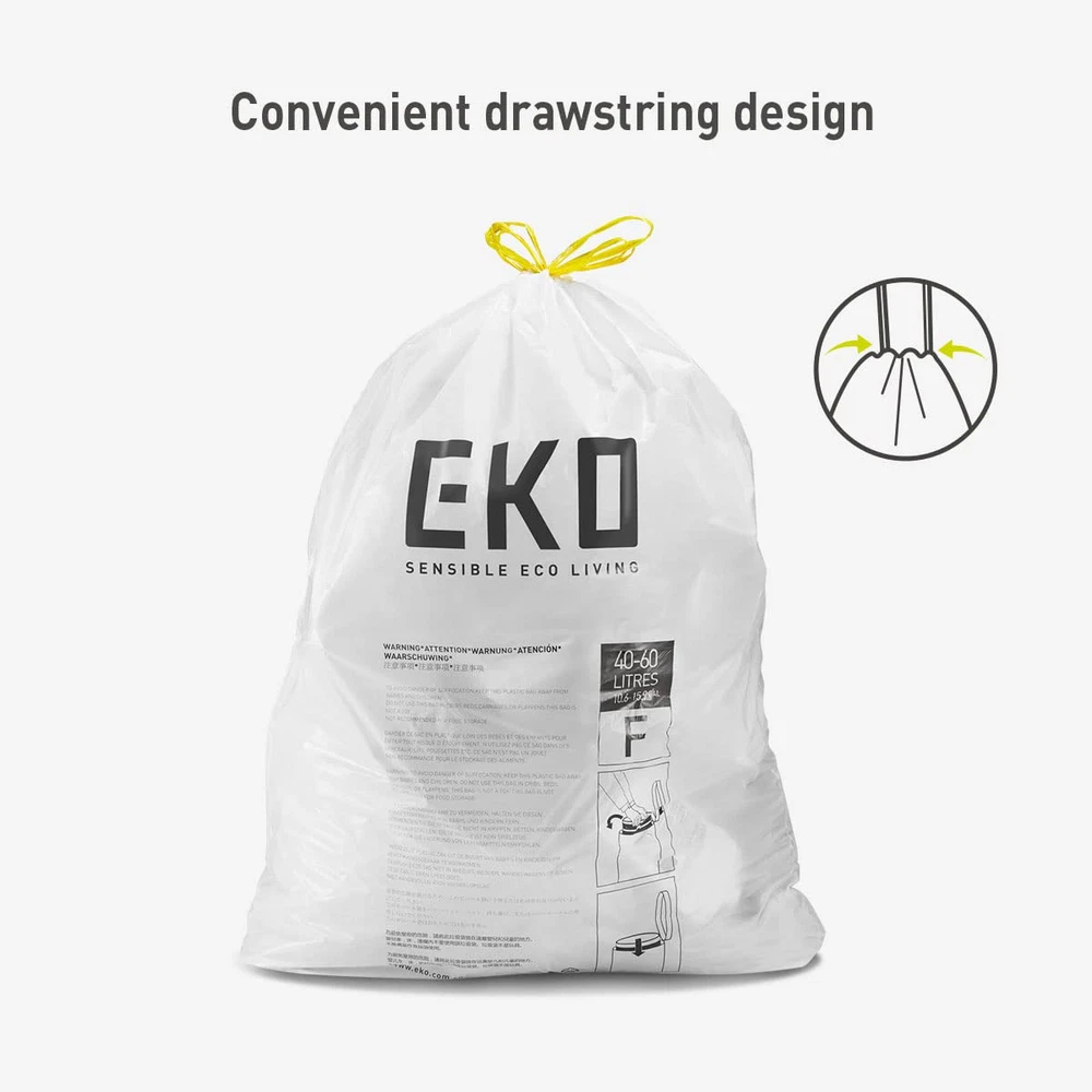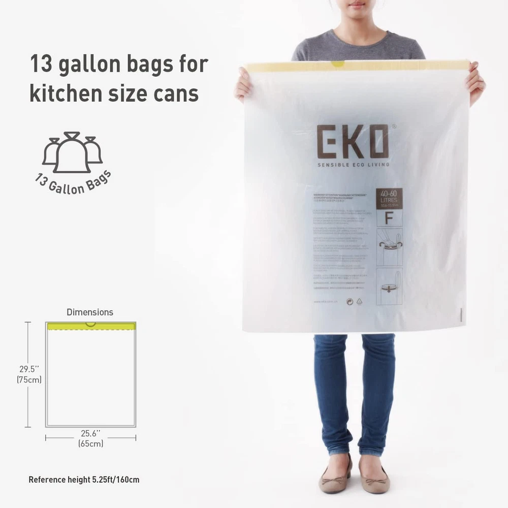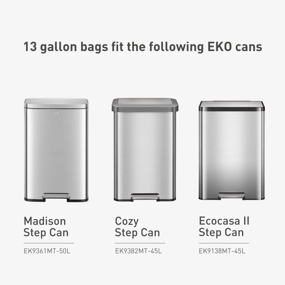 brand 13 Gallon (49.2L) extra strong kitchen trash bags are thick and durable to resist ripping and tearing. Built of multiple layers to provide strength and leakproof peace of mind while in use and when taking out the trash. The drawstring design is easy to lift for removal, tie, and carry. These trash bags come on an easy-dispense roll of 60 bags, so there's no fumbling around when you need a replacement bag. These extra strong kitchen trash bags are designed for brand trash cans, but can be used for any standard kitchen-sized trash can with a capacity between 10G - 15.9G (40L-60L). "F" type bags. Ideal for models: EK9382MT-45L (Cozy 45L), EK9138MT-45L (EcoCasa II 45L), EK9361MT-50L (Madison 50L), EK9262MT-45L (Horizon 45L), EK99278TBMT-50L (Mirage-T), EK9277TBMT-50L (Phantom-T), EK9260BMT-45L (Mirage-X 45L), EK9260MT-47L (Mirage-X 47L), EK9261BMT-45L (Phantom-X 45L), EK9261MT-47L (Phantom-X 47L), EK9290MT-50L (NeoCube 50L). Also use these handy, high-quality bags around your home for storage and cleaning purpose. Not recommended for food storage. To avoid danger of suffocation, keep this and all plastic bags away from babies and children. Do not use this bag in cribs, carriages, or playpens. This bag it not a toy. Ultra Strong Material - Our heavy duty garbage bags are made with 1 mil thickness making them 10% stronger than the leading national trash bags. The Perfect Fit - Standard 13 Gallon kitchen trash bag sized for seamless use. Leak-Resistant - Built of multiple layers to provide strength and leakproof peace of mind while in use and when taking out the trash. Easy Handling- The drawstring design allows for effortless lifting, tying, and carrying. Convenient Pack - These trash bags come on an easy-dispense roll of 60 bags, so there's no fumbling around when you need a replacement bag.