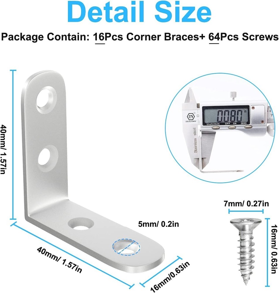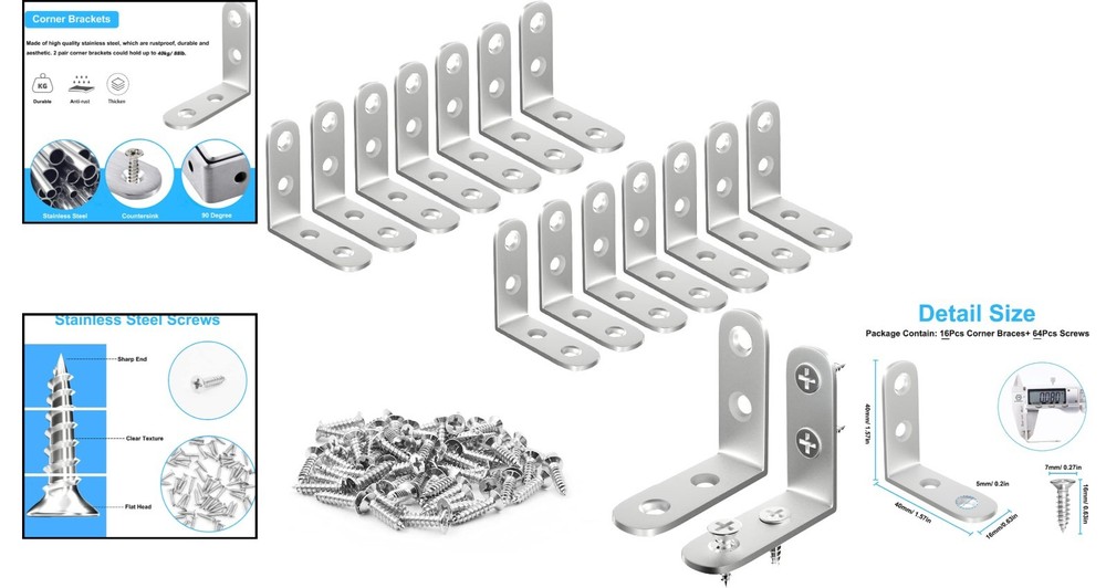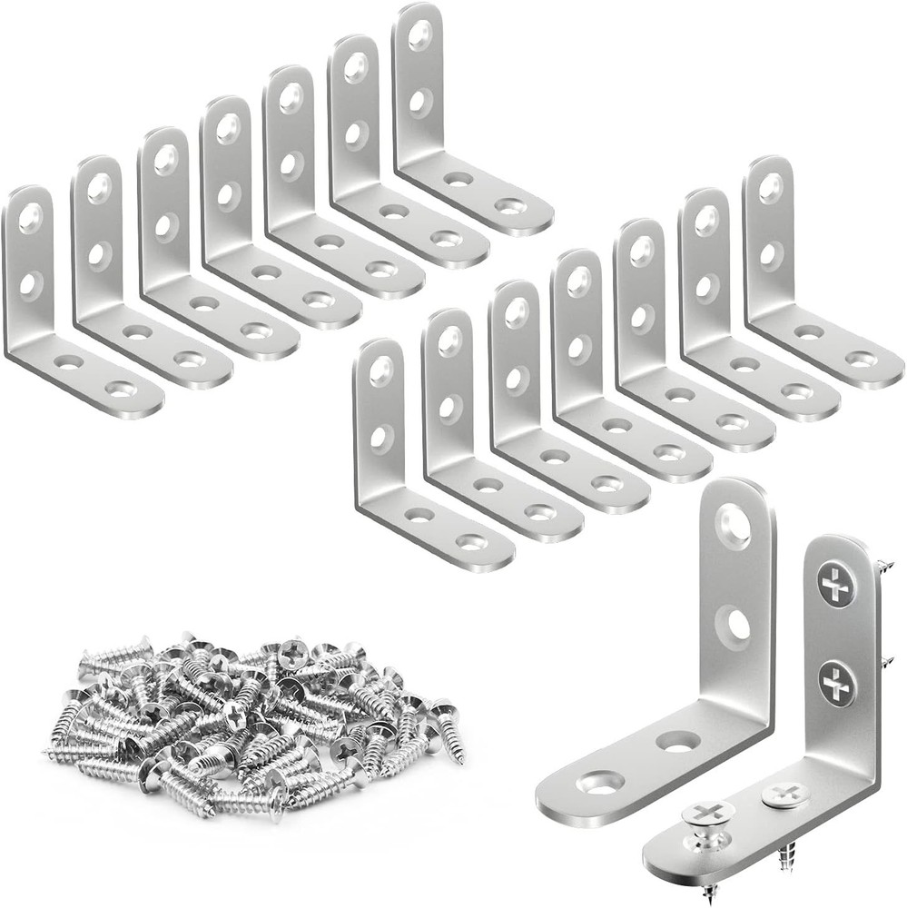 Easy-install Stainless Steel L Brackets - 16-Pc Set for Furniture Reinforcement ‹ › ‹ › ‹ › ‹ › ‹ › ‹ › ‹ › ‹ › Easy-Install Stainless Steel L Brackets - 16-Pc Set Your solution for furniture reinforcement has arrived in a conveniently packaged set of 16 L brackets... Product Details: Package Contains: 16 pcs L brackets + 64 pcs screws Dimension: Each corner brace measures 1.57 x 1.57 x 0.63 inch Thickness: 0.08 inch Hole Diameter: 0.2 inch Screw Length: 0.63 inch Screw Head Diameter: 0.27 inch Features: Strong & Durable: Crafted from high-quality stainless steel, these brackets are rustproof and waterproof, ensuring a sturdy performance for daily applications. Brace & Reinforce: Designed to prevent corner joints from collapsing under structural loads or impacts, these L-shaped brackets are essential for securely joining two wood furniture parts. Easy to Install: The self-tapping screws feature deep threads for a firm fastening force. Counterbore designed mounting holes eliminate any protrusions, making installation effortless. Practical Hardware: Perfect for small DIY projects, our 90-degree brackets are ideal for reinforcing right-angle corner joints in tight spaces, including bookshelves, cabinets, dressers, chairs, and more. Why Choose Our L Brackets? Transform your DIY projects into masterpieces with our Easy-Install Stainless Steel L Brackets. These sturdy brackets not only provide the strength you need for assembling your furniture but also ensure a beautiful finish with their sleek design. When your furniture needs reinforcement, rely on the quality and durability that only stainless steel can provide. Your home deserves the best – choose our L Brackets today and experience the blend of functionality and style! Shipping Free & Fast Shipping - We offer free shipping to most of the USA with a normal delivery time of 3-7 days. However, due to the current situation, additional delivery time (up to 3 weeks) may be required for some items. Alternative Carriers - We may use alternative carriers (e.g. USPS, FedEx, UPS, etc.) to ensure your package arrives safely and on time. Due to the use of multiple carriers, we are unable to provide a tracking number automatically. Handling Time - Orders are processed and shipped within 1-2 business days of receiving cleared payment. Shipping Restrictions - Shipping to Alaska, Hawaii, Puerto Rico, Guam, and other US territories may incur shipping charges or delivery restrictions. Please contact us before ordering, or your order can be refunded/cancelled. State Restrictions - There may be restrictions based on your state of purchase. For example, certain items may not be shipped to California due to state regulations. Contact for Tracking Updates - If you require tracking updates or have any concerns about the delivery of your order, please feel free to contact us, and we will be happy to assist you. Return 30-Day Hassle-Free Returns - We want you to be completely satisfied with your purchase. If you are not, you can return the item within 30 days of receiving it for a full refund or exchange. Easy Return Process - To start a return, simply contact us and we will provide you with a prepaid return shipping label and detailed instructions. Restocking Fee - There are no restocking fees for returns. However, the buyer is responsible for return shipping costs if the return is not due to a seller's error. Refund Processing Time - Refunds will be processed within 5 business days of receiving the returned item in its condition. Payment We accept all major credit cards, PayPal, and Apple Pay for your convenience. Your payment information is secure and encrypted to ensure a safe and seamless transaction. Please complete your payment within 3 days of purchase to avoid any delays in shipping. Feedback Your feedback is extremely important to us. We strive to provide the best products and customer service possible. If you are satisfied with your purchase, please take a moment to leave us a positive review. If you have any concerns or issues with your order, please contact us before leaving negative feedback. We are committed to resolving any problems and ensuring your satisfaction. Contact Us If you have any questions or concerns, please feel free to out to our customer support team. You can contact us through the eBay messaging system. We are available Monday to Friday, 9:00 am to 5:00 pm EST, and we will do our best to respond to your inquiry within 24 hours. Buy it now and enjoy a pleasant shopping experience! Model: L Bracket Corner Fasteners Unit Quantity: 16 Material: Stainless Steel,High Quality Stainless Steel Holes per Leaf: 2 Type: Angle Bracket System of Measurement: Inch Grade: 304 Number in Pack: 16 Finish: Painted