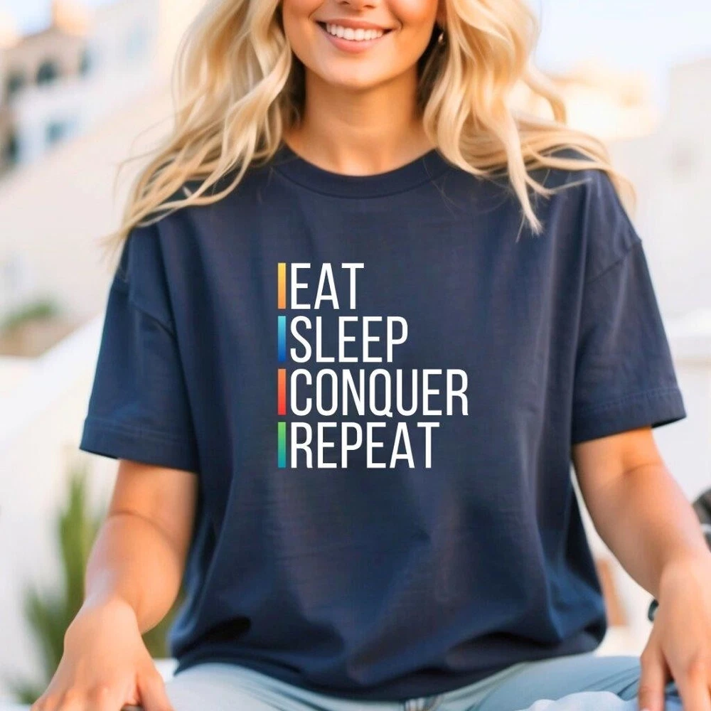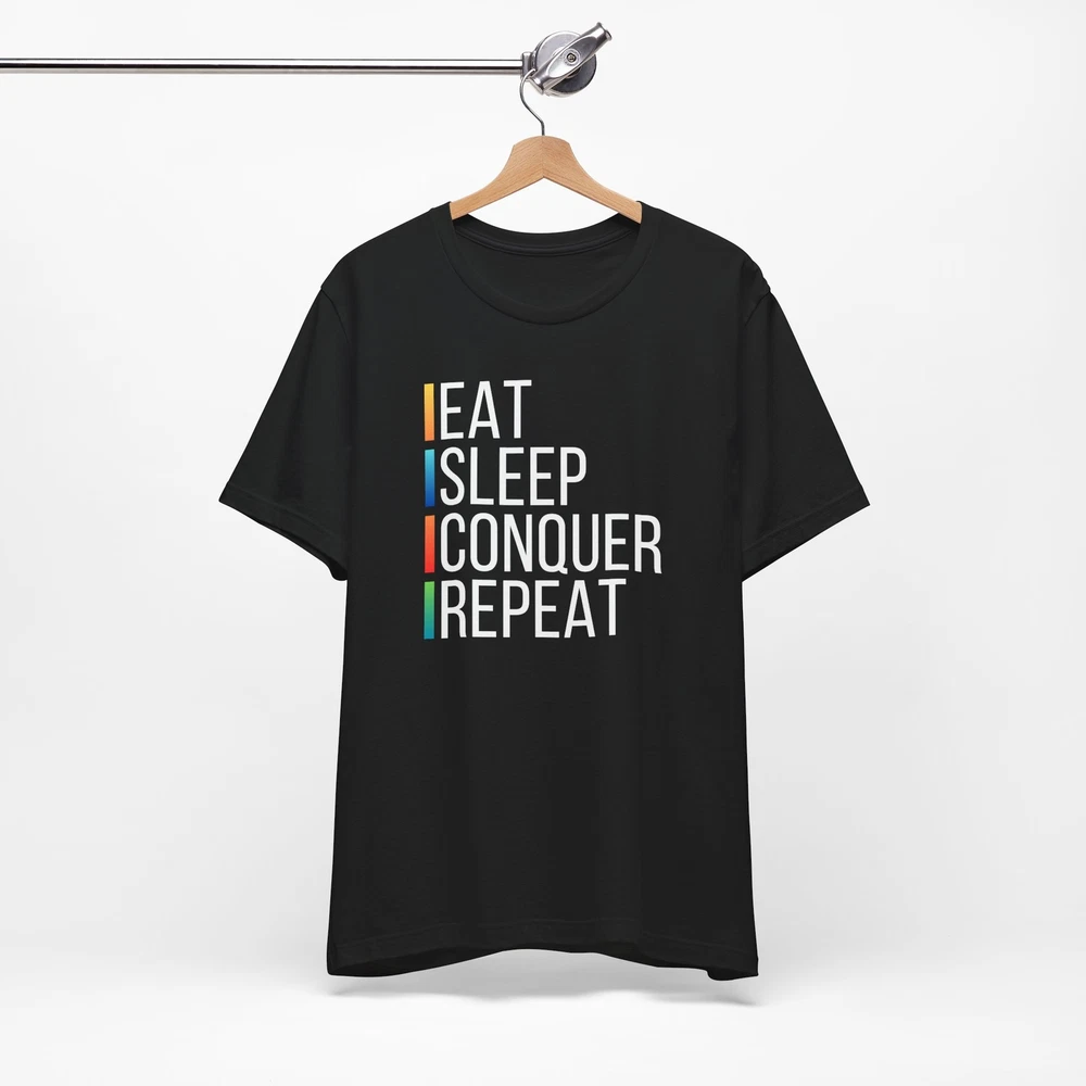 "Unleash your relentless drive with our 'Eat, Sleep, Conquer, and Repeat' T-shirt. This dynamic design embodies the spirit of determination and persistence, perfect for those who never back down from a challenge. Made from premium materials, this tee offers unbeatable comfort and durability for all your daily adventures. Whether you're hitting the gym, conquering your goals, or just living life to the fullest, this shirt is your ultimate mantra. Elevate your wardrobe with our 'Eat, Sleep, Conquer, and Repeat' tee, available in a variety of sizes and colors to match your unstoppable energy." This classic unisex jersey short sleeve tee fits like a well-loved favorite. Soft cotton and quality print make users fall in love with it over and over again. These t-shirts have-ribbed knit collars to bolster shaping. The shoulders are tapered for a better fit over time. Dual side seams hold the garment's shape for longer. .: Made with 100% Airlume combed and ring-spun cotton, a lightweight fabric (4.2 oz/yd² (142 g/m²)) that is easy to layer, breathable. Perfect for active and leisure wear. .: The retail fit that is perfect for casual and semi-formal settings. The crew neckline adds a classic, neat style that's perfect for accessorizing. .: Bella+Canvas manufactures all its products in the US and internationally in humane, no-sweat-shop, sustainable way and is part of the Fair Labor Association as well as Platinum WRAP certified. .: The tear-away label minimizes skin irritations.