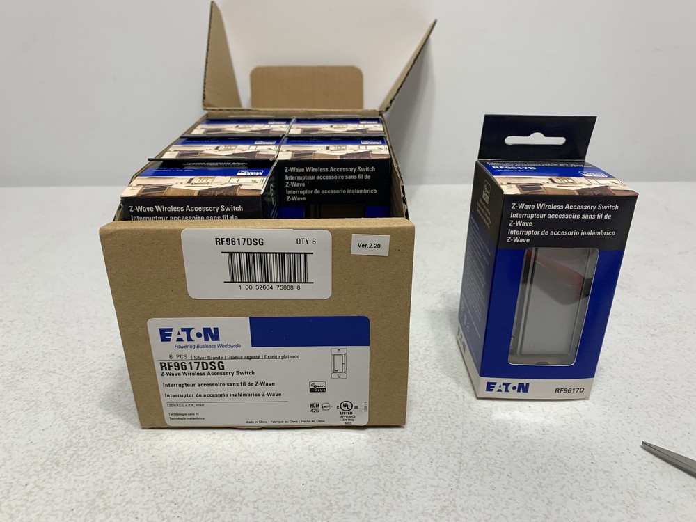 PRODUCT DESCRIPTION Eaton RF9617DSG Z-Wave Accessory Light Switch 120V Silver Granite This is a New Eaton RF9617DSG Z-Wave Accessory Light Switch 120V Silver Granite. It is designed for wireless lighting control using Z-Wave technology. Details: Brand: Eaton Manufacturer Part #: RF9617DSG Condition: Brand new, unused, and in original packaging. 120V AC operation Z-Wave wireless protocol Screwless wall plate ready Applications: Smart home automation Remote light control Shipping: Will ship FedEx Ground — Free Shipping. Expedited shipping options available at checkout. Buy with confidence — this is a genuine Eaton part built to last. Find one of our products cheaper elsewhere? We will beat the price. Feel free to make an offer. © Copyright Chase Surplus, Inc. All rights reserved.