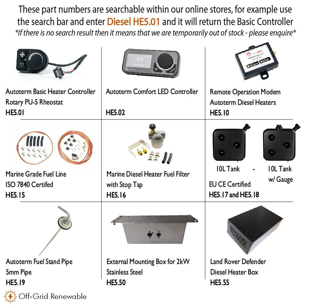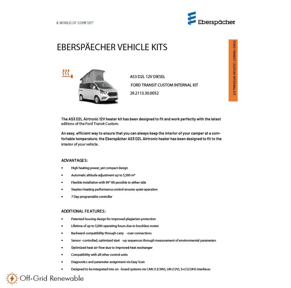 ITEM DESCRIPTION The AS3 D2L Airtronic 12V heater kit has been designed to fit and work perfectly with the latest editions of the Ford Transit Custom. An easy, efficient way to ensure that you can always keep the interior of your camper at a comfortable temperature, the Eberspacher AS3 D2L Airtronic heater has been designed to fit to the interior of your vehicle. Easily mounted to the inside of your Ford camper. Supplied with all the parts needed to install it to a Digital display via Cam or Lin Bus connection. Powered by 12V or 240V electricity and fuel from your vehicle. Comes with an Easy Start Pro controller, so you can alter settings from anywhere inside your camper. This kit contains: Eberspacher AS3 D2L Heater, Mount bracket for internal installation, Easy-start Pro controller, Wiring loom for battery, Fuel pipe with tank pick up, 1 metre exhaust, Ducting and associated fittings included, 1x hot air outlet. Additional Features: • Patented housing design for improved plagiarism protection • Lifetime of up to 5,000 operating hours due to brushless motor • Backward compatibility through carry-over connections • Sensor-controlled, optimised start-up sequences through measurement of environmental parameters • Optimised heat air flow due to improved heat exchanger • Compatibility with all other control units • Diagnostics and parameter assignment via Easy Scan • Designed to be integrated into on-board systems via CAN (12/24V), LIN (12V), S+(12/24V) interfaces Key Features -High heating power, yet compact design -Automatic altitude adjustment up to 5500m -Flexible installation with 90° tilt possible to either side -Stepless heating performance control ensures quiet operation -7 Day programable controller Voltage: 12 Volt Heat output: 850 to 2,200 Watt Air flow volume: 105 m3/h Electrical power consumption: 6 (min.) to 31 (max.) Watt Fuel consumption: 0.10 (min.) to 0.28 (max.) l/h -------------------- PACKAGE INCLUDES - - Complete Eberspacher kit for Ford Transit Custom -------------------- ADDITIONAL NOTES - Suitable For - Ford Transit Brand - Eberspacher Voltage Description - 12V DC Colour - Black Wattage - 6W to 31W Fuel - Diesel Country of Origin - United Kingdom Contents - Airtronic AS3 D2L Heater, Internal Mounting Bracket, Easy-start Pro Controller, Wiring Loom, Fuel Pipe, 1m Exhaust, Ducting, Fittings, Hot Air Outlet PLEASE NOTE: If you have one of the following postcodes then there may be an extra postage charge on top of the cost of the item, depending on the item that you have purchased and the service that we use - We will contact you if there are additional shipping fees to AB, IV, KA, KW, PA, PH, BT, HS, ZE, IM, TR, FK. Please ask for a quote if you are unsure. -------------------- SMALL PRINT PAYMENT Payments by paypal, bank transfer and cash on collection are accepted POSTAGE Please see the postage policy at the top of the page for full details of our postage options RETURNS Returns are accepted. Please see the returns policy at the top of the page for further details FEEDBACK If you have an issue with the order please feel free to contact us to discuss by using the ‘Contact Seller’ facility DELIVERY Please remember that delivery time is based on working days. Please allow a suitable amount of time for delivery, taking into account weekends and Bank Holidays **PLEASE SEE OUR EBAY STORE FOR MOTORHOME AND BOAT ACCESSORIES**