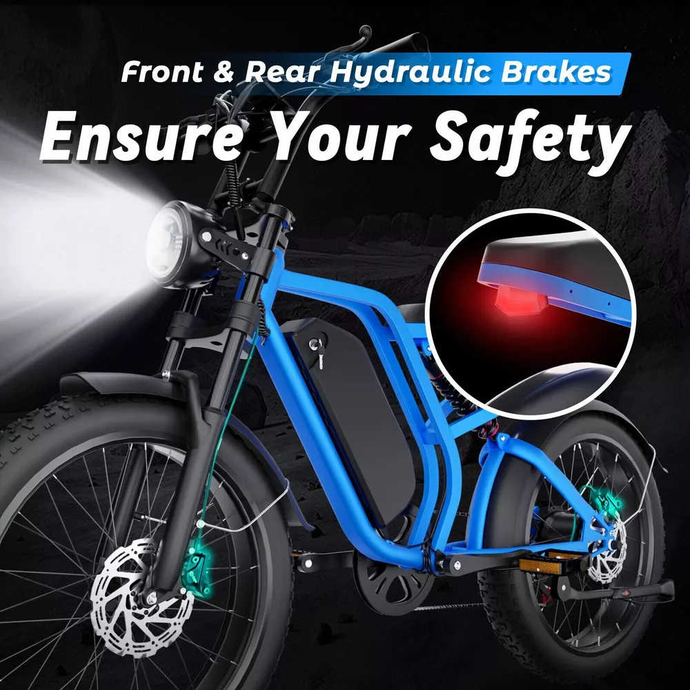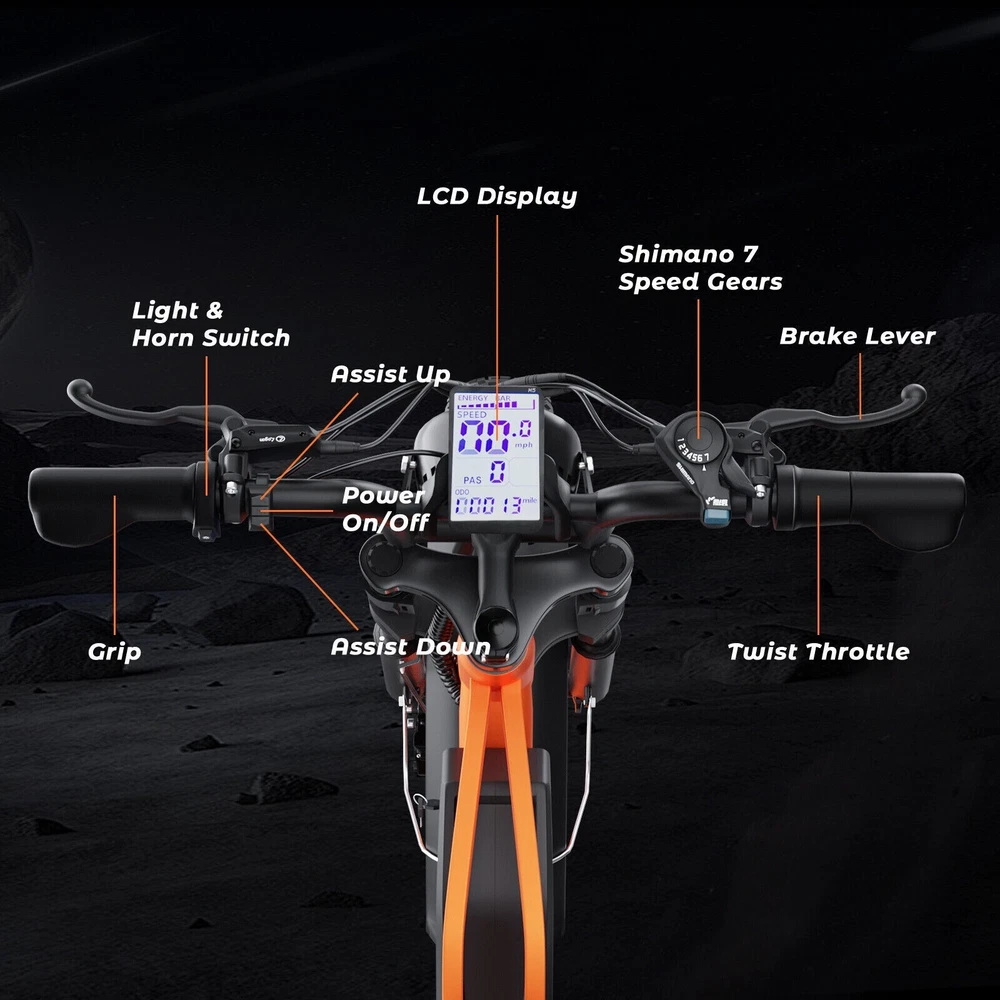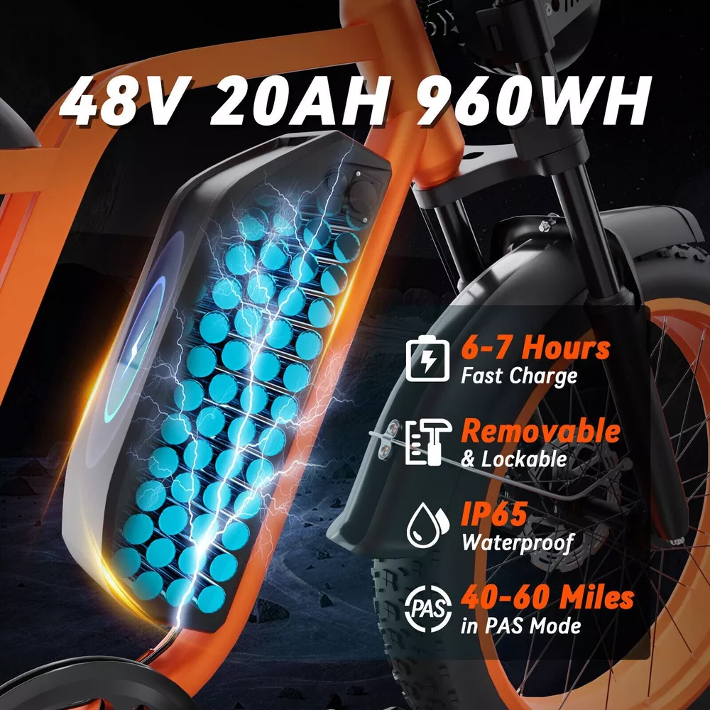 Key Features 【Powerful 1500W Peak Electric Bike】 1000W Motor with 1500W Peak Power - Perfect for City and Off-Road Rides. This electric dirt bike is powered by a 1000W motor (1500W peak), providing 85NM torque and a top speed of 48V 25 MPH / 52v 31MPH . Whether you’re riding through city streets or exploring off-road, this bike delivers exceptional performance and power for all your riding adventures. 【48V / 52V 20Ah Large Capacity Battery】 Equipped with a 48V 20Ah / 52V 20Ah battery providing a 960Wh / 1040Wh capacity, this e-bike offers an impressive range of 40-60 miles in pedal-assist mode on a single charge. With a higher watt-hour (Wh) rating, the bike can store more energy, which translates to longer rides between charges. Get back on the road faster with an 8-10 hour charging time. 【Superior Suspension & Fat Tires for All-Terrain Capability】 Designed with front and rear suspension and 20"x4.0" fat tires, this electric bike handles all types of terrain, from gravel paths to snow-covered roads. Whether you’re riding in the city or on rugged trails, the bike’s shock absorption system ensures a comfortable and stable ride. 【Advanced Safety Features with Hydraulic Disc Brakes】 The Logan hydraulic disc brakes offer reliable stopping power, while turn signals, brake lights, and front and rear LED lights ensure you stay visible and safe on your ride, no matter the time of day. 【Customizable Riding Experience with 7-Speed Gear System 】 This electric motorcycle offers pure electric, pedal-assist, and manual cycling modes with 5 assistance levels. The 7-speed gear system provides smooth shifting, giving you the flexibility to adapt to any riding situation, whether it’s a leisurely ride or a more challenging climb. 【Durable and Stylish Design for All Riders】 With a strong carbon steel frame supporting up to 330 lbs and suitable for riders from 5'1" to 6'1", this electric bike is designed for both comfort and durability. The modern M5 color display adds a premium touch, giving you a stylish and functional bike for any occasion. 【Easy to Assemble】 This e-bike comes 90% pre-assembled. Assembly video will be provided. 【1-year warranty】 1-year warranty for battery, charger, motor and controller. If you run into any trouble with our bikes, pls contact us, we’ll reply your message within 24 hours. Pls keep the original bike box for 30 days for possible returns The item is UL 2849 certified with a link to the UL Product iQ < https://productiq.ulprospector.com/en >
