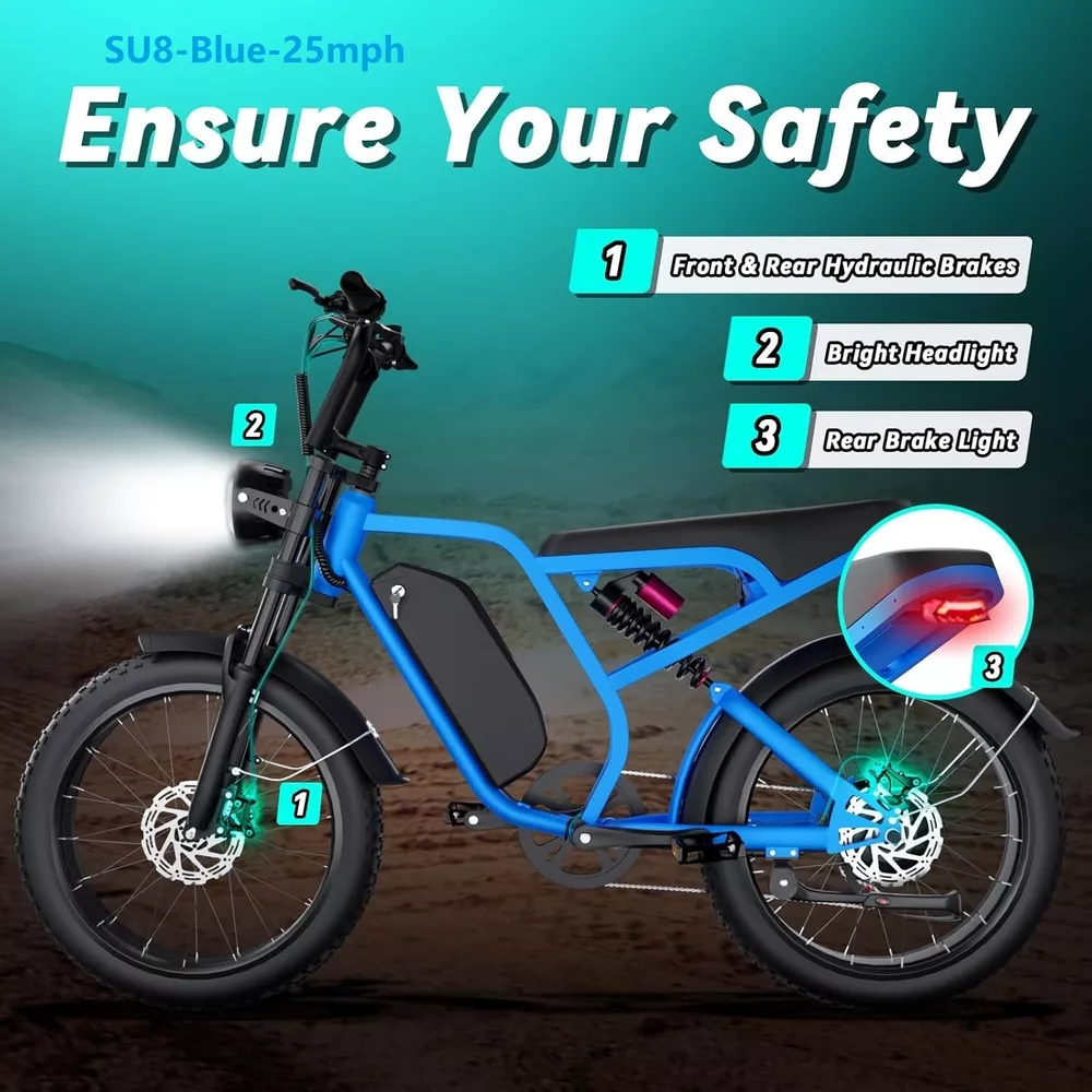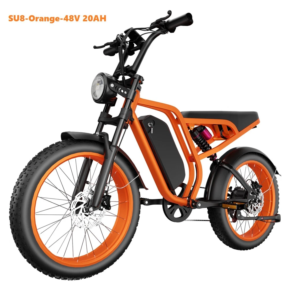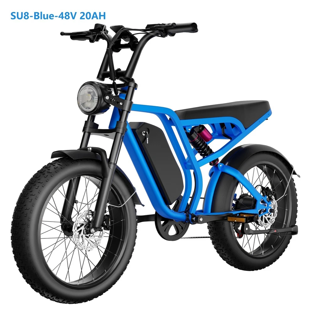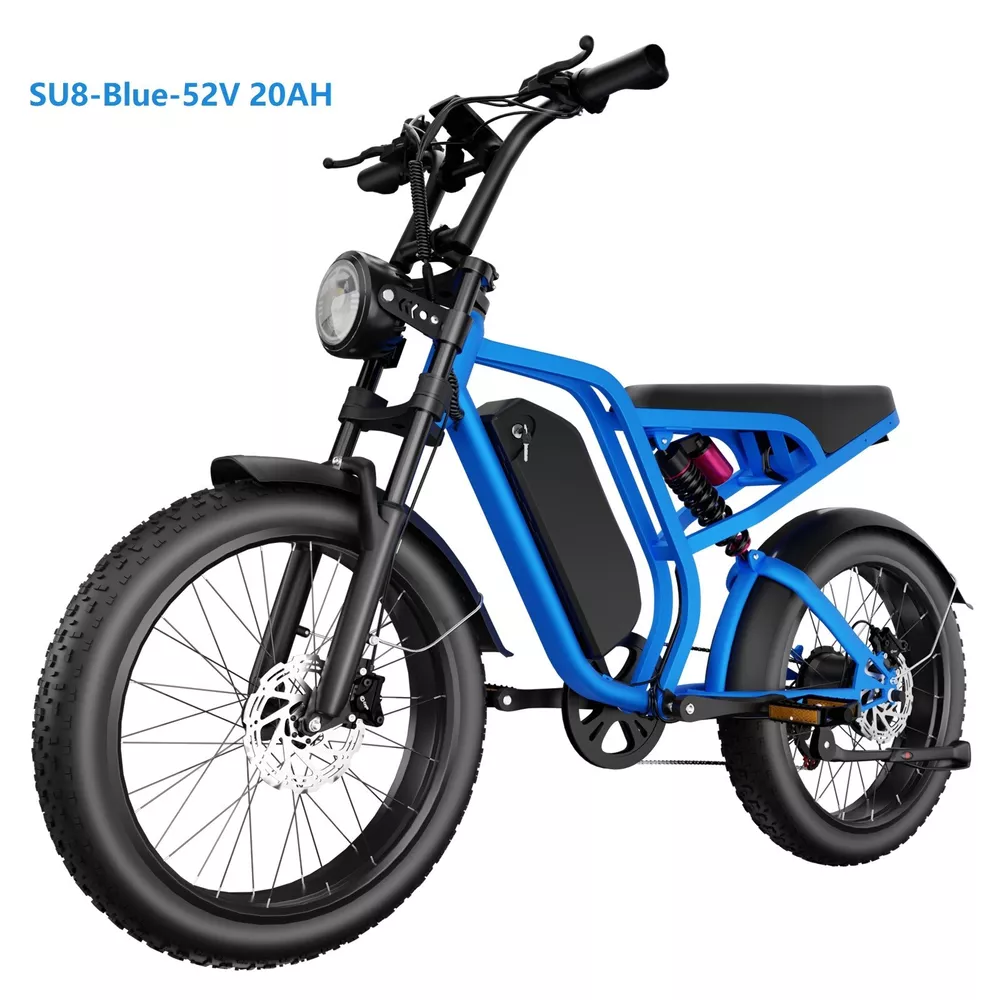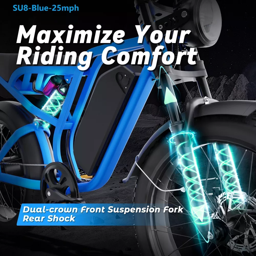 Max Load: 330 lbs (150 kg) MPN: Su8 Motor Power: 1000 W Brand: Bluvall Charging Time: 4 - 6 Hours Package Weight: 93 lbs (42 kg) Department: Unisex Adults Model: SU8-1000W Handlebar Type: Cruiser Bar Suspension Type: Full Suspension (Front & Rear) Bike Type: E-Mountain Bike Fork: Aluminum Alloy Suspension Fork Tire Type: Fat Tires Frame Size: Large Frame: 6061 Aluminum Alloy Maximum Range: 40-60 miles (65-95km) in PAS Mode Number of Speeds: Shimano 7 Speed 3 Modes: Pure Electric, Pedal-assist, Normal Bike Material: Aluminum Alloy Maximum Speed: 31 mph Brake Type: Disc Brake - Hydraulic Throttle: Twist Throttle Shifter Style: Thumb Shifter Bike Size: 76.0"*28.7"*44.1" (193*73*112CM) Battery: 48V/52V 20AH Lithium-ion Battery Item Weight: 73 lbs (33 kg) Wheel Size: 20 in Display: Multifunctional Big Scrren LCD Display Features: Adjustable Seat, Lithium Ion Battery, Pedal Assist, Rear Bike Rack, Fenders, Front Light, Display, Kickstand, Reflectors, Fat tires Manufacturer Warranty: 1 Year Frame Number: SU8 Model Year: 2024 Country/Region of Manufacture: China Gear Change Mechanism: Derailleur Gears Motor Type: Rear Hub Motor