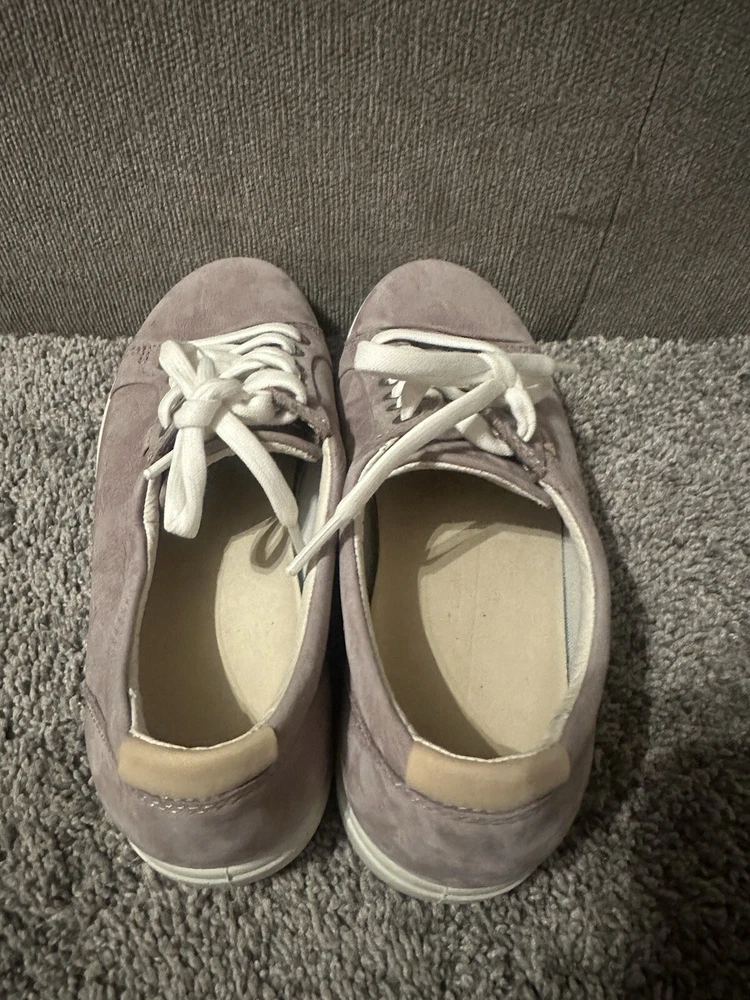 Elevate your athleisure game with these ECCO Women's Lavender Leather Lace Tennis Shoes. The solid pattern and purple color with logo accents add a touch of style to your everyday workout routine. These sneakers are designed with a comfortable cushioned insole and rubber outsole for optimal performance during tennis games or any other athletic activity. The shoes are available in UK size 5.5, US size 7, and EU size 38, with a medium width. The leather upper material and lace-up closure provide a secure fit, while the leather insole ensures added comfort. These sneakers are perfect for women who love to stay active and look great doing it. Preowned Good Condition