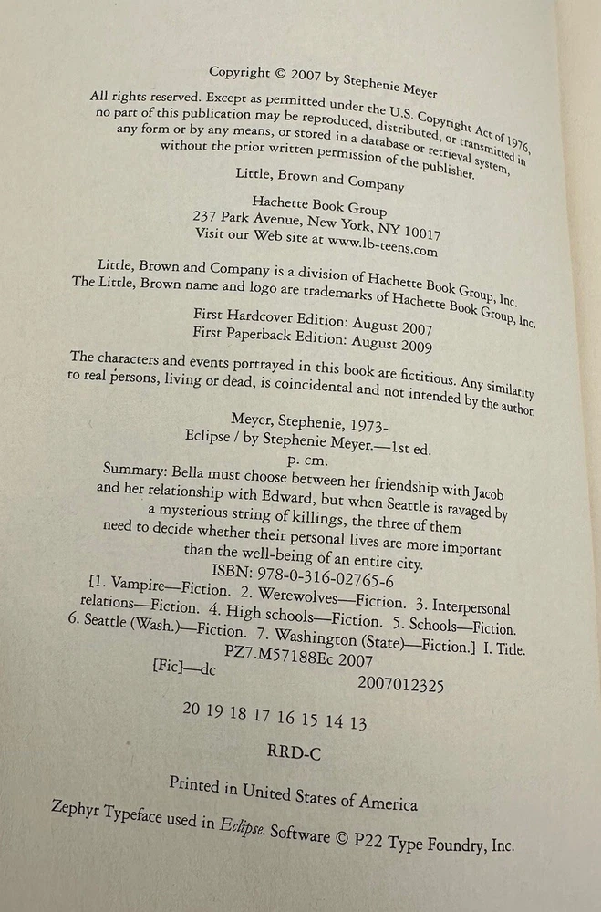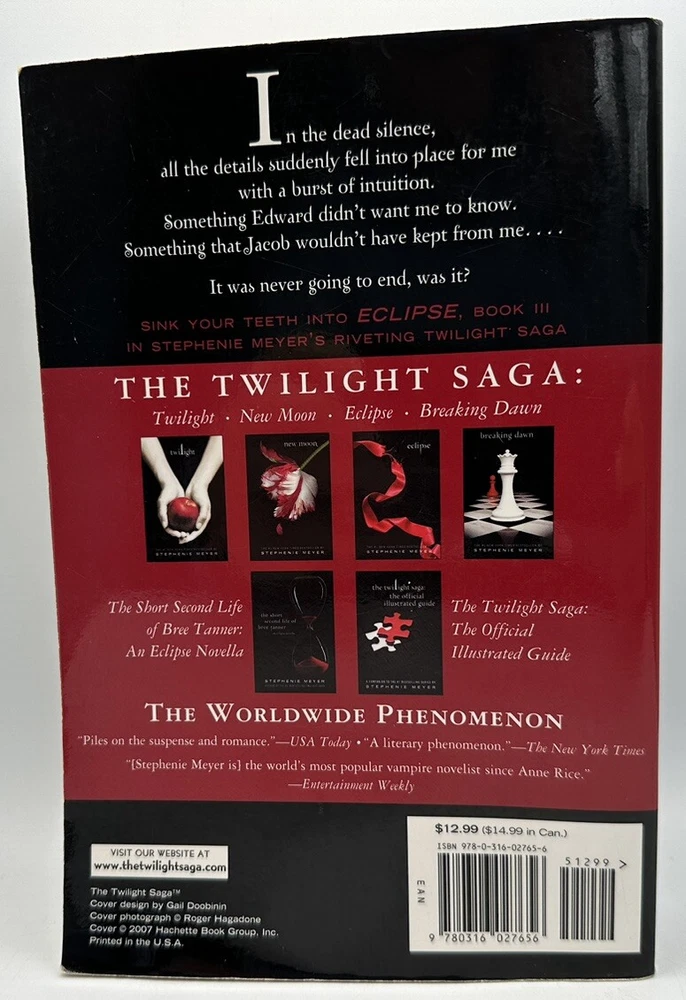 Item Width: 5.5 in Type: Novel Item Height: 1.8 in gtin13: 9780316027656 Narrator: N/A, Emma Thompson Publisher: Little, Brown Books for Young Readers Book Title: Eclipse ISBN: 9780316027656 Genre: Juvenile Fiction, Young Adult Fiction Run Time: N/A Item Length: 8.2 in Item Weight: 19.2 Oz Number of Pages: 640 Pages Topic: Love & Romance, Romance / Paranormal, Paranormal, Occult & Supernatural, School & Education, Vampires, General, People & Places / United States / General Publication Year: 2009 Features: Paperback Author: Stephenie Meyer Format: Trade Paperback Language: English Book Series: The Twilight Saga Ser. Narrative Type: Fiction