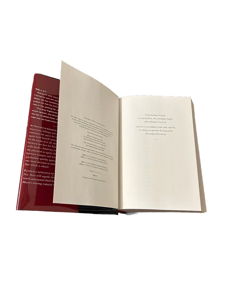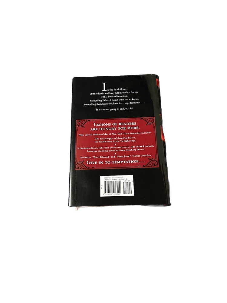 Features: NA Signed: No Item Height: 2 in Item Width: 5.9 in Publisher: Little, Brown Books for Young Readers Item Length: 8.5 in Author: Stephenie Meyer Narrative Type: Fiction Book Title: Eclipse Language: English Intended Audience: Young Adults, Adults Type: Novel Edition: Special Edition Genre: Juvenile Fiction gtin13: 9780316036290 Original Language: English Book Series: Twilight Saga ISBN: 9780316036290 Item Weight: 27.4 Oz Number of Pages: 672 Pages Country/Region of Manufacture: United States Topic: Love & Romance, Horror, School & Education, General, People & Places / United States / General Publication Year: 2008 Format: Hardcover