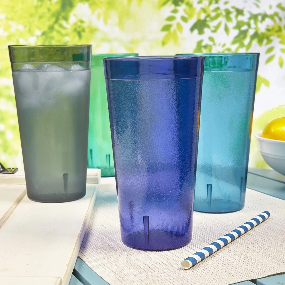 Enjoy everyday drinks with confidence using our American-made stackable tumblers, a set of 12 32-ounce glasses designed for your convenience. Crafted from BPA-free plastic, these cups ensure safety without compromising quality, making them ideal for both indoor and outdoor use. These cups feature a smooth top edge for easy sipping, a classic textured wall design and a lightweight build, our tumblers offer both style and practicality for any occasion. This design will add an updated look to your kitchen aesthetic and easily stacks to save space on cabinet shelves. Say goodbye to worries about breakage with our shatter-resistant tumblers, perfect for parties, family gatherings, and outdoor events. This classic style plastic glass set is a great addition to any college dorm room, first apartment, rv, and camper. Consider adding these as a wedding registry gift for a new household. Stackable and dishwasher safe, these tumblers are designed for easy storage and cleanup, adding convenience to your daily routine. Entertain outdoors at the patio, pool, or hot tub with these durable and shatterproof pieces. The 32oz cup (3.88" diameter x 7.25" tall) in coastal colors (indigo blue, teal, aqua, and grey) is versatile and suitable for any drinkware need. Product Description Elevate Your Drinkware Experience Enjoy the convenience and durability of our American-made plastic tumblers, perfect for everyday use or special occasions. Shatterproof and dishwasher-safe, these versatile glasses are a must-have for any home. Everyday dining made simple with Cafe Tumblers Clear Material and Bold Colors Discover the brilliance of US Acrylic’s Cafe tumblers, made in the USA. Featuring textured walls and a smooth rounded top, these timeless tumblers offer style and stability for any occasion. Enhance your drinkware collection with their premium quality and versatile design. Shatter-Proof and Break Resistant US Acrylic’s Cafe tumblers are made from durable, break-resistant materials that won’t shatter across the room like glass. Perfect for families, outdoor events, and everyday use, they combine lasting quality with peace of mind. Enjoy stylish drinkware for any occasion. Ideal for Outdoor Dining Elevate your outdoor gatherings with US Acrylic's Cafe tumblers, perfect for patio dining and poolside drinks. Crafted for durability, these break-resistant tumblers are ideal for summer barbecues, picnics, and more. Enjoy stylish drinkware designed to handle outdoor fun. Top-Rack Dishwasher Safe US Acrylic's Cafe tumblers are top-rack dishwasher safe for easy cleaning, but for best results, hand washing is recommended. Avoid placing them on the bottom rack, as high heat can compromise their durability. Keep your tumblers crystal clear and long-lasting with proper care. Get to know US Acrylic Over 40 years of experience US Acrylic started as a small family-owned business in Illinois, making small gift items by hand, and supporting other small family-owned gift shops. Today, while we have grown, we still remain family-owned, maintain the same family values, remain in Illinois continuing to support and invest in our community. We proudly make all of our products right here in Libertyville, Illinois and remain committed to offering you quality products Made in USA. The video showcases the product in use. The video guides you through product setup. The video compares multiple products. The video shows the product being unpacked. About US Acrylic Merchant Video Learn about US Acrylic Tumblers Sizes Available Water (20oz), Iced-tea (32oz) Sizes Available Juice (8oz), Rocks (14oz), Water (20oz), Multi-size (14oz/20oz) Sizes Available Rocks (12oz), Water (16oz), Iced-tea (24oz), Multi-size (12oz/16oz) Are they stackable? Yes, easily stackable Are they stackable? Not designed to be stacked Are they stackable? Not designed to be stacked Made in USA? Yes, factory located in Illinois Made in USA? Yes, factory located in Illinois Made in USA? Yes, factory located in Illinois