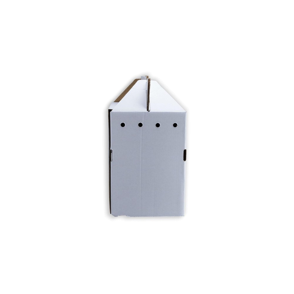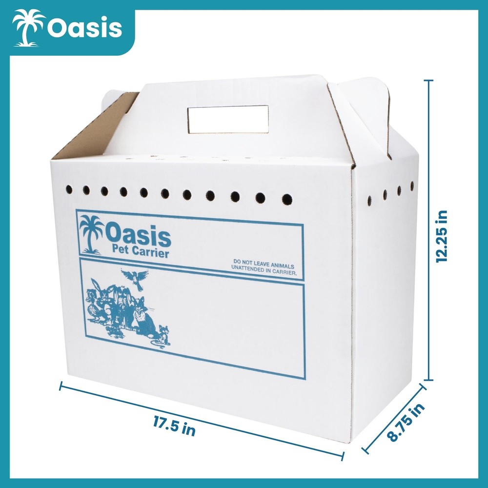 Disposable Cardboard Pet Carrier 12/Case Product Details Color: White Brand: Oasis Product Dimensions: 17.5"L x 8.75"W x 12.25"H Material: Cardboard Special Feature: Durable Is Discontinued By Manufacturer : No Product Dimensions : 17.5 x 8.75 x 12.25 inches; 13.15 Pounds Date First Available : April 15, 2009 Manufacturer : Oasis Best Sellers Rank: #17,642 in Pet Supplies (See Top 100 in Pet Supplies) #38 in Dog Soft-Sided Carriers #38 in Dog Soft-Sided Carriers Customer Reviews: 4.5 4.5 out of 5 stars 635 ratings Special 200 lbs test white cardboard. We use a strong, interlocking bottom to safely and securely carry pets. 20+ lbs capacity. Safe-no staples, strong glued joints, extra ventilation. Our Carrier is made with durable corrugated carboard. Proudly made in USA and recyclable! Approximately 70% post consumer recycled product. Printed warning "Do not leave animal(s) unattended in carrier. Easy assembly instructions on carriers. 17.5"L X 12.25H X 8.75"W 12/Case