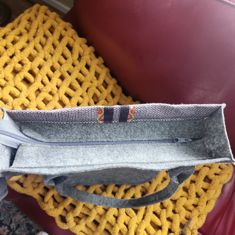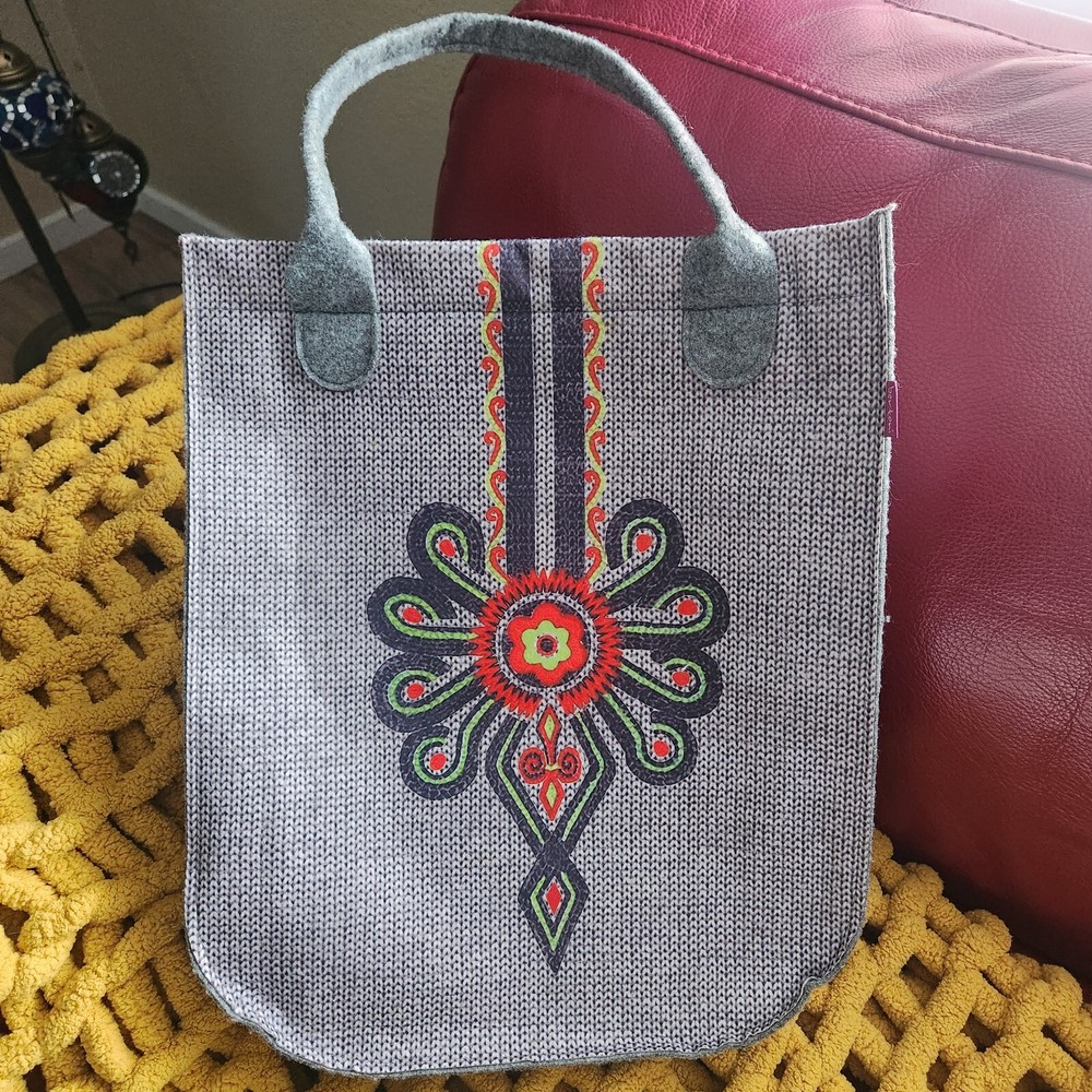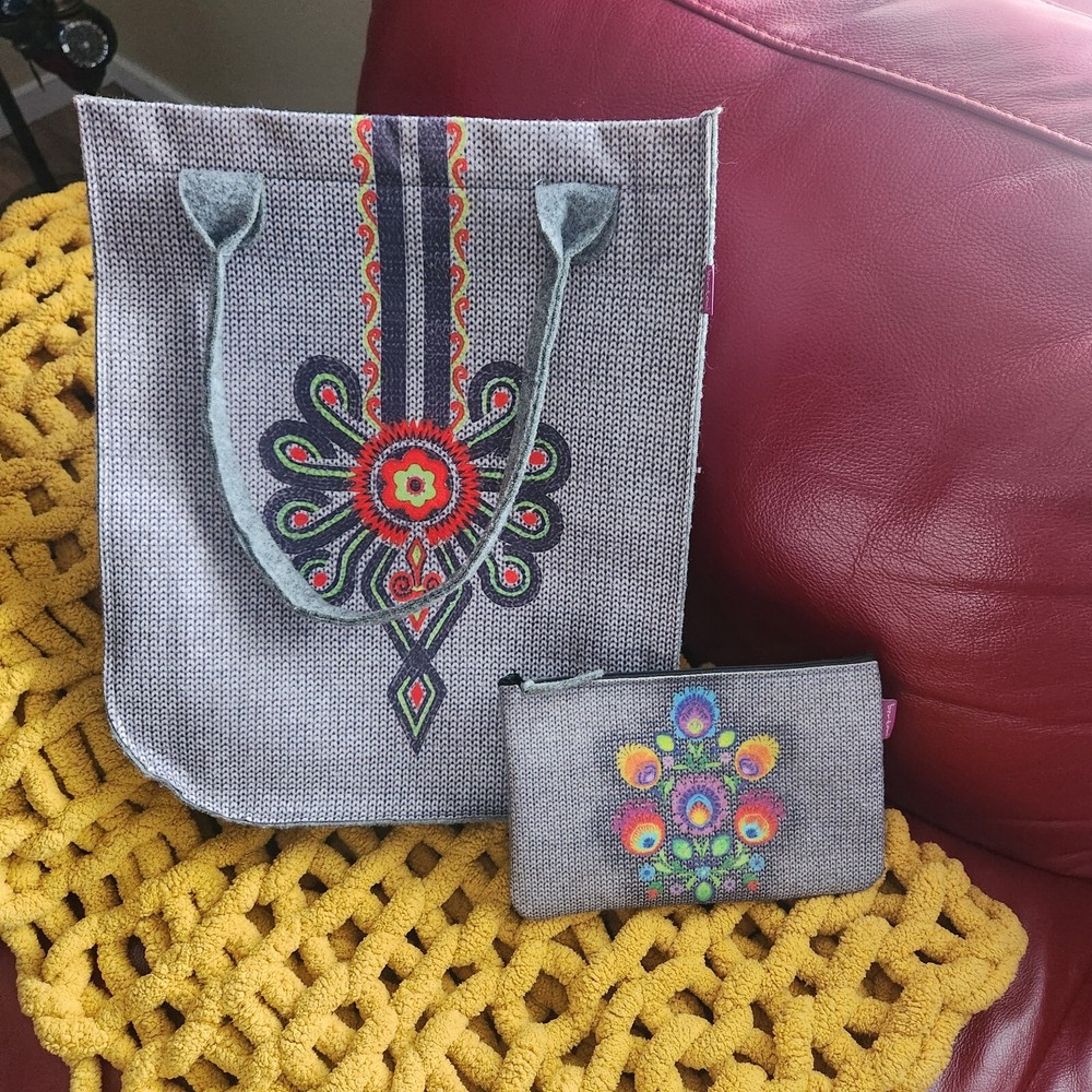 Eco friendly Bertoni felt handbag/ tote with makeup bag/ coin purse. Beautiful floral design with zipper closure. Hamdbag is 16.5 " long x 13.75" wide. With two slip pockets inside. Makeup bag is 6" long x 9.25" wide and also has zipper closure. Durable and water risistant. New without tags. Never used. Excellent condition.