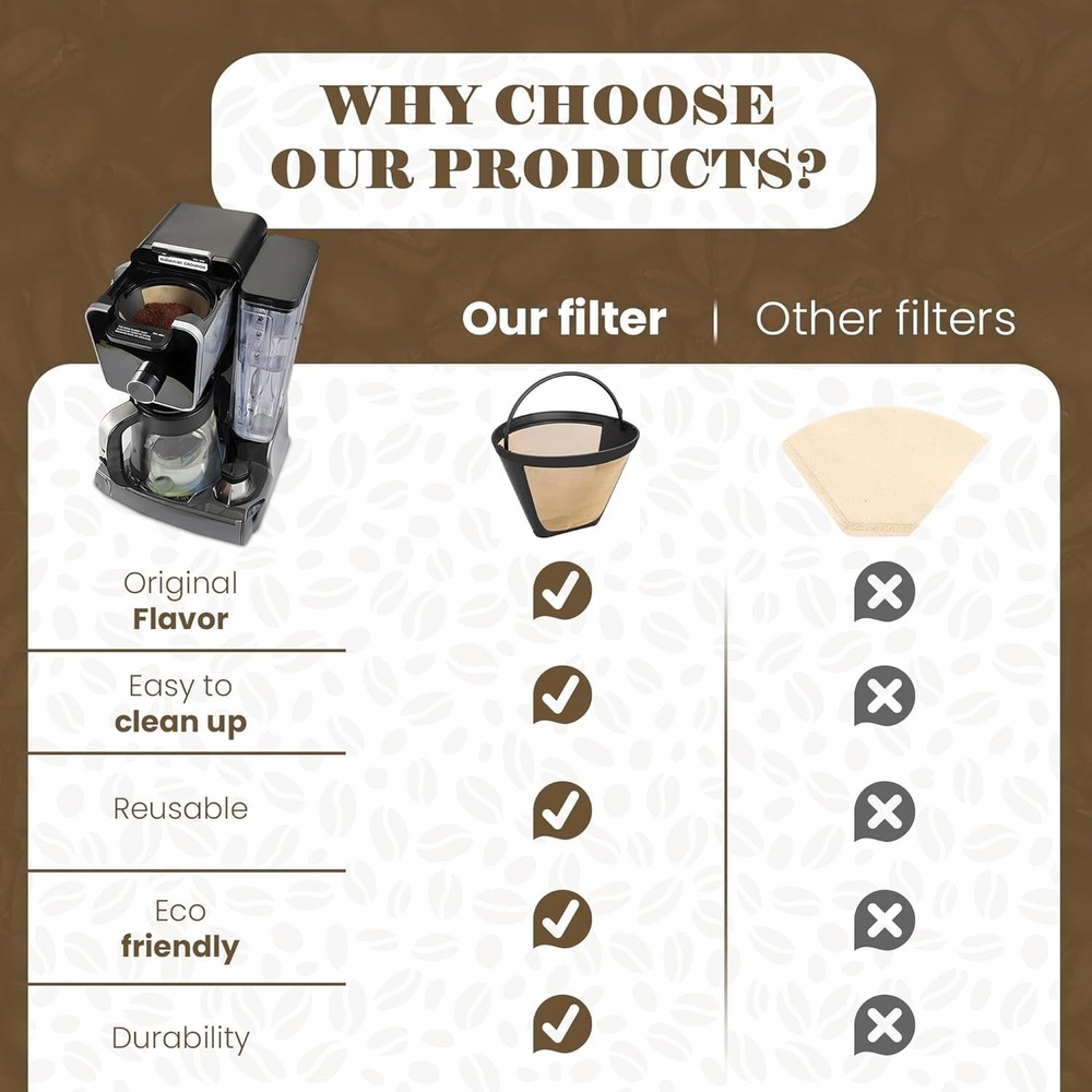 About this item ☕【Elevate Your Coffee Experience】Our coffee filter reusable basket is upgrade to stainless steel, ditching disposable Cuisinart filter replacements and traditional paper. Opt for a luxurious Cuisinart coffee filter basket replacement that transcends the limitations of paper. Indulge in pure coffee flavor every morning with #4 coffee filters, free from any paper taste or waste, you know is what you need for your Cuisinart 14 cup coffee maker or Ninja coffee bar. 🌳【Budget & Eco Friendly 】Embrace sustainability and savings with washable, cuisinart gold tone coffee filter. Make a green choice with cuisinart coffee filter replacement 14 cup that not only reduces waste but also saves you money with just a size 4 coffee filters cone. This gold coffee filter eliminate the need for constant repurchasing – simply wash and reuse for an eco-conscious and cost-effective brewing solution with our cuisinart replacement filter basket. 💧【Effortless Install, Effortless Cleanup】Simplify your coffee routine with easy installation and cleaning for the coffee filters 8-12 cup. Our gold coffee filters are crafted from surgical-grade stainless steel, which makes these cone coffee filter ensure top-notch quality without keeping residue inside your coffee maker, making every brew a satisfying experience. They are dishwasher safe, ensuring a clean and mess-free experience with our cone coffee filters #4 ✔️【Guarantee Compability & Longevity】Our durable, reusable coffee filter basket stand out as the ultimate choice for Cuisinart coffee maker filter replacement, braun coffee filter replacement, Ninja reusable coffee filter, the Cusinart coffee plus 12 cup programmable coffee maker filters and cuisinart 14 cup carafe replacement, perfect for using like such as a ninja coffee filter and others cafe coffee maker. This gold coffee filter basket is the best choice 🤝【Confidence in Every Sip】Rely on our reusable filters backed by our 30-day guarantee. Our steadfast commitment to quality assurance ensures swift resolution of any issues or concerns, supported by seamless communication and comprehensive assistance. 【IMPORTANT】We highly recommend checking the compatibility and size of your coffee maker with our reusable filters before making the purchase.