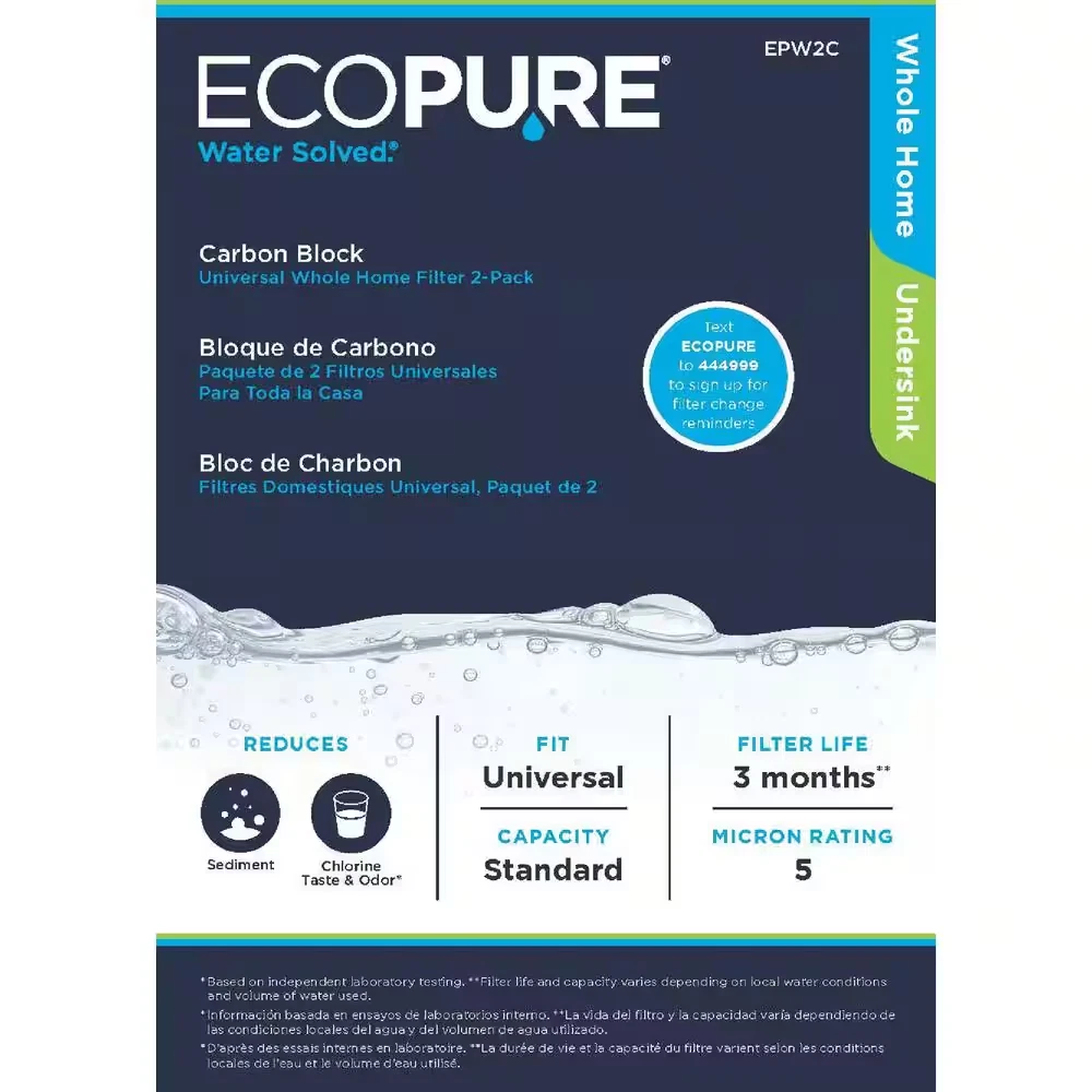 Store New Arrivals Add to Favorite View Feedback Contact EcoPure EPW2C Carbon Whole Home Replacement Water Filter - Universal Fit Description Brand/Model Compatibility Universal Fit - Fits EcoPure models EPW2VC, EPW2 and most standard capacity whole home water filtration systems including: Whirlpool, Omni, Culligan, Watts, Filtrete, 3M, GE, and DuPont Features No additional features Filtration Method Carbon Block Micron/Pore Size 5 Microns Number of filters included 2 Pack Size 2 Product Weight (lb) 1.42 lb Reduces Chlorine Taste,Odor Returnable 90-Day Water Treatment Type Whole House Filter Replacements Manufacturer Warranty N/A Product Depth (in) 2.75 in Product Height (in) 9.75 in Product Width (in) 5.5 in Fits EcoPure models EPW2VC, EPW2, and most major brands Treats water coming from wells and municipal sources Reduces sediments, sand, dirt, and rust down to 5 microns The EcoPure Carbon Block Universal Whole Home Water Filter 2-Pack (EPW2C) delivers cleaner, clearer, better tasting water throughout your home. These water filters are NSF certified to reduce chlorine taste and odor, sediment, sand, silt and rust and last up to 3 months. They fit EcoPure models EPW2VC, EPW2, and most standard capacity whole home water filtration systems including: Whirlpool, Omni, Culligan, Watts, Filtrete, 3M, GE, and DuPont. They are designed for both well and municipal water supplies and have a micron rating of 5. These carbon block filters can be used in place of GAC filters and have many benefits when comparing the two. Carbon block filters offer superior chlorine and particulate reduction, there is minimal black carbon dust, and they eliminate the settling of media ensuring all water is filtered. Text ECOPURE to 444999 to sign up for filter change reminders. Questions, Lifetime tech support available, call the EcoPure helpline at (800) 693-1138 or visit ecopure.com. FIRST LINE OF DEFENSE - Installed on the incoming water line, protect your water-using appliances and plumbing for cleaner, clearer water throughout your entire home UNIVERSAL FIT - Fits EcoPure model EPW2, EPW2VC, EPW2V and all major brands of standard capacity, whole home filtration systems, including Whirlpool, Brita Total 360, Omni, Culligan, Watts, Filtrete, 3M, GE, and DuPont ADVANCED FILTRATION - Reduces contaminants commonly found in drinking water, including chlorine taste & odor, sediment, sand, dirt and rust down to 5 microns 3-MONTH FILTER LIFE - For best filtration results, filters should be replaced every three months, as recommended NSF INTERNATIONAL CERTIFIED - The National Sanitation Foundation (NSF) International has established public safety standards for residential use of filtration systems. The EcoPure Carbon Block Universal Whole Home Water Filter 2-Pack (EPW2C) complies with these standards ABOUT US We offer the best prices around on high quality products. Our E-store includes tools, general home, garden items and more. SHIPPING We are always working hard to ensure your package arrives as soon as possible. Please understand that some factors like weather, high postal traffic, and the performance of shipping companies are outside of our control. We offer free shipping to the lower 48 states and ship within 4 business days of payment, usually sooner. We do not accept P.O. Boxes. Please provide a physical address. RETURNS We offer a 30-Day Return Policy on items which you are not completely satisfied with. You have the option for a full-refund or an exchange of the item. No returns are available on items shipped outside of the USA. PAYMENT We accept PayPal. CONTACT US This page content is yet to come Please ad us to your favorite seller and visit again later Thank You CUSTOMER SATISFACTION We try our very best to make sure every customer is completely satisfied. If there's a problem, message us! We're happy to help. WE ACCEPT Copyright © 2017 AutoDs. | All Rights Reserved
