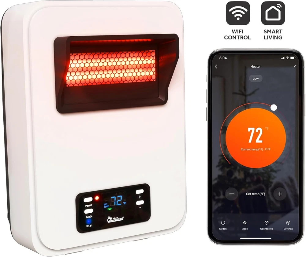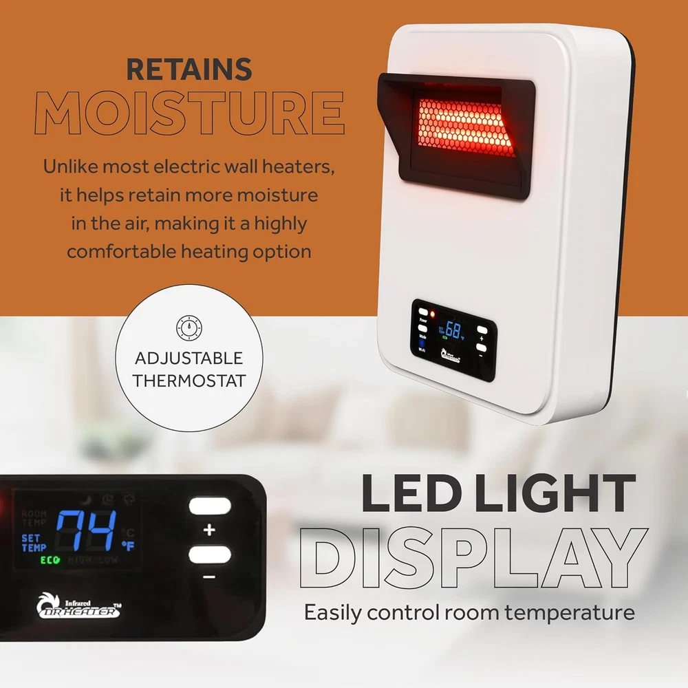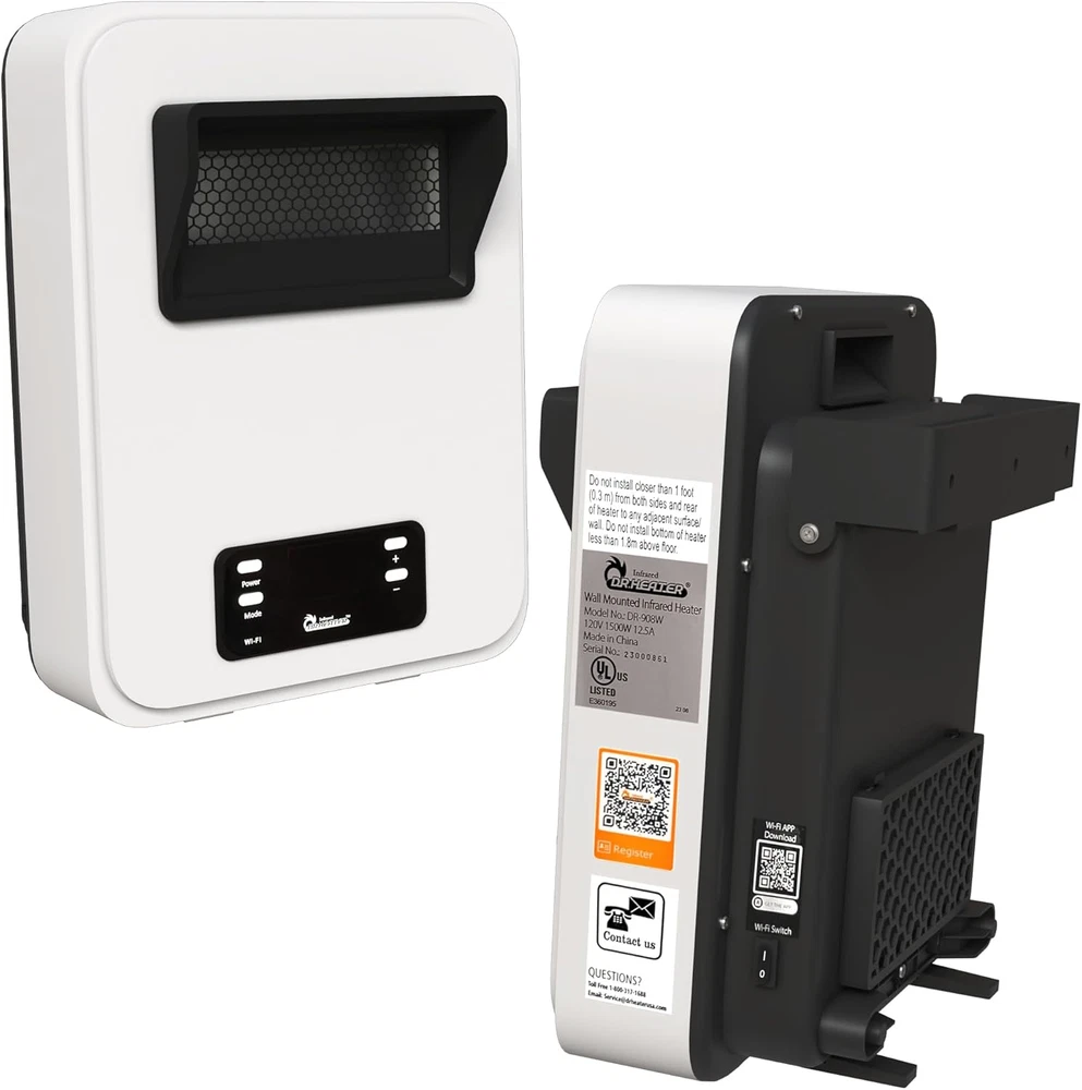 Store New Arrivals Add to Favorite View Feedback Contact Ecoheat Wall Hung or Wall Mounted Electric Space Heater, Dual System with Infrared and Fan Forced, Remote Control, 1500W, White Description Item model number DR-908W Warranty Description 1-Year Limited Component Warranty Assembly required No Country of Origin China Style With WiFi Max Temperature Setting 86 Degrees Fahrenheit Min Temperature Setting 50 Degrees Fahrenheit Room Type Kids Room, Living Room, Bedroom, Home Office, Dining Room Batteries required Yes Burner type Radiant Heating Coverage [EO] 150-200 square feet Form Factor With WiFi Included Components Heater, Remote Control, User Manual Indoor/Outdoor Usage Indoor Number of Speeds 3 Item Weight 85 Pounds Heat Output 1500 Watts Item Weight 8.5 pounds Special Feature On Off Timer, Remote Control, Overheat Protection, Wi Fi Enabled, Tip-Over Protection Amperage 12.5 Amps Mounting Type Wall Mount Color White Power Source Corded Electric Heating Method Radiant Fuel Type Electric Voltage 120 Volts Recommended Uses For Product Office, Home Product Dimensions 6.5"D x 11.25"W x 15.25"H Number of pieces 1 INSTANT WARMTH AND COMFORT - Exclusive Dual Heating System provides instant warmth using a quartz infrared element and fast heat distribution with the state-of-the-art blower. Our quiet and high-pressure blower can efficiently heat up a large room. The powerful 1500 watts of power or 5200 BTU controlled by Dr. Heater ECO operation mode will quickly take the chill out and save money on your electric bill. Three heat settings, ECO, HIGH, and LOW. WALL MOUNTED OR FREESTANDING - The heater can be mounted elegantly on the wall with the easy hung system, unlike traditional baseboard heaters that a bulky and requires professional installation. Dr. Heater's unique design wall heater can be converted to a portable heater without any tools. The 2-way Infrared Space Heater from Dr. Infrared Heater – a sleek, versatile, and advanced technology-driven infrared heater designed to bring warmth to any living room, bedroom, or small to medium-sized area. The powerful yet compact design is perfect for maximizing limited space with a wall-mounting option that seamlessly integrates into any room aesthetics without sacrificing floor space. FEATURES & BENEFITS: 120v Plug-In Wall Heater Slim and Compact Wall Mounting Adjustable Thermostat 50-86°F 12-Hour Timer Automatic Shutoff Overheat Protection Saves Energy on Night Mode 3 Heat Settings – ECO, High, Low UL Certified Compatible with WIFI and Smart Living App Includes Battery-Operated Remote Control (batteries included) COST-EFFECTIVE HEATING FOR HOUSEHOLDS & RV’s More than an appliance, this 2-in-1 PCT and quartz-based infrared heater works by heating surfaces and objects, rather than air. The high-velocity quite blower distributes heat quickly and evenly throughout the area while retaining more moisture in the air. From chilly bedrooms without a heat source, to campers in the cold Northern fall, this unit will maintain steady temperatures via one of 3 settings: ECO, High, or Low. PEACE OF MIND SAFETY FEATURES This plug-in heater is safe, secure, and UL certified, automatically turning off if tipped over, making it suitable for homes with children and pets. Designed with a cool-to-the-touch exterior and overheat protection, which stays active even after shutdown. At 120v, it delivers more heat than traditional 1500 watt heaters, allowing adjustable thermostat settings between 50-86°F with a 12-hour timer. Night Mode light sensing technology runs less frequently to save energy while you sleep. MODERN SMART HOME INTEGRATION Integrate with modern smart home networks via WIFI and the Smart Living app to monitor and control heat remotely. ABOUT US We offer the best prices around on high quality products. Our E-store includes media such as books, movies, music and games while offering electronics, toys, sporting apparel, clothing, tools, general home, garden items and more. SHIPPING We are always working hard to ensure your package arrives as soon as possible. Please understand that some factors like weather, high postal traffic, and the performance of shipping companies are outside of our control. We offer free shipping to the lower 48 states and ship within 2 business days of payment, usually sooner. We do not accept P.O. Boxes. Please provide a physical address. For shipping outside of the continental USA, we only use eBay's Global Shipping Program.The item is shipped to KY and then sent to the rest of the world. International customers are responsible for all duties and taxes. Continue to check out in order to calculate costs for shipping the item to your country. Messages regarding eBay's Global Shipping Program MUST be directed at eBay EXCLUSIVELY. RETURNS We offer a 30-Day Return Policy on items which you are not completely satisfied with. You have the option for a full-refund or an exchange of the item. No returns are available on items shipped outside of the USA. PAYMENT We accept PayPal. CONTACT US This page content is yet to come Please ad us to your favorite seller and visit again later Thank You CUSTOMER SATISFACTION We try our very best to make sure every customer is completely satisfied. If there's a problem, message us! We're happy to help. WE ACCEPT Copyright © 2021 AutoDS. | All Rights Reserved