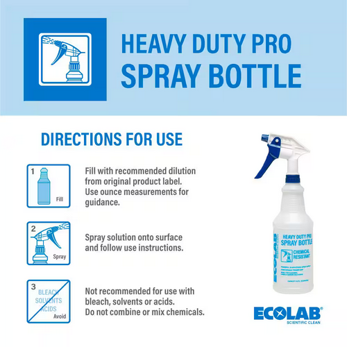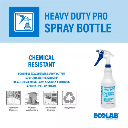 Birkenstar Ecolab Heavy Duty Pro Spray Bottle 32 Oz – Chemical Resistant High-Output Sprayer Product Discription: Ecolab Heavy Duty Pro Spray Bottle 32 Oz – Chemical Resistant High-Output Sprayer The Ecolab Heavy Duty Pro Spray Bottle is built for tough cleaning tasks, offering a chemical-resistant design and a high-output sprayer to make your cleaning more efficient. Perfect for commercial or industrial use, this durable spray bottle helps you tackle even the most demanding environments with ease. Product Features: 32 Oz. Capacity: Generous size for extended use, reducing the need for frequent refills. Chemical Resistant: Built to withstand harsh chemicals without degrading or leaking. High-Output Sprayer: Delivers a strong and consistent spray for efficient coverage and faster cleaning. Durable Construction: Made with heavy-duty materials for long-lasting performance in demanding environments. Ergonomic Design: Comfortable grip and easy-to-use sprayer for effortless operation. Versatile Use: Ideal for cleaning solutions, disinfectants, degreasers, and other chemicals. Clear Measurement Marks: Easy-to-read markings for accurate filling and mixing. A must-have tool for professional cleaners, janitors, or anyone requiring a robust, reliable spray bottle for tough jobs! Payment Policy We accept all payment methods. Pay as soon as possible after winning the auction, so we can ship your item sooner. Return Policy The product can be returned within the 30 days of purchase if the customer is not satisfied.The product must be returned in the original packing and customer will pay for return shipping. Shipping Policy We offer FREE shipping on all orders.The Item is usually shipped within 1-3 bussines days or sooner after the payment is received and is delivered within in 3-6 bussines days or sooner after the shipment. In any case, if the item is lost or there is an uncertain delay in the delivery by shipping carrier we request you to contact us, so we can help you out with a refund or replacement. Feedback Customer satisfaction is our first priority.We always strive to create a positive customer experience. If you have any concern, please contact us.We will do our best to solve your problem as soon as possible. Birkenstar