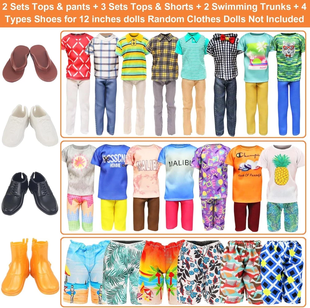 Ecore Fun 11 Items 11.5 Inch Boy Doll Clothes and Shoes - 5 Sets Fashion Casual Wear Clothes Outfit 2 Swimwear 4 Pairs Shoes for 12 inch boy Doll Random Styles Product Details Product Dimensions: 6 x 2 x 9 inches Item Weight: 2.89 ounces Country of Origin: China Manufacturer recommended age: 3 years and up Manufacturer: Ecore Fun Valued Pack: Package Includes 3 Sets Shorts and Tops, 2 Sets Pants and Tops, 2 Swimming Trunks, 4 Pairs Shoes.(Random Styles and NO DOLL!) Perfect Fit: It is an excellent outfit for 12 inch boy dolls, and different styles of clothing make your child's doll look cool. Novelty clothes and accessories: A variety of different Clothes and accessories make novelty for kid, children can dress up dolls according to their preferences enrich their imagination. Safe Material & Precision Stitching: The materials we used have passed European CE Certification, so that they can ensure children’s safety, and the doll case is sewn with care to built last. Safe and non-toxic materials ensure the health of children. Excellent Gift: Give these outfits for Christmas, birthday, Children's Day, Valentine’s Day and other special occasions. Perfect as a Xmas gift, Birthday gift, New Year gift, party favor and other holiday gift. Kids' laugh and happiness are our passion to move ahead!