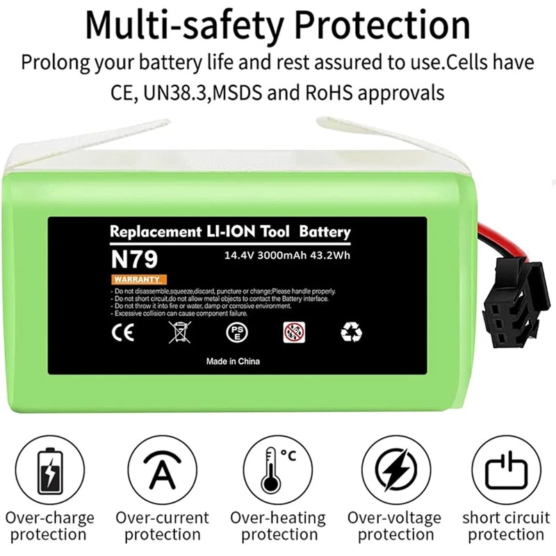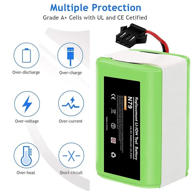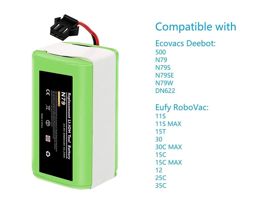 Product Description About this item Lithium-ion šŸŒ³ć€Battery Type怑Battery type: Li-ion battery,Voltage: 14.4V, Capacity: Upgraded 3000mAh(No Fake High Label Capacity). No memory effect, no pollution, and low self-discharge, can be charged or discharged as needed without loss of capacity. 100% compatible with original charger. šŸŒ³ć€Compatibility怑Compatible with Ecovacs Deebot N79S, Deebot N79, Deebot DN622, Eufy RoboVac 11, RoboVac 11S, RoboVac 11S MAX, RoboVac 12, RoboVac 15T, RoboVac 15C, RoboVac 15C MAX, RoboVac 30, RoboVac 30 MAX, RoboVac 30C, RoboVac 35C, G10 Hybrid, G30, G30 Edge, G30 Hybrid, G30 Verge. See more compatible model in description. šŸŒ³ć€600+ Recharge Cycles怑POWTREE 3.0Ah Ecovcas battery replacement can be recharged up to 600+ cycles of use. No memory effect, low self-discharge rate and long-lasting battery life šŸŒ³ć€High Quality怑Battery uses the highest quality cells, safe with rapid-charge technology while providing overcharge and over discharge multiple protection to increase the life of the battery. Reliable safeguard features with the protection for short-circuit, output over-voltage, over-heat and output over-current. Perfect Battery Management System, high-end protection IC. Power Battery to support max. 8A discharge. Compatible with Ecovacs N79S, 500, N79, N79SE, N79W, DN622, DN622.11 Robot Vacuum Cleaners. 14.4V 3000mAh Li-ion rechargeable replacement battery makes vacuum lasting around 100 minutes per charge. Easy to install, local sale support, 24/7 response to online messages, 12 months warranty. Futures : 3000mAh High Capacity Battery Li-ion Rechargeable battery, convenient to use. And it has no memory effect. Can be charged or discharged as needed without loss of capacity. Same size & function as original battery, don't worry damaging your robot. Quick charge and easy to install. ISO9001, RoHS, and CE certified NO FAKE HIGH "LABEL" CAPACITY High Performance Li-ion Battery with 600+ Recharge Cycles With 3000mAh capacity, the battery can last 120-180 minutes after being fully charged (Depending on use & setting), like the original. Built-in multiple protections against overload, overvoltage, overcurrent, short circuit and internal overheating, ensure effective and safe cleaning in your home. Imported high density lithium battery, higher cost, better performance, more durable(can be recharged 600+ cycles) Compatible With:(use"Ctrl+F" to find your own PN & Model) Compatible for Deebot Series: Ecovacs Deebot N79, Deebot N79S, Deebot 600, Deebot 601, Deebot DN622, Deebot 661 Compatible for RoboVac Series:Eufy RoboVac 11 (T2102), RoboVac 11S (T2108), 11S MAX (T2126), RoboVac 12, 15T, 15C (T2120), 15C MAX, 25C Max, 30, 30C, 30 MAX, 35C, G10 Hybrid, G30, G30 Edge, G30 Hybrid, G30 Verge Compatible for :for Conga 990, Tesvor x500 NOT Compatible with: NOT for Eufy RoboVac 11+, iLife A4/A4S/A4S pro/A6/A9/V7/V7S/V7S pro Compatible Models For Eufy RoboVac 11, RoboVac 11S, RoboVac 11S MAX For Eufy RoboVac 12, RoboVac 15C, RoboVac 15C MAX, RoboVac 15T For Eufy RoboVac 30, RoboVac 30C, RoboVac 30 MAX, RoboVac 35C For Ecovacs Deebot N79,Ecovacs Deebot N79S,Ecovacs Deebot DN622 Ecovacs Deebot N79, Deebot N79S, Deebot DN622, Deebot DN621, Eufy RoboVac 11, RoboVac 11S, RoboVac 11S MAX, RoboVac 15T, RoboVac 30, RoboVac 30C Max, RoboVac 15C, RoboVac 15C MAX, RoboVac 12, RoboVac 35C. For Eufy RoboVac 11, RoboVac 11S, RoboVac 11S MAX For Eufy RoboVac 12, RoboVac 15C, RoboVac 15C MAX, RoboVac 15T For Eufy RoboVac 30, RoboVac 30C, RoboVac 30 MAX, RoboVac 35C For Ecovacs Deebot N79,Ecovacs Deebot N79S,Ecovacs Deebot DN622 For Eufy RoboVac 11, RoboVac 11S, RoboVac 11S MAX For Eufy RoboVac 12, RoboVac 15C, RoboVac 15C MAX, RoboVac 15T For Eufy RoboVac 30, RoboVac 30C, RoboVac 30 MAX, RoboVac 35C For Ecovacs Deebot N79S, 500, N79, N79SE, N79W, DN622, DN622 About Us Welcome to our store! We are a professional worldwide wholesale company. High product quality, reasonable prices, excellent customer service and a reliable credit standing is our tenet.If you like our products, please add my eBay shop to your "My Favorites" list. All the products we are selling include factory warranty , don’t cover items that have been abused, burned and damaged in any form. Payment We accpet payment via PayPal , E-wallet , some Credit Card , Direct Debit and Other specific payment methods. Import duties,taxes and charge are not included in the item's price or shipping cost.These charges are the buyer's responsibility. Please check with your country's customs office to determine what these additional costs will be prior to bidding or buying. Insurance is included in the Shipping & Handling costs paid. Shipping Items are generally shipped out in 1-3 business day after your payment has been cleared (Sat. & Sun. excluded.) Orders from the United States Warehouse will be shipped out via USPS or UPS. The shipment usually takes 3-7 business days(Saturday and Sunday excluded), if you need the item urgently, please contact us for detail before purchasing. Local pick up is not available. Orders from China will be shipped via Belgian Post or Post NL.The shipment will take 15-35 working days,please contact us if you didn't get the parcel for a long time. We do not ship to APO, FPO, Alaska, Hawaii and Puerto Rico addresses, and we are unable to ship to PO BOX for this item. Please provide your psychical address. Returns You have 60 days to return it from the date it was received. All returned items must be in the original package and you must provide us with the shipping tracking number,specific reason for the return and your ebay ID. We will refund your full winning bid amount , upon receipt of the item in its original condition and package with all components and accessories included. Contact Us Dear buyers,we appreciate your business, if you are satisfied with our service , please leave us a Positive feedback and rate the details of the transaction (Detailed Seller Rati