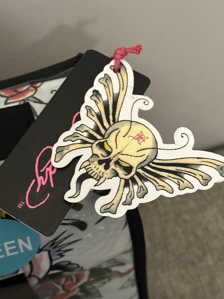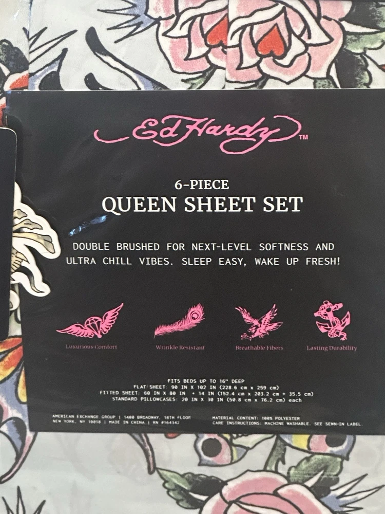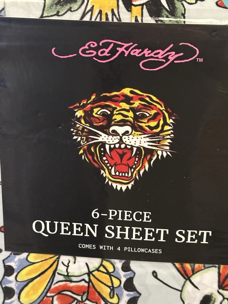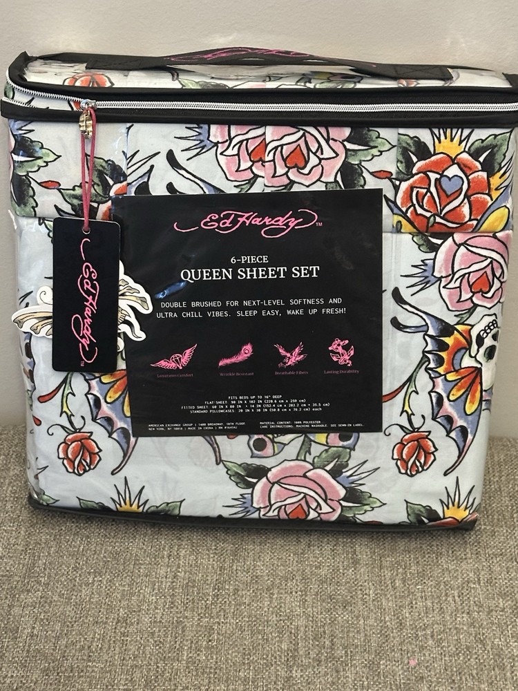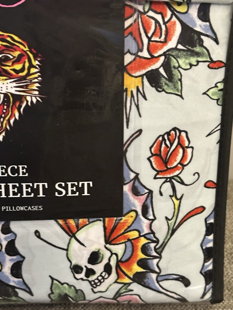 The Ed Hardy 6 Piece Sheet Set in Queen size features a bold pattern of skull roses in vibrant multi-colors, adding a touch of darkness and edginess to your bedroom decor. Made from polyester, these sheets are adorned with the iconic Ed Hardy brand and are designed for easy care with machine wash instructions. The set includes a fitted sheet, flat sheet, and four pillowcases, all featuring the theme of skeletons and skulls, perfect for those who appreciate a unique and stylish look in their bedroom.