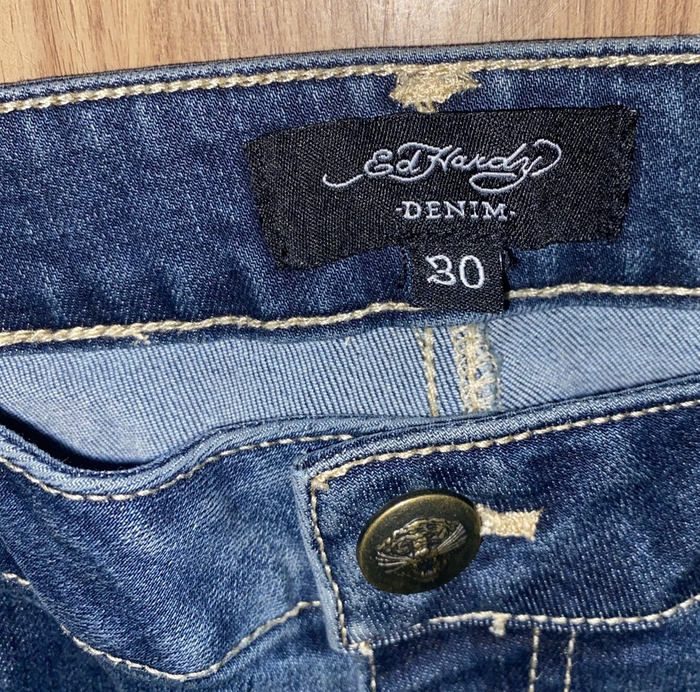 Ed Hardy Jeans Adult 30 Blue Denim New York City Eagle Embroidered Mens. These Ed Hardy jeans are perfect for any man who loves to show off his unique style. The bold embroidery of the New York City Eagle on the back of the jeans makes them a statement piece. The wide-leg style and denim fabric make them comfortable and versatile for any occasion. These jeans are perfect for a casual day out or a night on the town. The regular size type and 32-inch inseam ensure a great fit for any man. Add these jeans to your wardrobe and show off your love for Ed Hardy and New York City. Sold as is in pictures 30/32