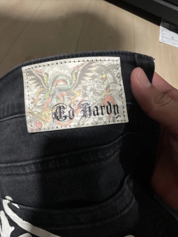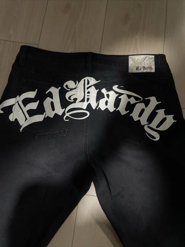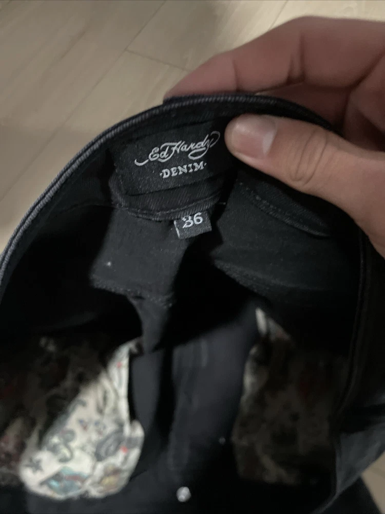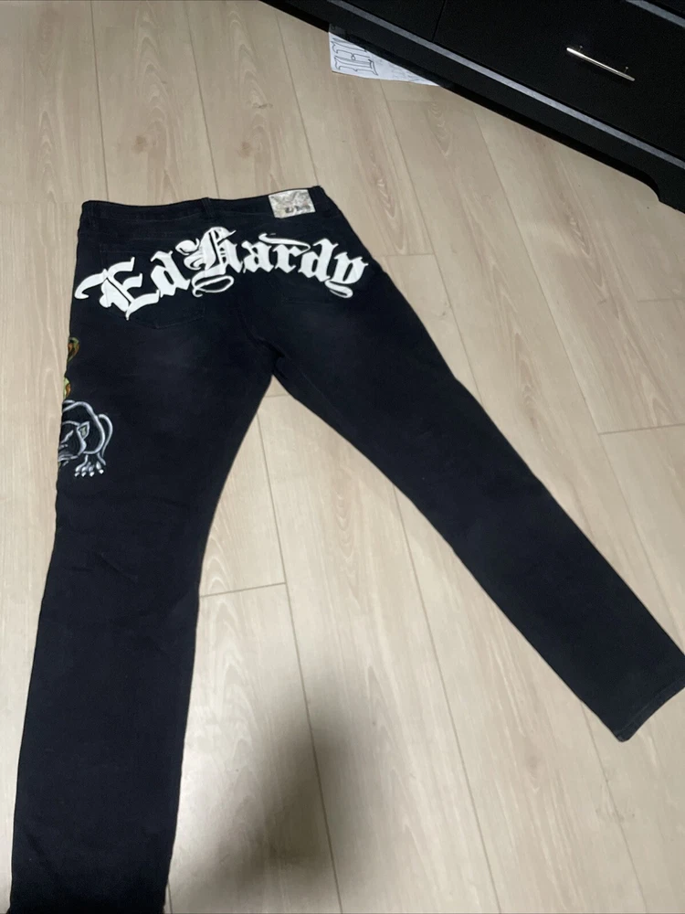 Rise: Mid (10-12 in) Fabric Type: Denim Material: Cotton, Polyester, Spandex, Other Fibers Type: Jeans Theme: Skull, Snakes Fit: Slim Pocket Type: 5-Pocket Design Personalize: No Fabric Wash: Dark Features: Pockets, Slimming, Stretch Waist Size: Diplayed size + 1 inch Color: Black Closure: Button, Zip Garment Care: Machine Washable Size Type: Regular Accents: Embroidered Handmade: No Pattern: Solid Inseam: 32 in Style: Tapered Department: Men Size: 36 Season: Fall, Spring, Winter Brand: Ed Hardy Vintage: No