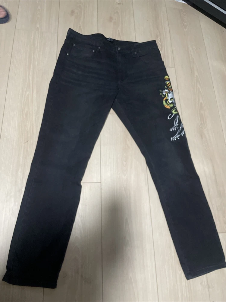 Ed Hardy Jeans Denim 5 Pocket Embroidered Skull Snake Panther Black Stretch Slim