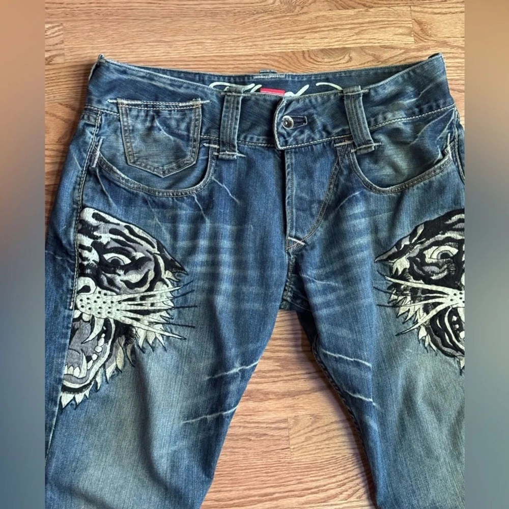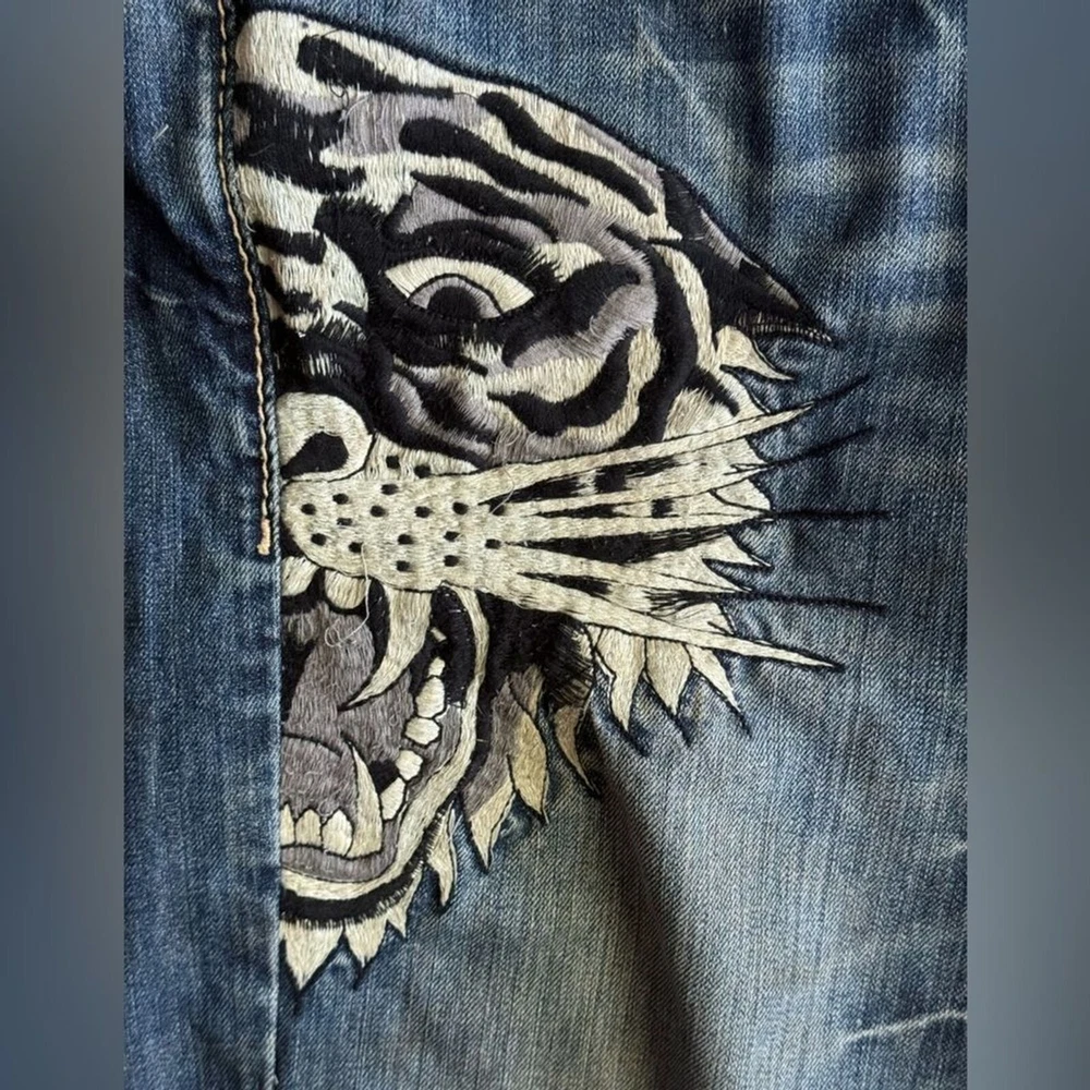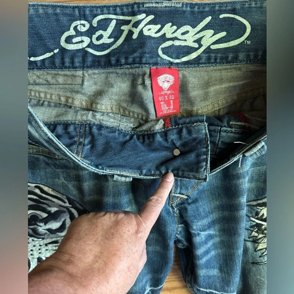 Ed Hardy Jeans Men’s Size 40 X 32 Button Fly Embroidered Tiger Y2K Vintage Super cool vintage Ed Hardy jeans with distinctive tiger embroidery on the sides. Embroidery has some loose threads from wash and wear and have some raggedness at the bottom hem. These jeans have been washed to ensure they arrive in your home fresh and clean. I consider serious reasonable offers. This item ships from the Midwest.