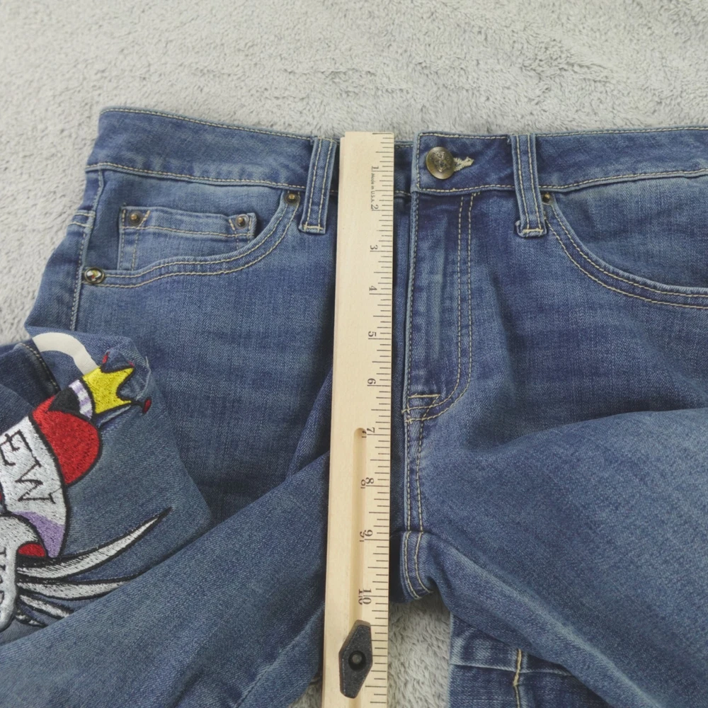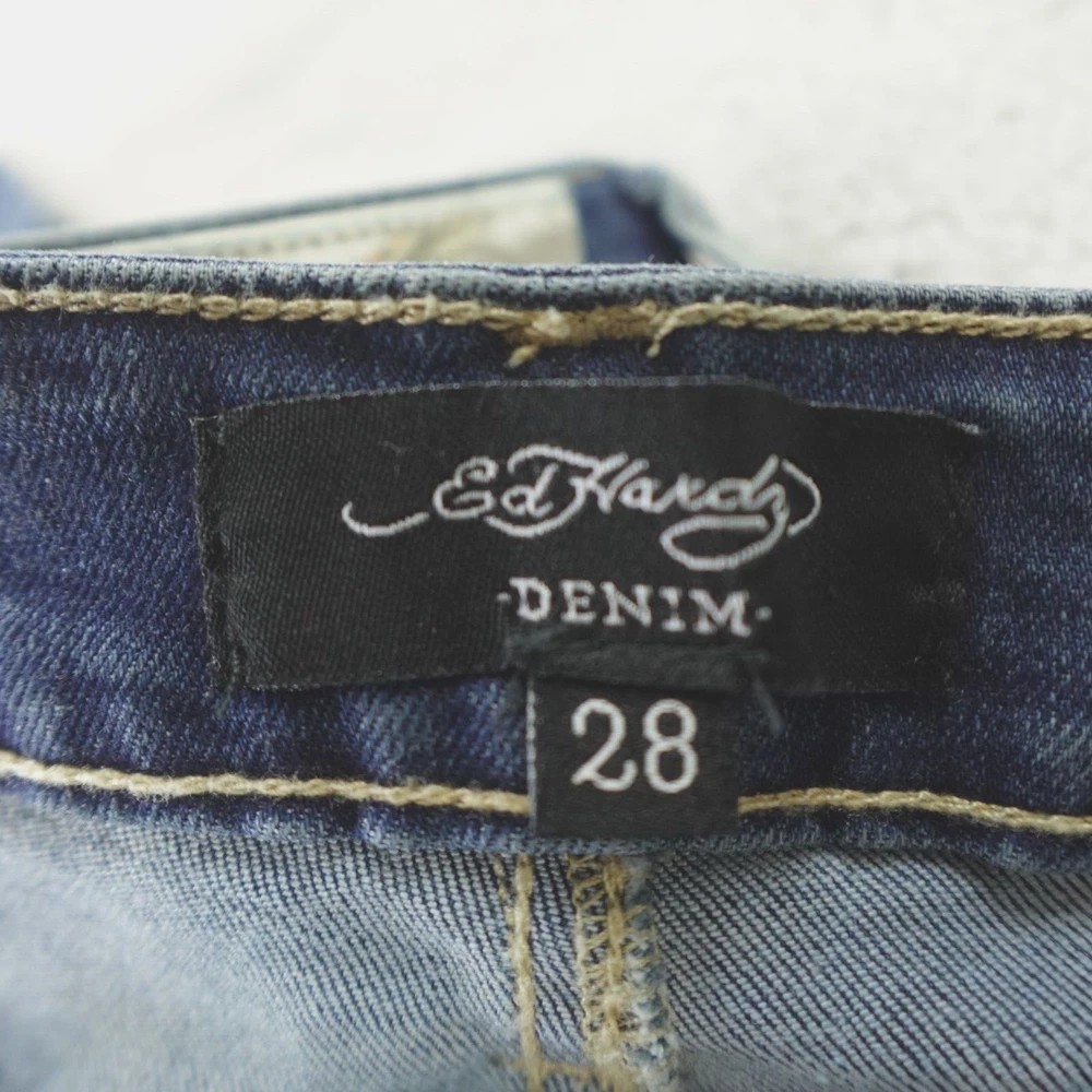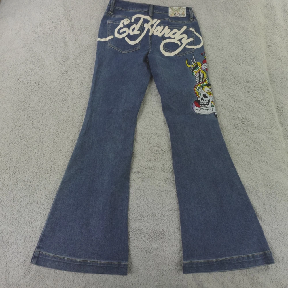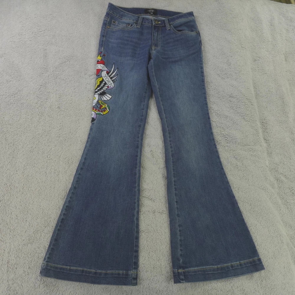 Fabric Wash: Medium Inseam: 32 in Brand: Ed Hardy Pattern: Solid Department: Women Rise: Mid (8.5-10.5 in) Style: Flared Size: 28 Size Type: Regular Fabric Type: Denim Color: Blue Accents: Embroidered Waist Size: 30 in Type: Jeans
