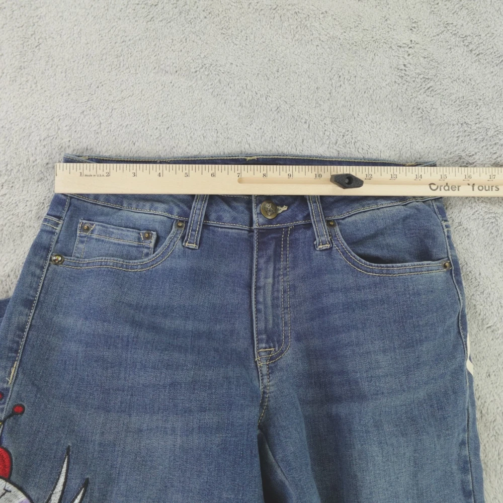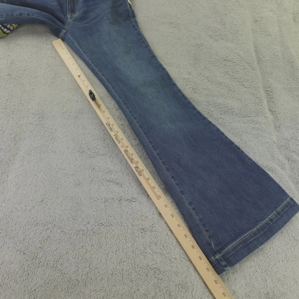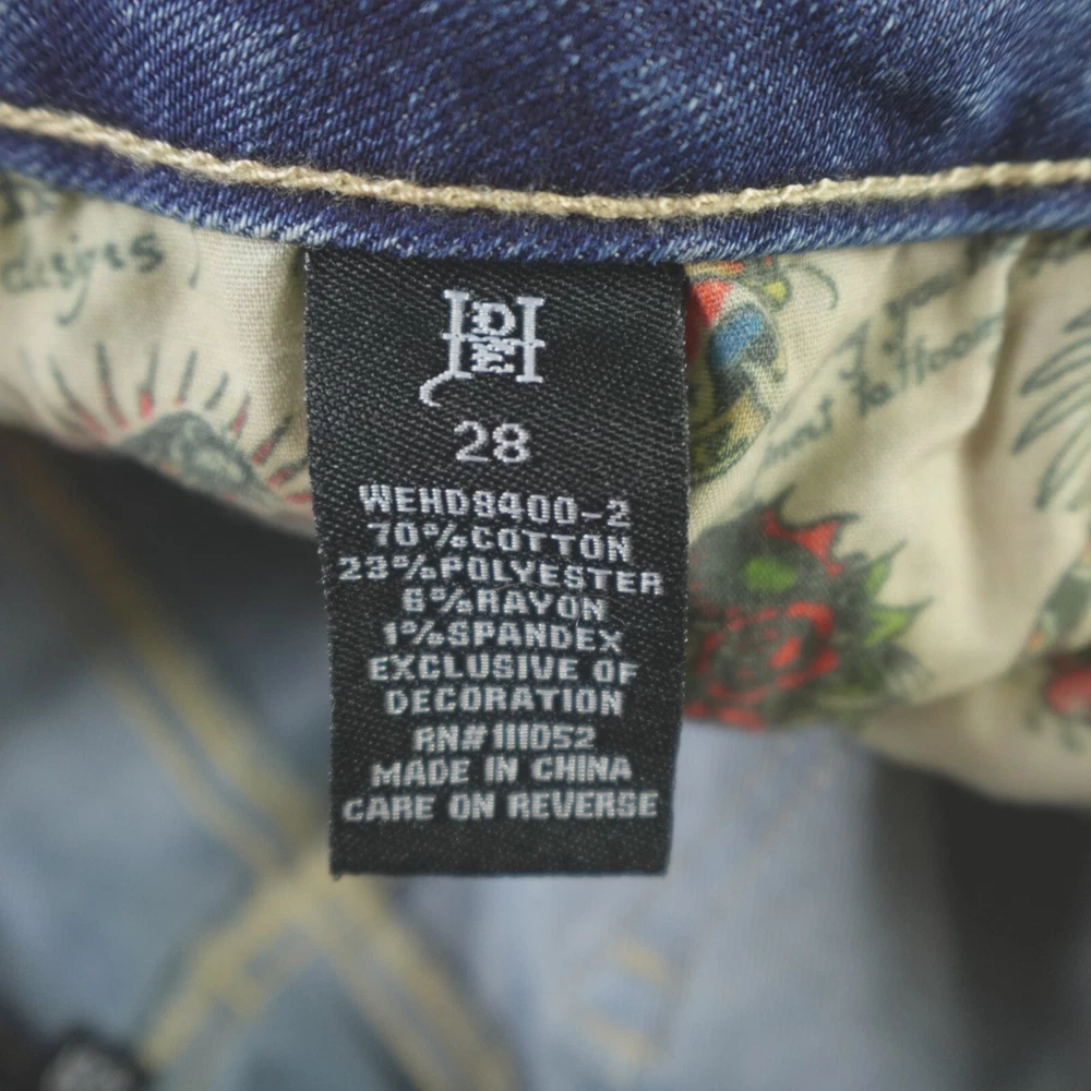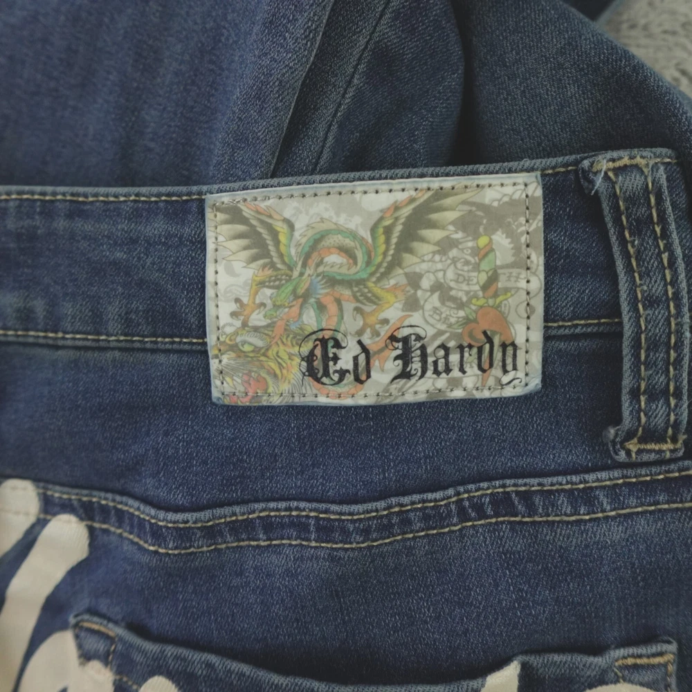 Fabric Wash: Medium Inseam: 32 in Brand: Ed Hardy Pattern: Solid Department: Women Rise: Mid (8.5-10.5 in) Style: Flared Size: 28 Size Type: Regular Fabric Type: Denim Color: Blue Accents: Embroidered Waist Size: 30 in Type: Jeans