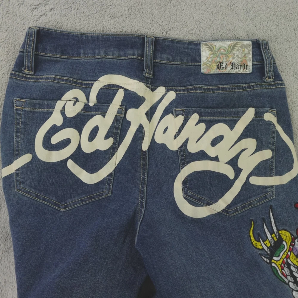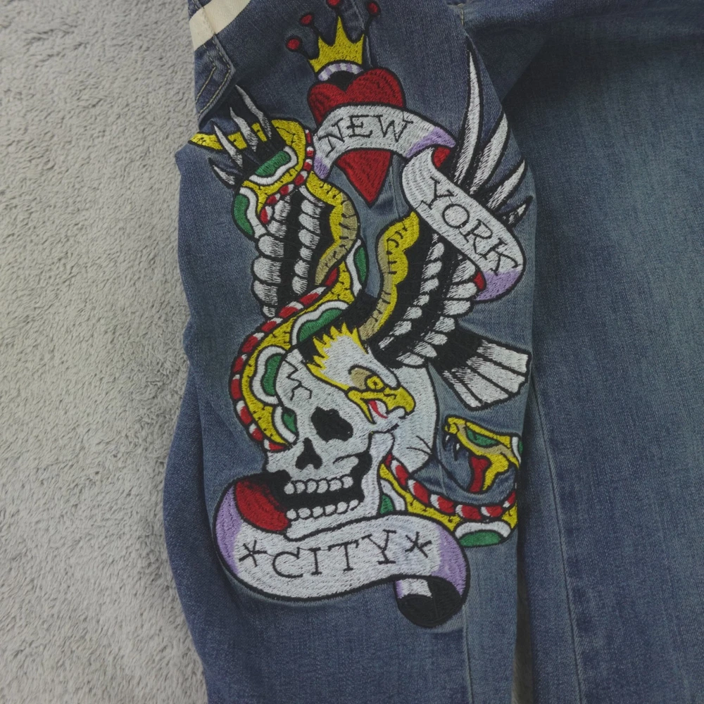 Ed Hardy Jeans Womens 28 Embroidered Spell Out Y2K Flare New York City NYC. Jeans are in excellent, like new, pre-owned condition, no stains, tears, or signs of wear noted, please review all photos. See photos for measurements. If we missed something, don't worry, we offer free returns. Just indicate, "just didn't like it," for any reason, and we'll pay for the return. Thanks for visiting!