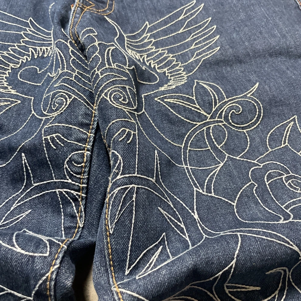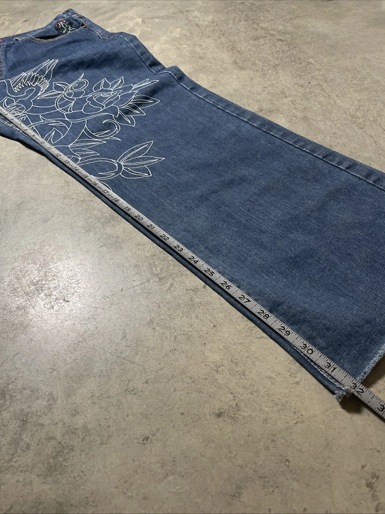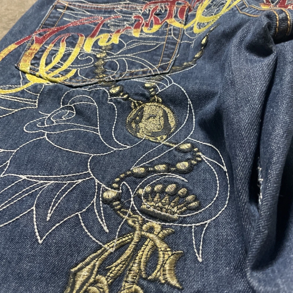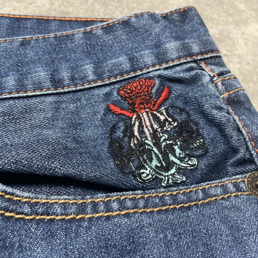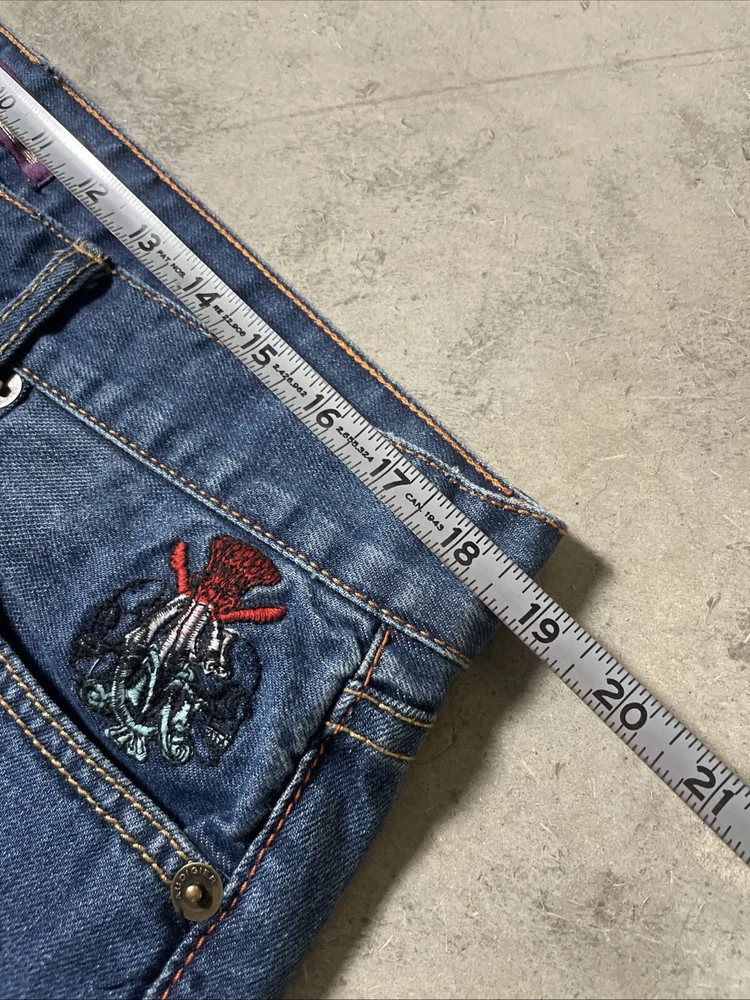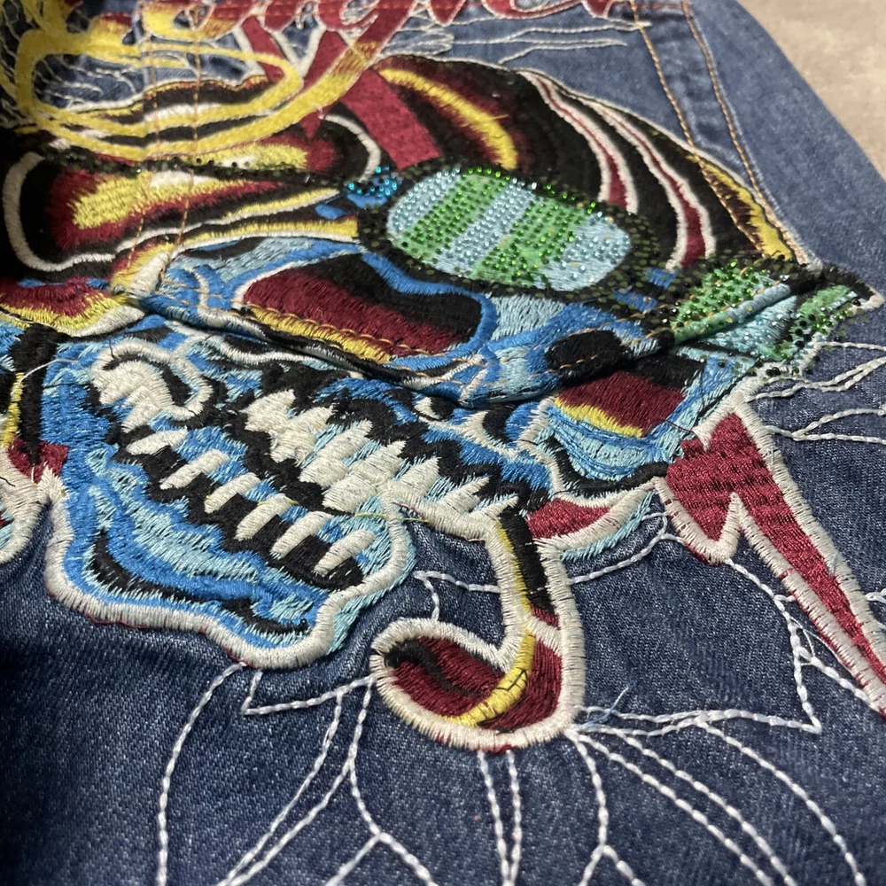 Christian Audigier Denim Ed Hardy Graphic Embroidered Skulls Jeans Navy Size 38 Please refer to photos for all flaws, measurements and details