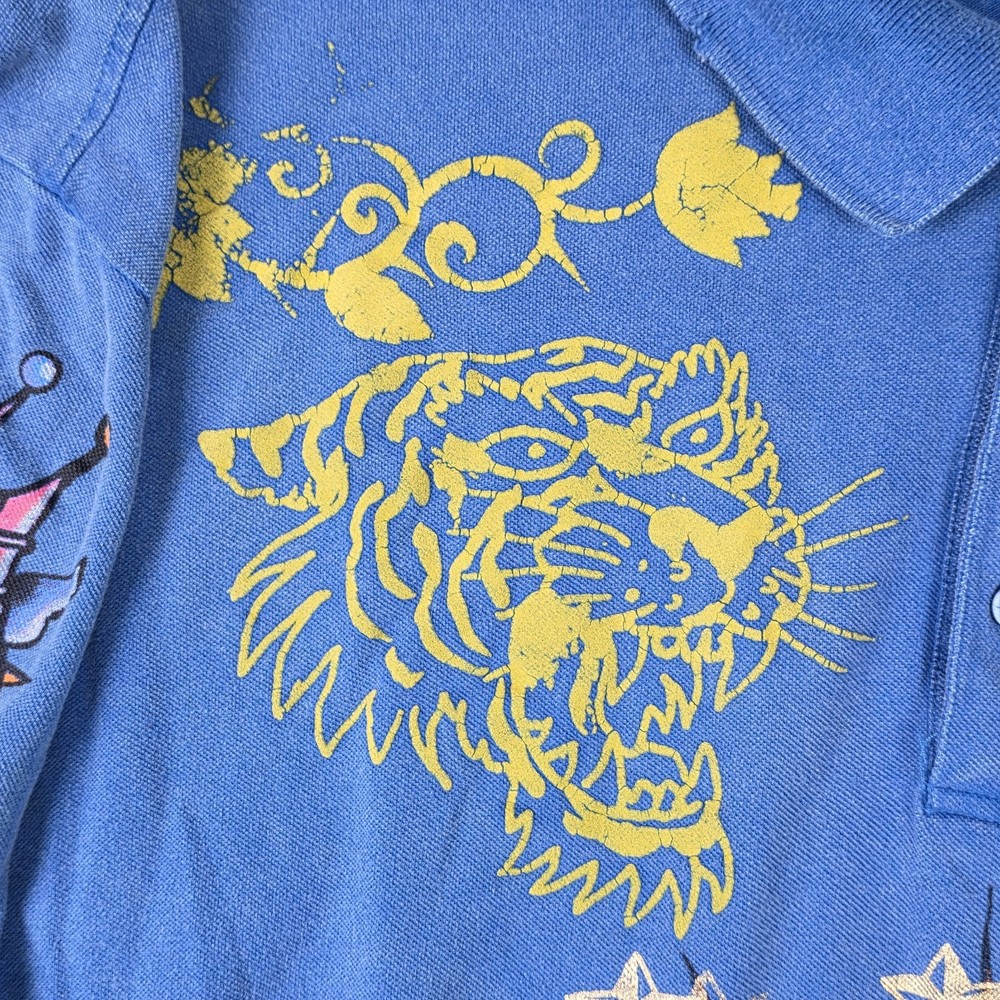 Ed Hardy Polo Shirt Mens 3XL, Pit to Pit 26", Shoulder to Hem 30" Blue Christian Audigier Tattoo Style All Over Print Good Condition, Slight Fade