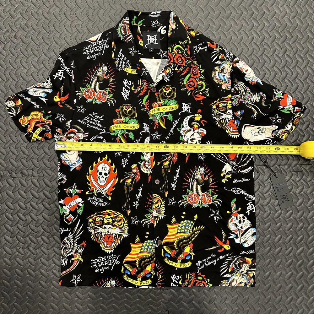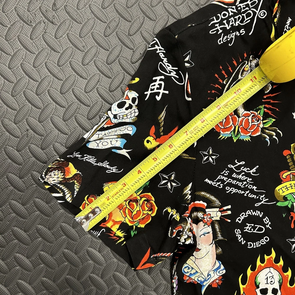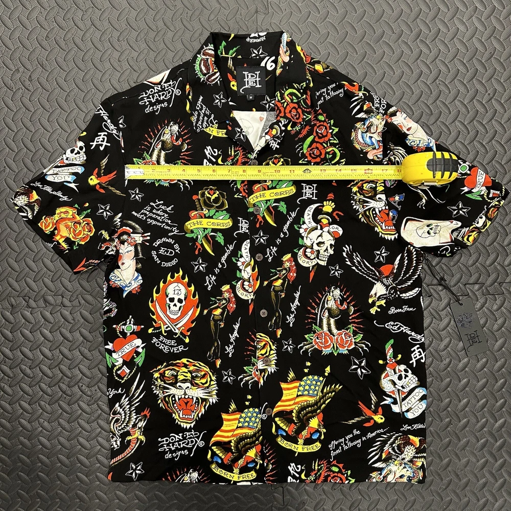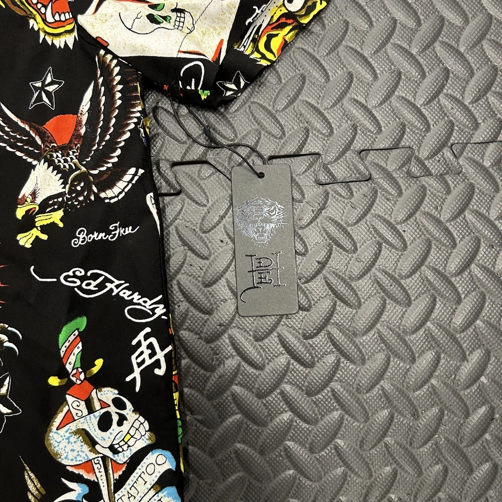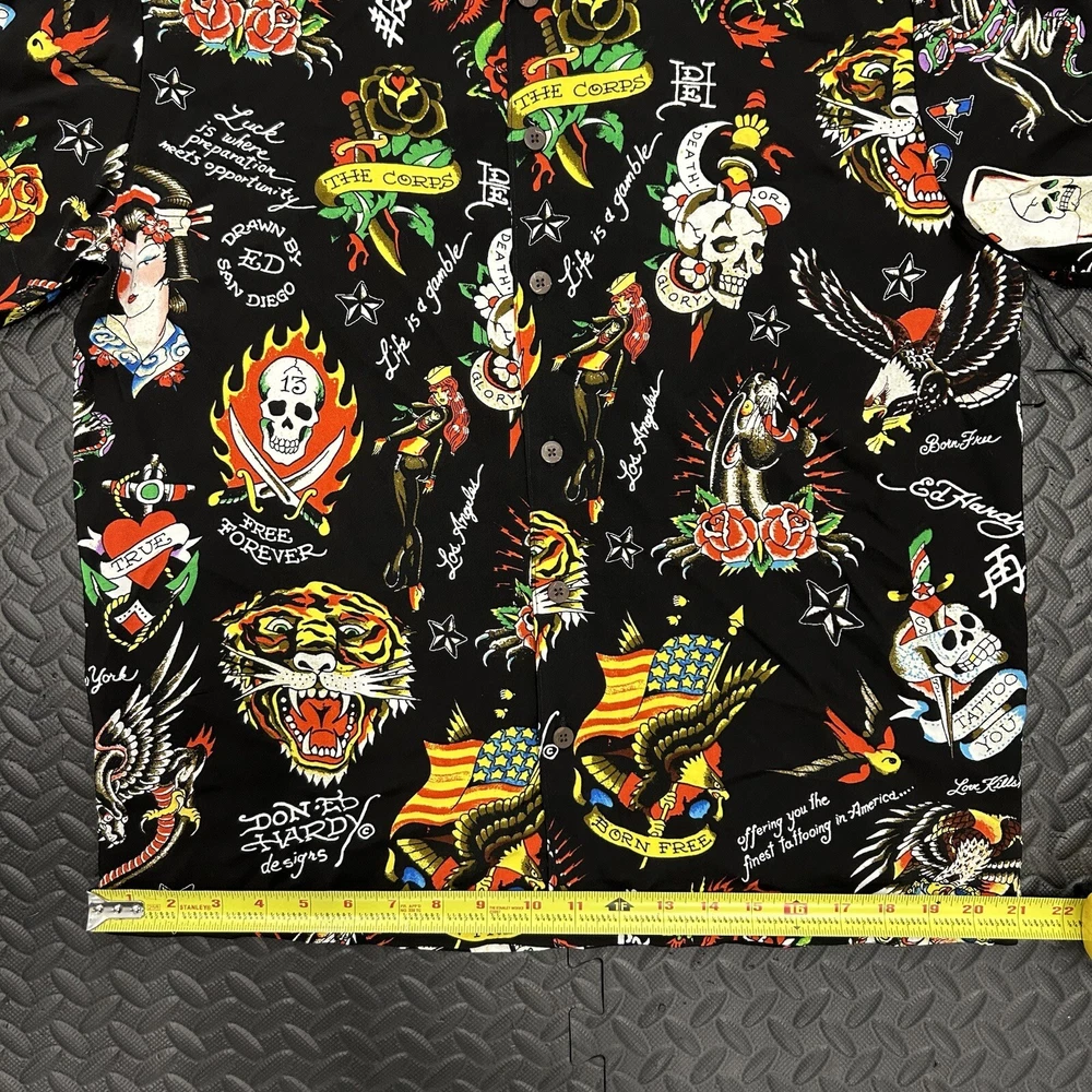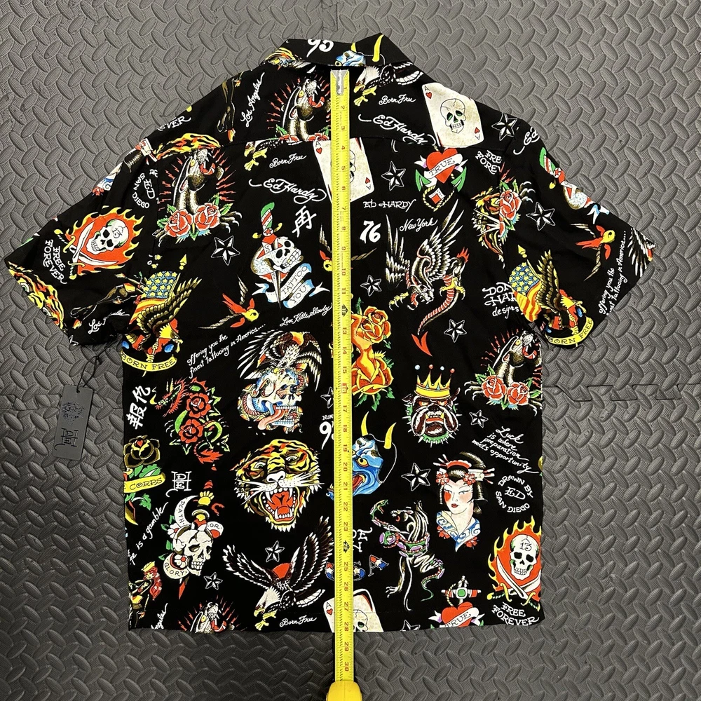Stand out from the crowd with this Ed Hardy button-up shirt. Featuring a striking graphic print of skulls, birds and tattoos, this shirt is perfect for any occasion - from casual hangouts to workwear. The collared neckline and short sleeves with button closure make it ideal for summer, while the viscose material ensures it's lightweight and easy to care for. Add some personality to your wardrobe with this designer shirt. 100% Authentic. 100% Viscose. Made in China. In-Hand Ready to Ship. Brand New. Please see pics above for a closer look at product n measurements. All measurements are a close approximate. Legit Seller. Measurements: (Each is a real close approximate) Pit to Pit: 21.5” Shoulders: 17” Sleeve Length: 7.5” Hem: 21” Length: 28.25”