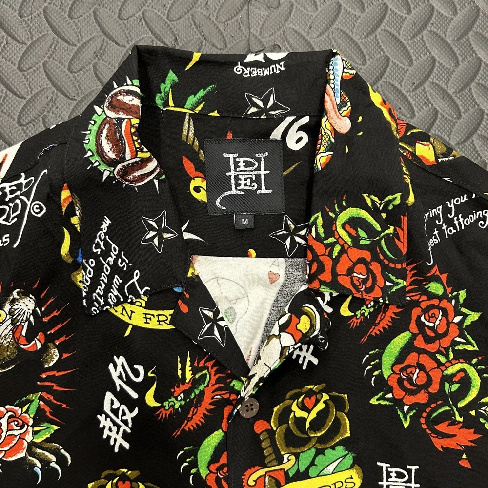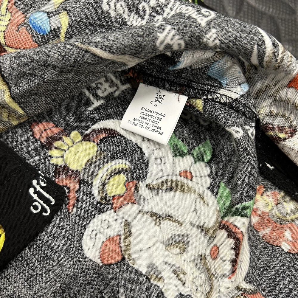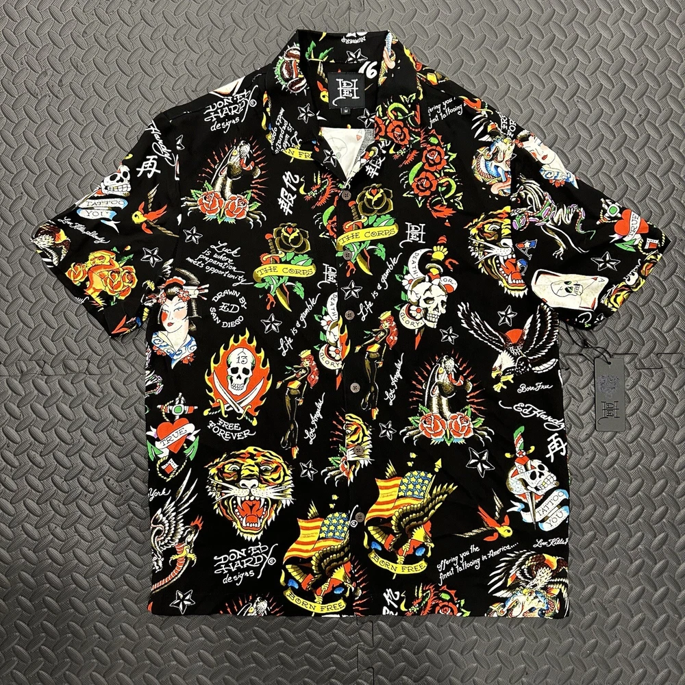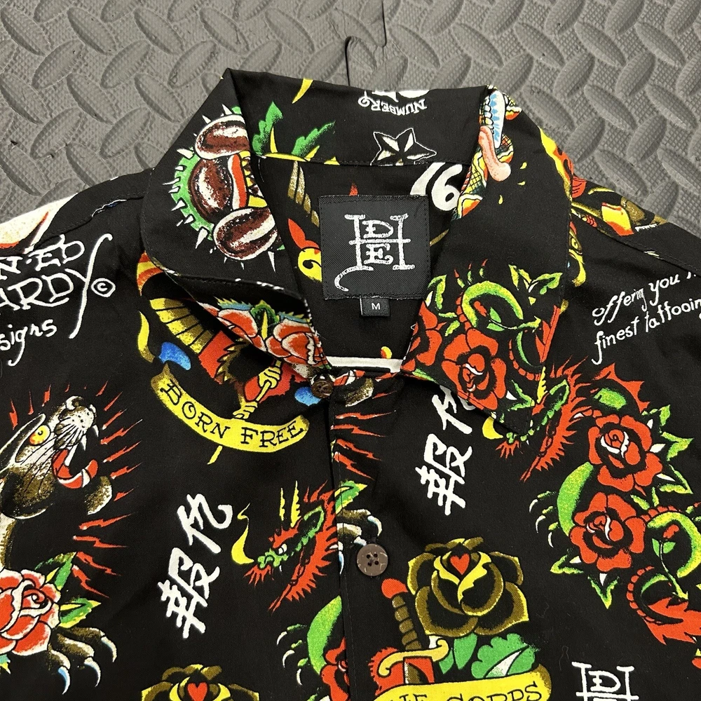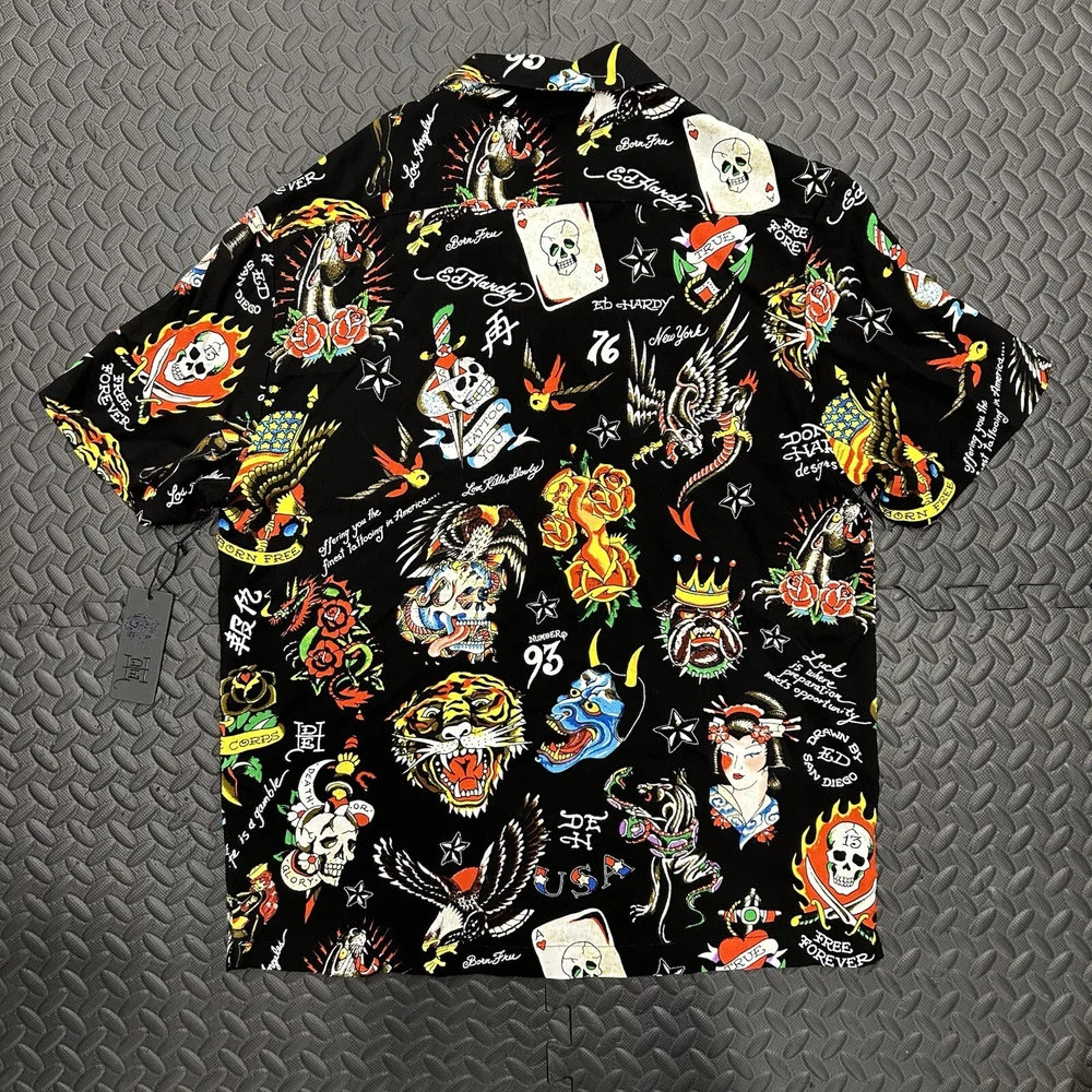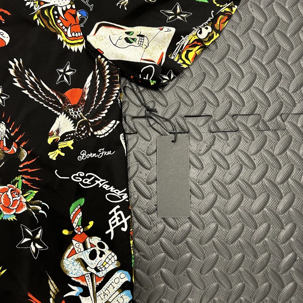 Stand out from the crowd with this Ed Hardy button-up shirt. Featuring a striking graphic print of skulls, birds and tattoos, this shirt is perfect for any occasion - from casual hangouts to workwear. The collared neckline and short sleeves with button closure make it ideal for summer, while the viscose material ensures it's lightweight and easy to care for. Add some personality to your wardrobe with this designer shirt. 100% Authentic. 100% Viscose. Made in China. In-Hand Ready to Ship. Brand New. Please see pics above for a closer look at product n measurements. All measurements are a close approximate. Legit Seller. Measurements: (Each is a real close approximate) Pit to Pit: 21.5” Shoulders: 17” Sleeve Length: 7.5” Hem: 21” Length: 28.25”