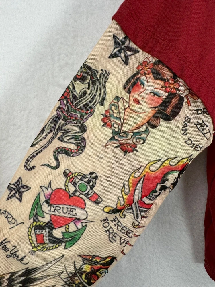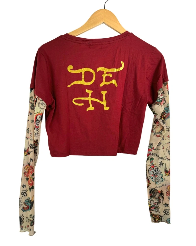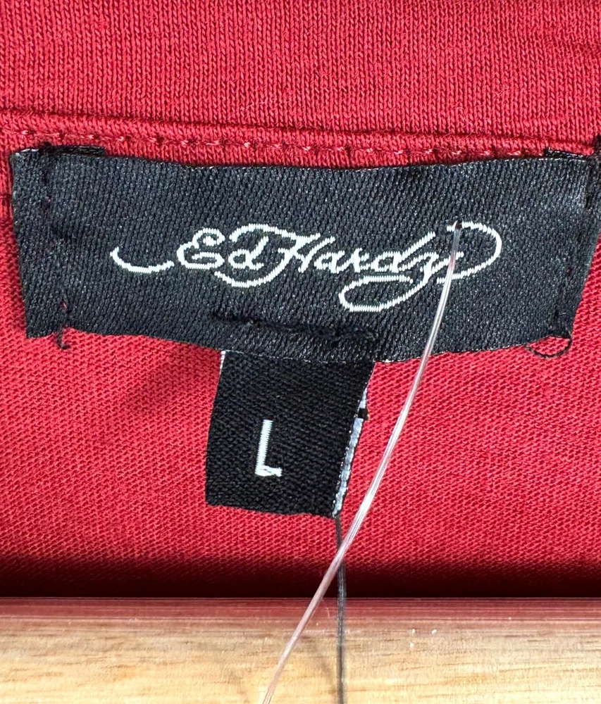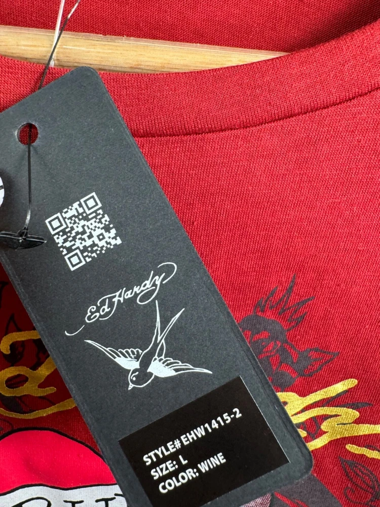 New with Tag "Turn heads with this Ed Hardy Sheer Sleeve Graphic Cropped Shirt in bold red! 🔥 Featuring retro-inspired graphics and sheer sleeves, this statement top brings an edgy, Y2K vibe to any look. The cropped fit is perfect for pairing with high-waisted jeans or skirts, adding a touch of daring style to your wardrobe. Flat lay: pit to pit 17.5" Length 16" Material: 65% Poly 35% Cotton Y2K, 90s, colorful, sheer, graphic, festival, moto, cropped, tiger, steampunk, moto, goth, biker, vampy, rocker, rebellious, metal, alternative, vintage inspired PLEASE check all flat lay measurements and listings carefully BEFORE PURCHASE!I put in a lot of work into hand measuring and researching each items as best as I can! Thank you so much for your consideration! Please note that: RETURN SHIP FEE IS PAID BY THE BUYER! If you are not too familiar with flat lay measurements, I recommend taking a measurement of your own clothes that you feel comfortable and compare with the measurement I provide. For returns: The items MUST BE IN SAME CONDITION AS SOLD for full refund! We all don't like returns and let's work together to minimize! Please note that RETURNS ARE NOT ACCEPTED FOR NEW WITH TAG OR NEW WITHOUT TAG ITEMS!
