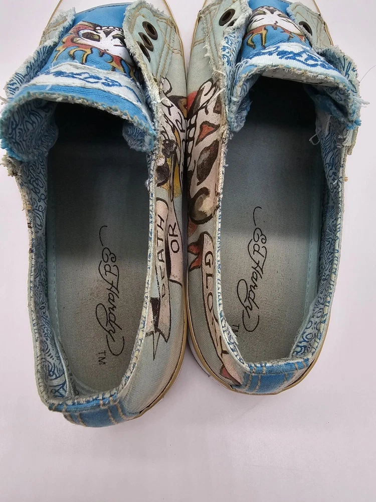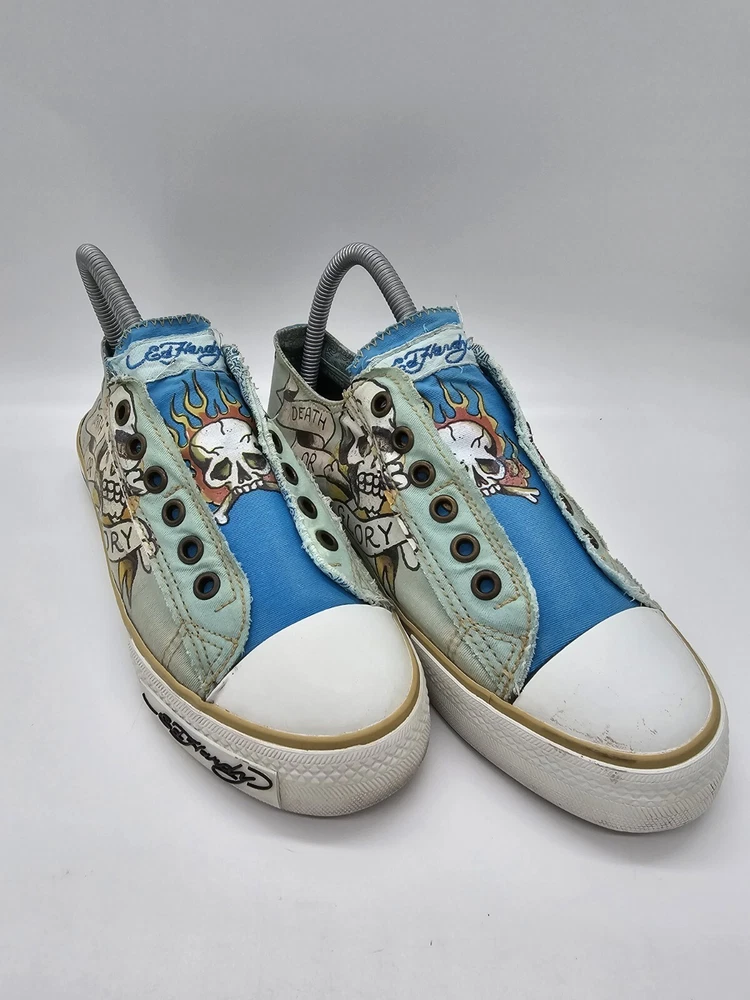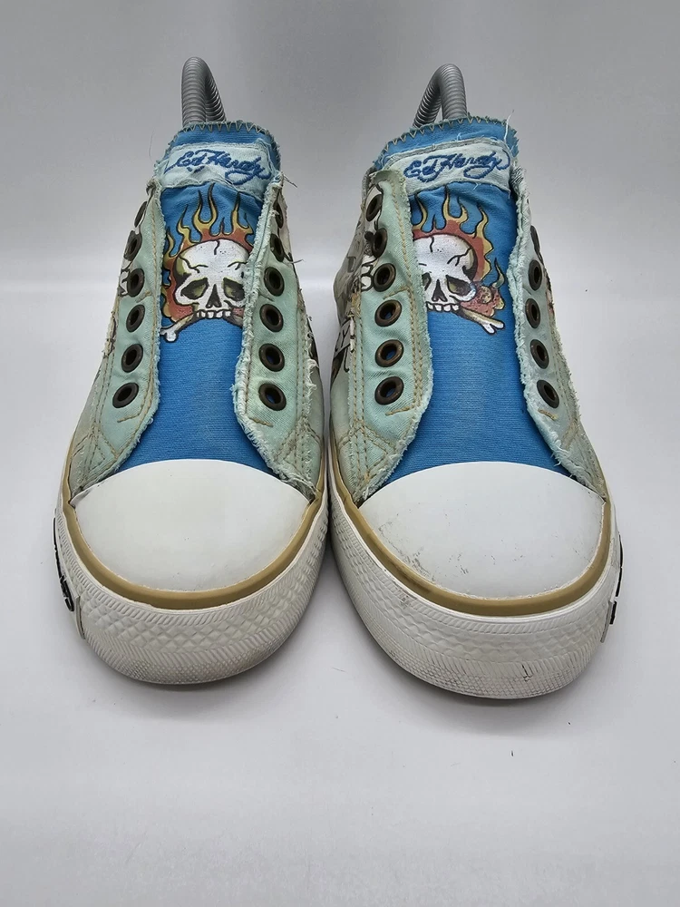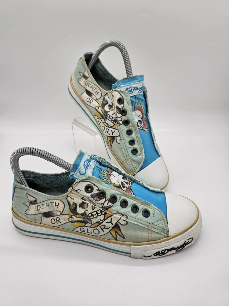 Ed Hardy Women's Size 7 Shoes Flaming Skull Slip On Death Or Glory Blue Green