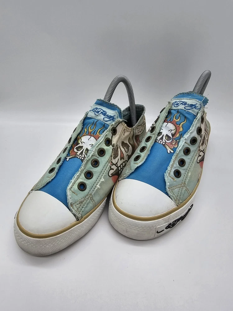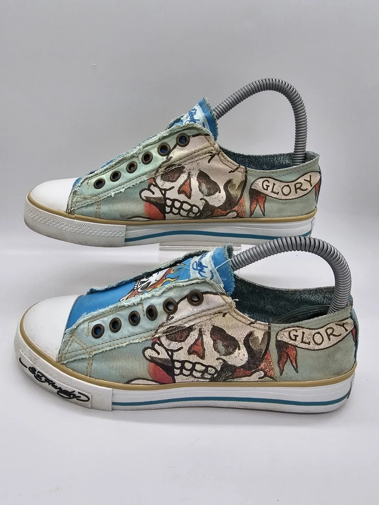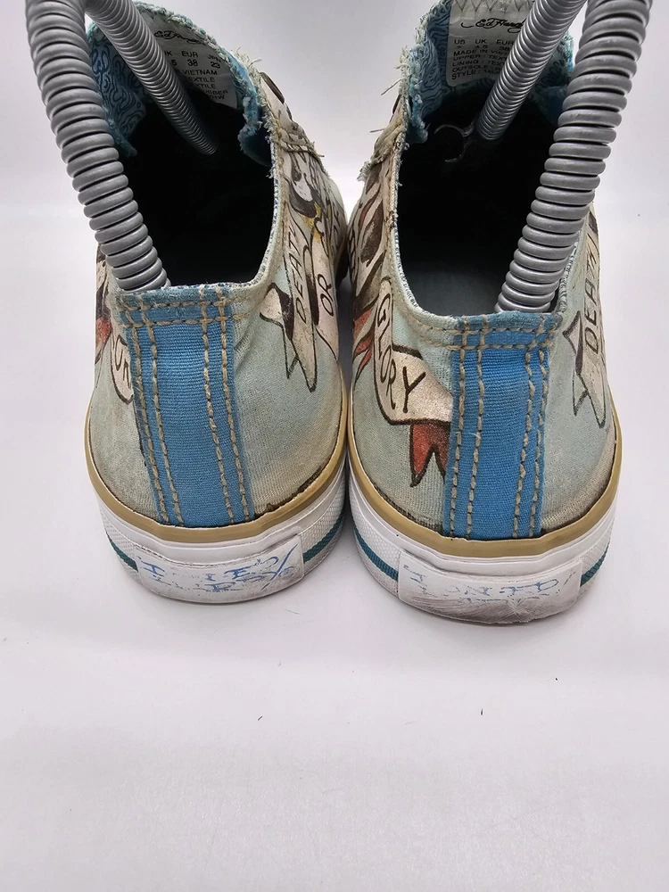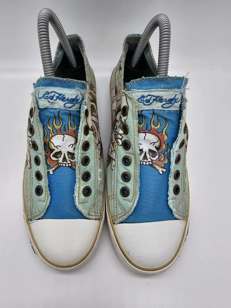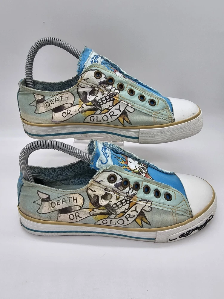 Ed Hardy Women's Size 7 Shoes Flaming Skull Slip On Death Or Glory Blue Green