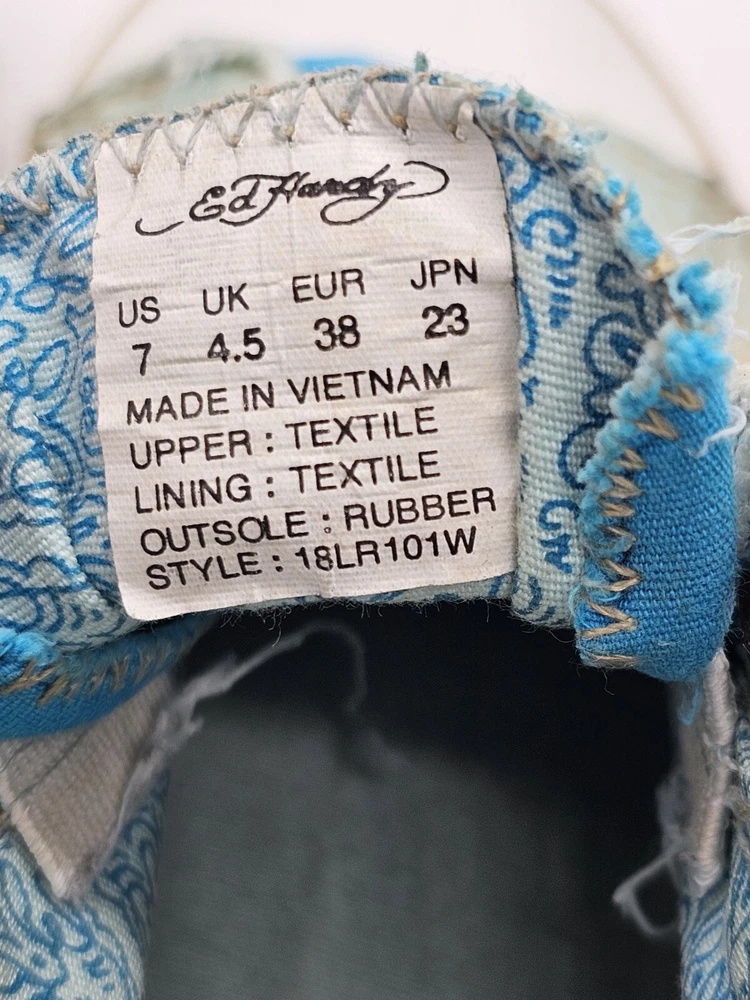 Accents: Logo Performance/Activity: Walking Color: Multicolor Closure: Slip On Country/Region of Manufacture: Vietnam Fabric Type: Canvas Customized: No Shoe Shaft Style: Low Top Upper Material: Canvas Outsole Material: Rubber Model: Flaming Skull Style Code: 18LR101W Vintage: Yes Lining Material: Canvas US Shoe Size: 7 Department: Women UK Shoe Size: 4.5 Shoe Width: Standard Pattern: All Over Print Insole Material: Foam EU Shoe Size: 38 Cleat Type: Rubber Season: Fall, Spring, Summer, Winter Signed: No Occasion: Casual Features: Comfort, Lightweight Style: Sneaker Type: Athletic Theme: Skull Brand: Ed Hardy