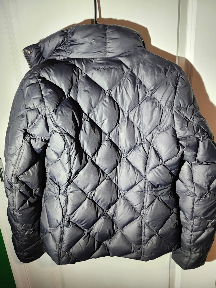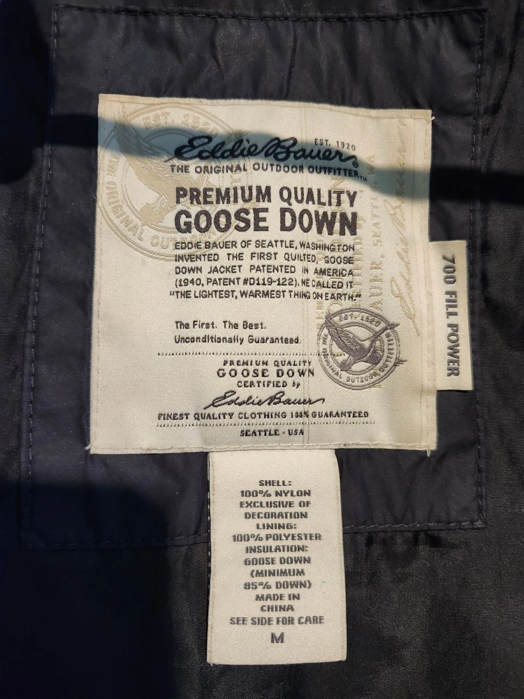 Warm, lightweight, and built for cold weather — this Eddie Bauer 700 Fill Power Goose Down Jacket delivers premium insulation in a classic quilted design. Features a full‑zip front, soft lining, and Eddie Bauer’s signature high‑quality construction. Item Details Brand: Eddie Bauer Style: Quilted Down Jacket Insulation: 700 Fill Power Goose Down Size: Men’s Medium Color: Black (or dark charcoal, depending on your lighting) Shell: 100% Nylon Lining: 100% Polyester Made In: China Features: • Premium goose down insulation • Diamond‑quilted exterior • Full‑zip front • Lightweight but very warm • Classic Eddie Bauer outdoor design Condition Good pre‑owned condition. Light normal wear, no major flaws noted. Shipping Ships fast and packaged with care.