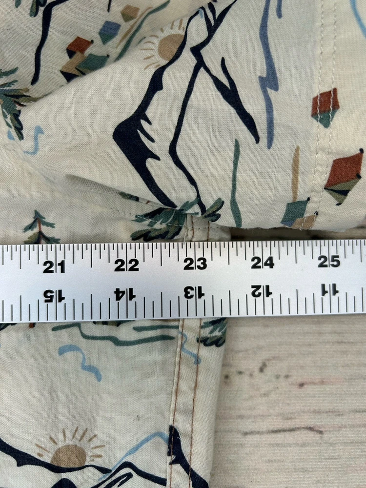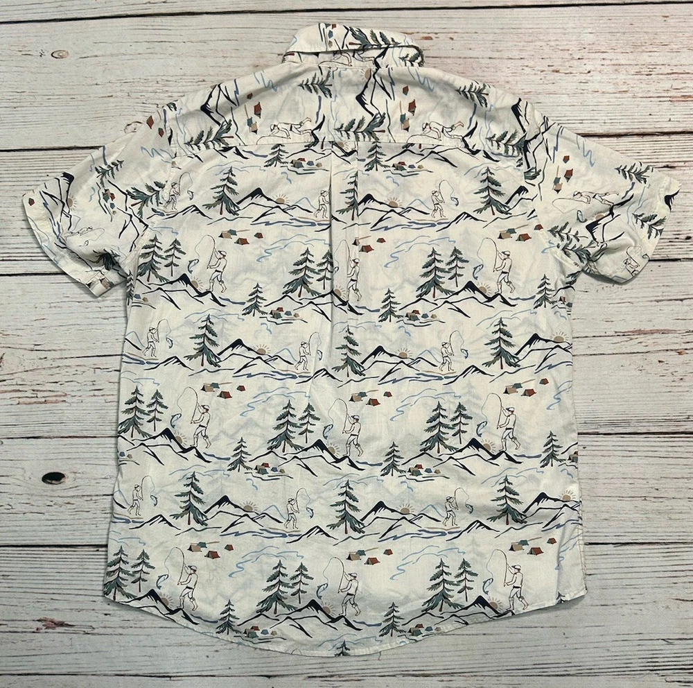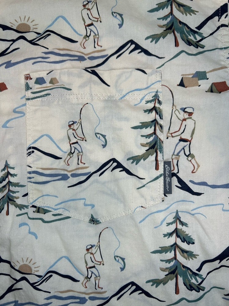 Closure: Button Garment Care: Machine Washable Material: Cotton Theme: Fish Size Type: Regular Type: Button-Up Occasion: Casual, Travel, Workwear Features: Lightweight, Pockets Neckline: Collared Collar Style: Button-Down Season: Fall, Spring, Summer, Winter Sleeve Length: Short Sleeve Country/Region of Manufacture: India Fit: Classic Color: Multicolor Size: L Department: Men Vintage: No Pattern: camping scenery Brand: Eddie Bauer