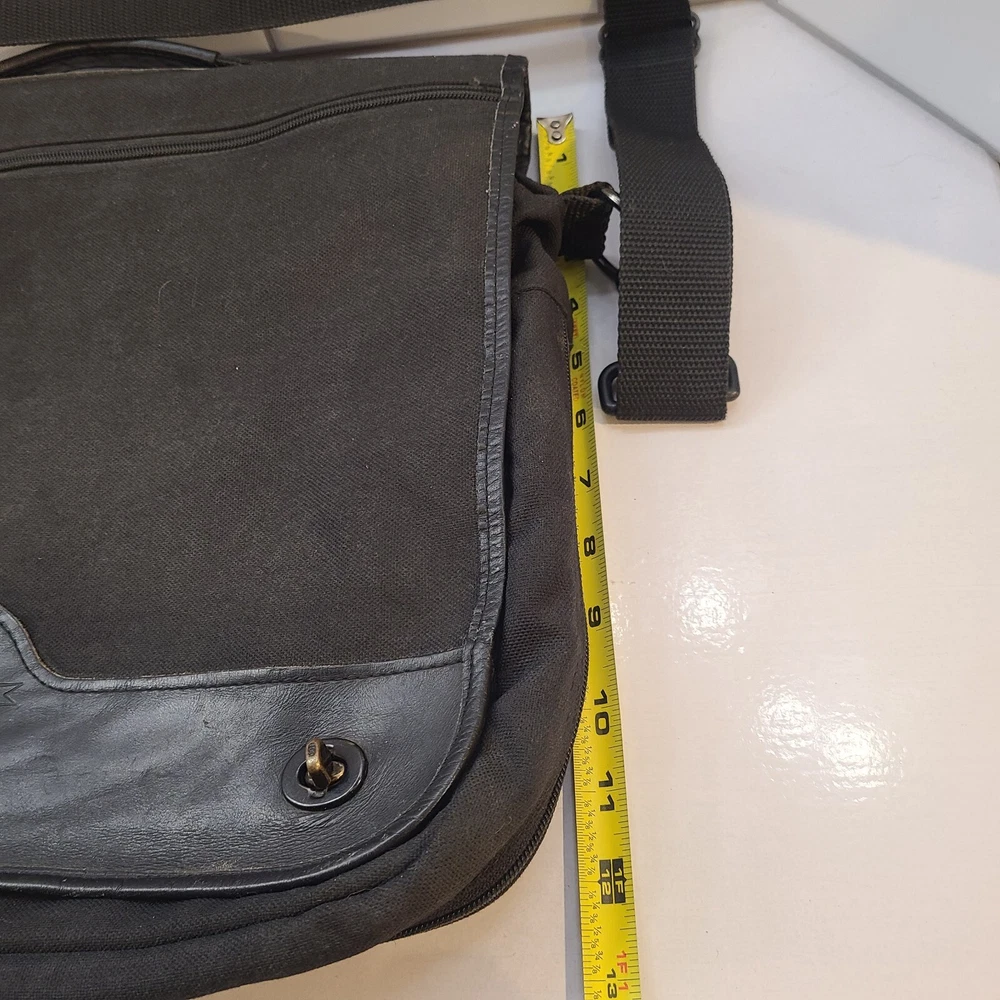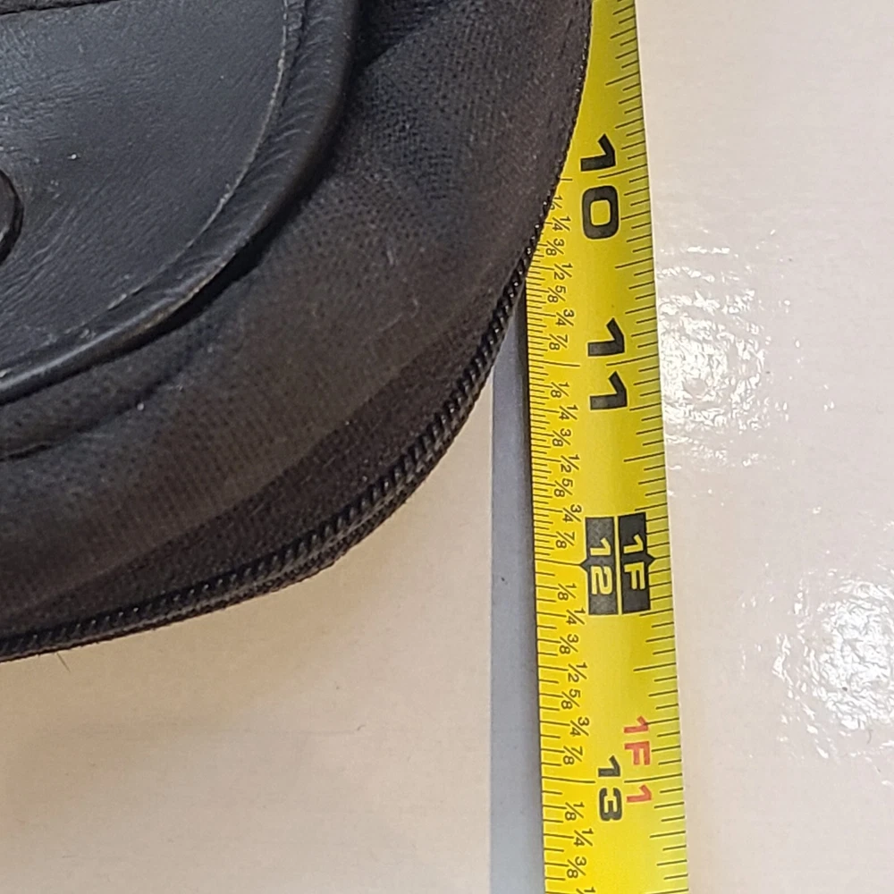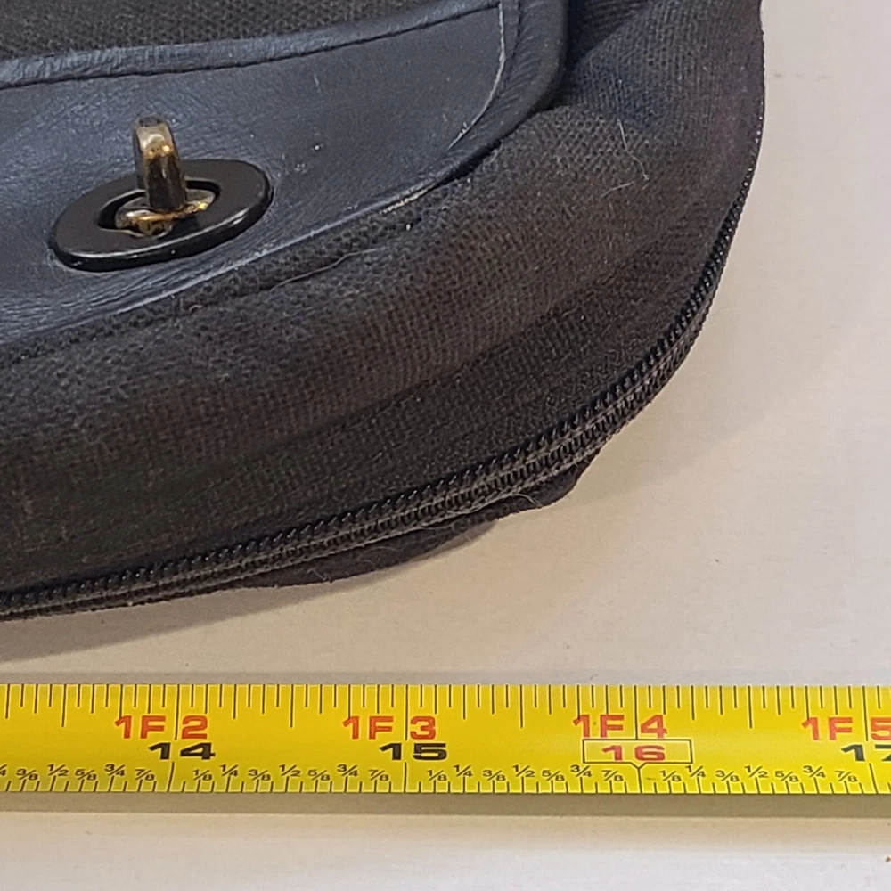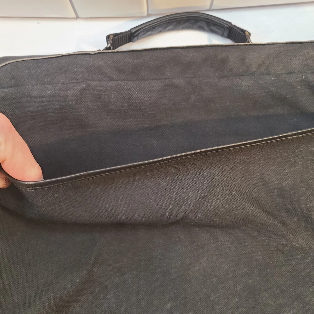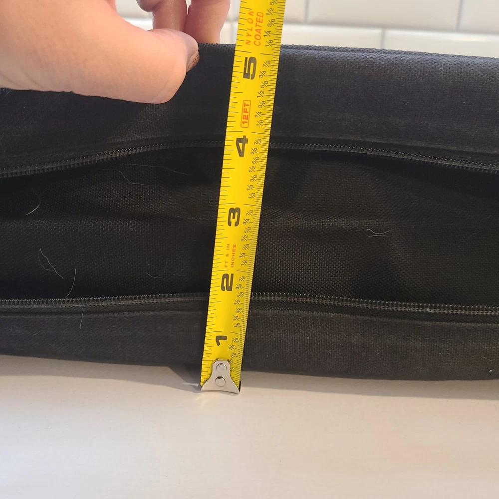 Expandable from 2.5 in depth to 5 in depth via zipper. In good condition. A little bit of wear and dust. See pictures and please let me know if you have any questions.