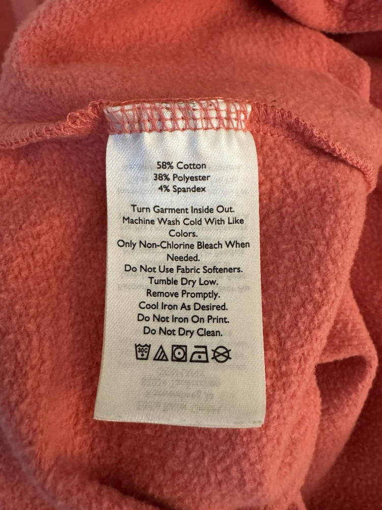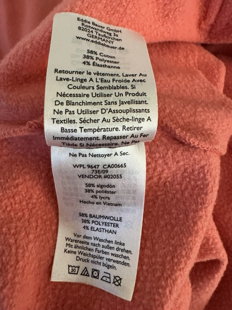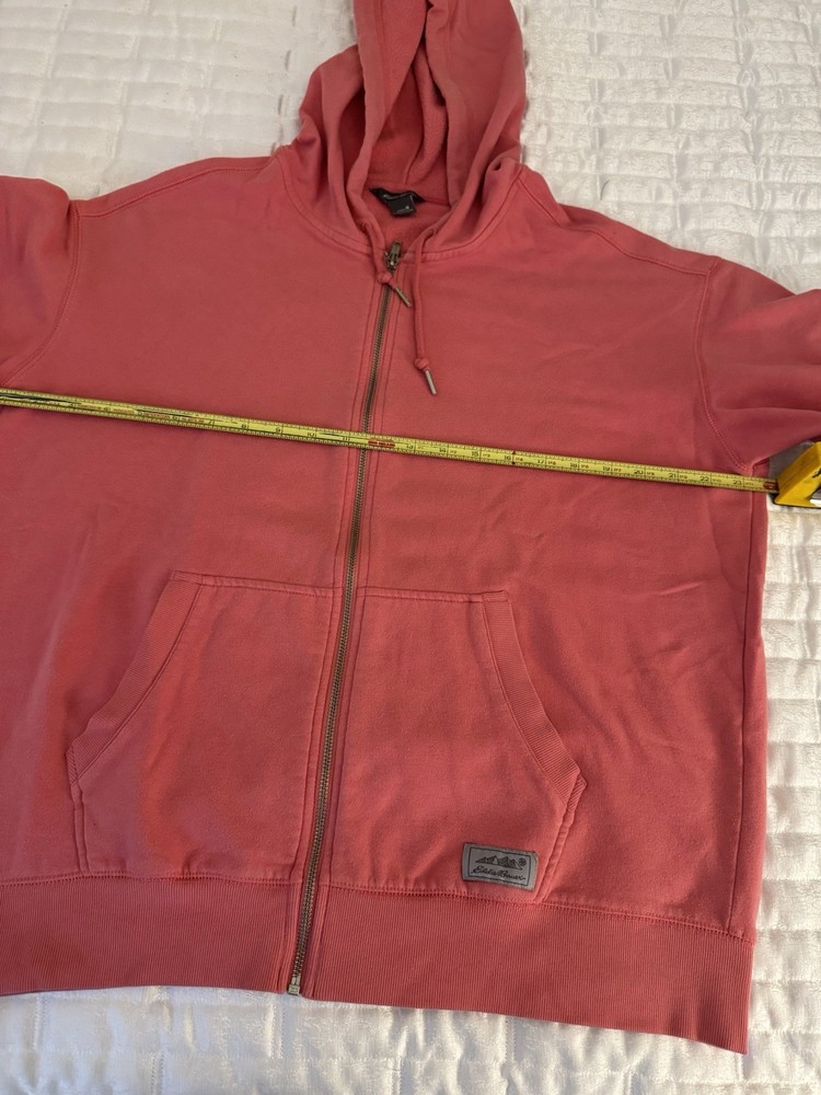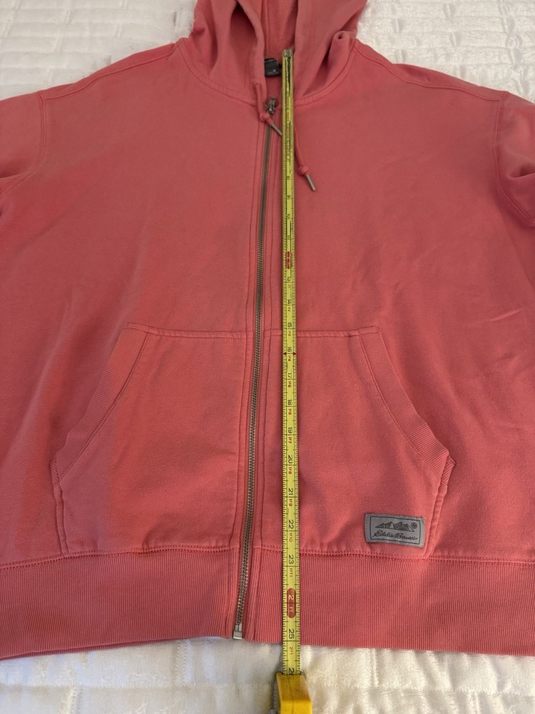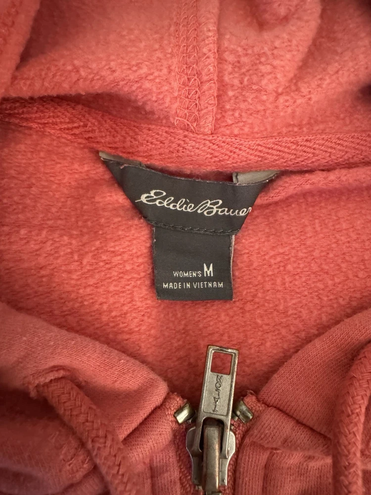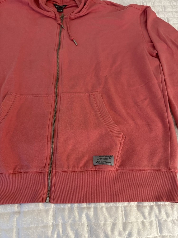 The Eddie Bauer Coral Ladies Zip Up Sweatshirt Hoodie in size Medium is a stylish and comfortable activewear piece perfect for the colder seasons. Made of polyester, this solid coral hoodie features long sleeves, a zip closure, and a hood for added warmth. The Eddie Bauer logo accents the front, making it a versatile option for the winter, fall, and spring seasons. Easy to care for with machine washable instructions, this hoodie is a must-have for any woman's wardrobe.