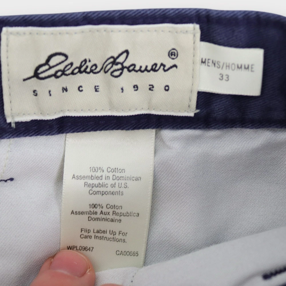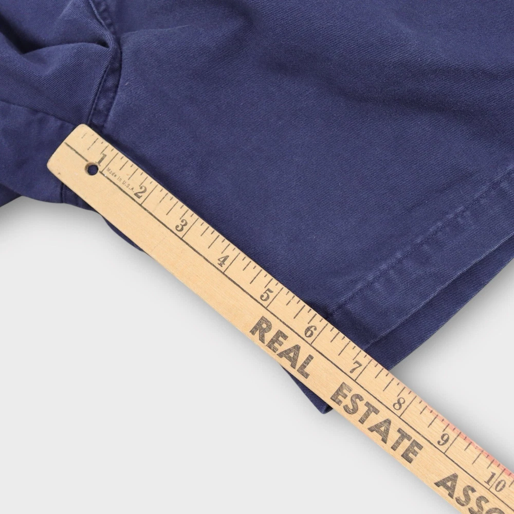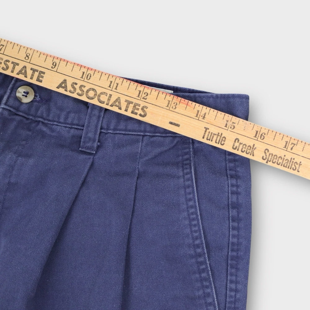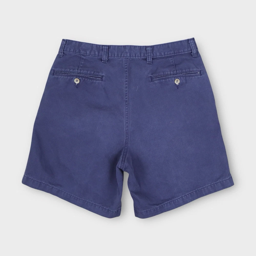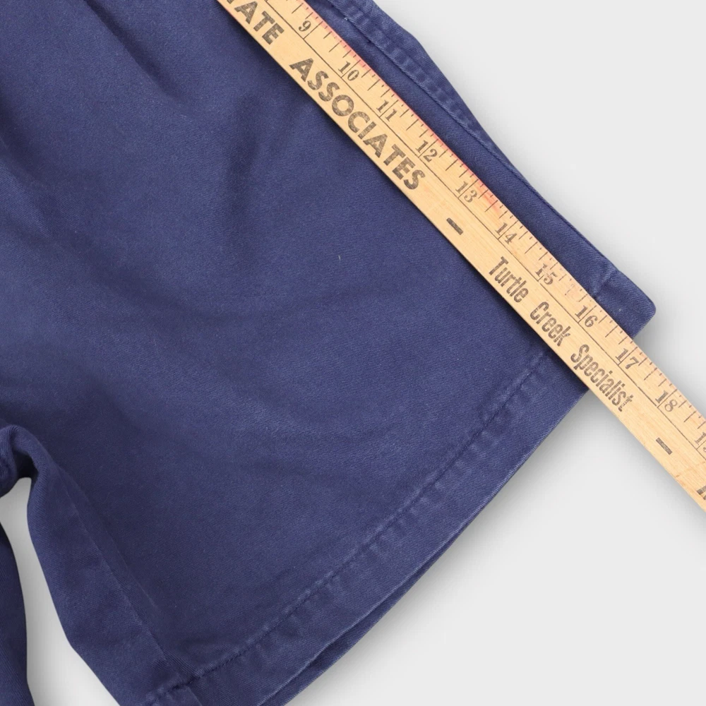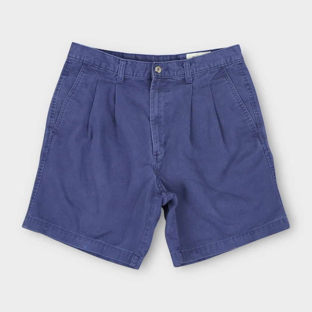 These Eddie Bauer Men's Chino Pleated Shorts in size 33 feature a classic navy blue color and are crafted from comfortable cotton fabric with a canvas weave. The shorts have a zip closure, a mid-rise fit, and a pleated front design for a stylish touch. With a 7-inch inseam, 5-pocket design, and easy-care machine washable material, these shorts are perfect for casual occasions and outdoor activities, embodying a blend of outdoor and preppy themes. The lightweight construction makes them ideal for everyday wear. Tag Size: Men’s 33 Best Fit: * Men: 31/32 Approximate Flat Measurements: * Waist: 15.5” * In Seam: 7” Condition: No Noticeable Flaws All items are second hand, many being vintage and may have small imperfections. Anything major is noted.