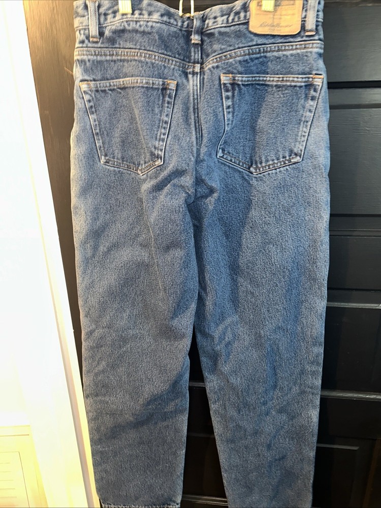 The Eddie Bauer Flannel Lined Jeans feature a relaxed fit design, making them comfortable for everyday wear. They are made of solid blue cotton flannel fabric with a 5-pocket design, accented with buttons, zippers, and the brand's logo. The jeans have a medium fabric wash and come in a size of 29x34, suitable for waist size 34. This unisex garment is machine washable, perfect for the winter, summer, fall, and spring seasons.