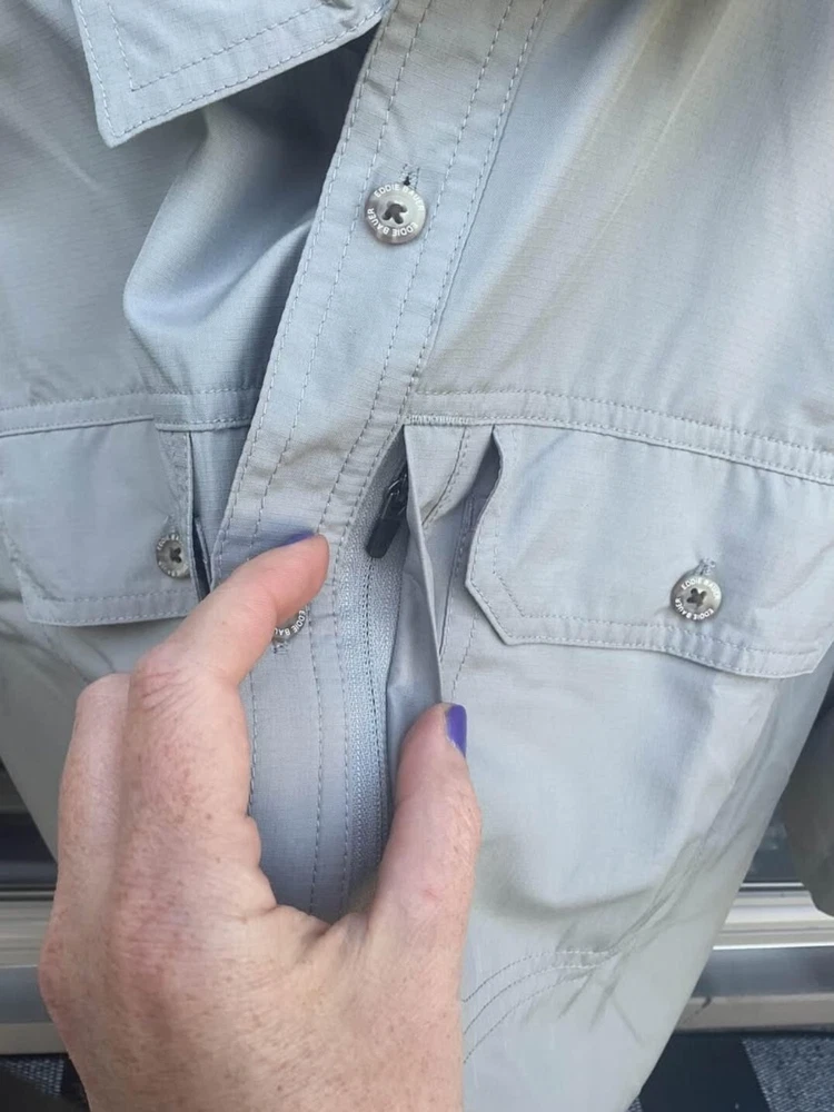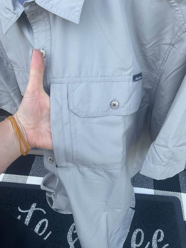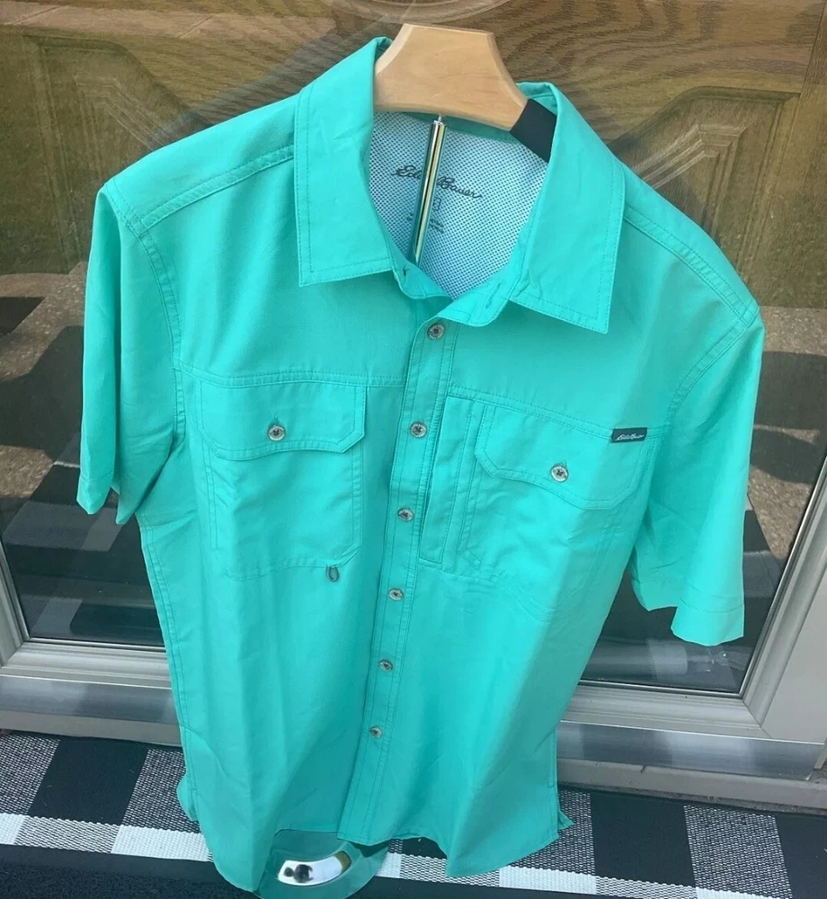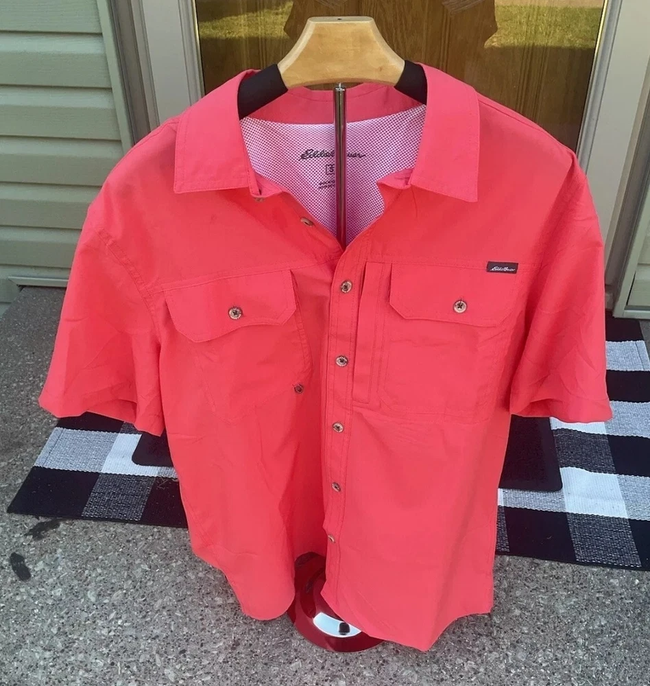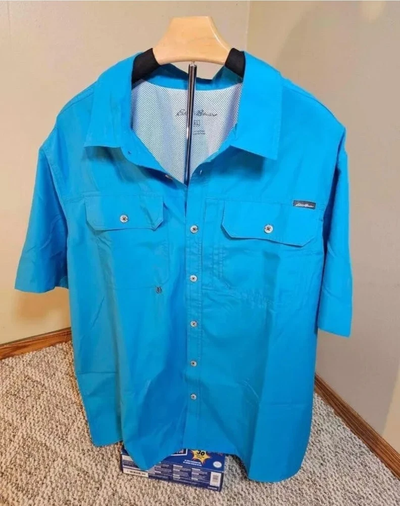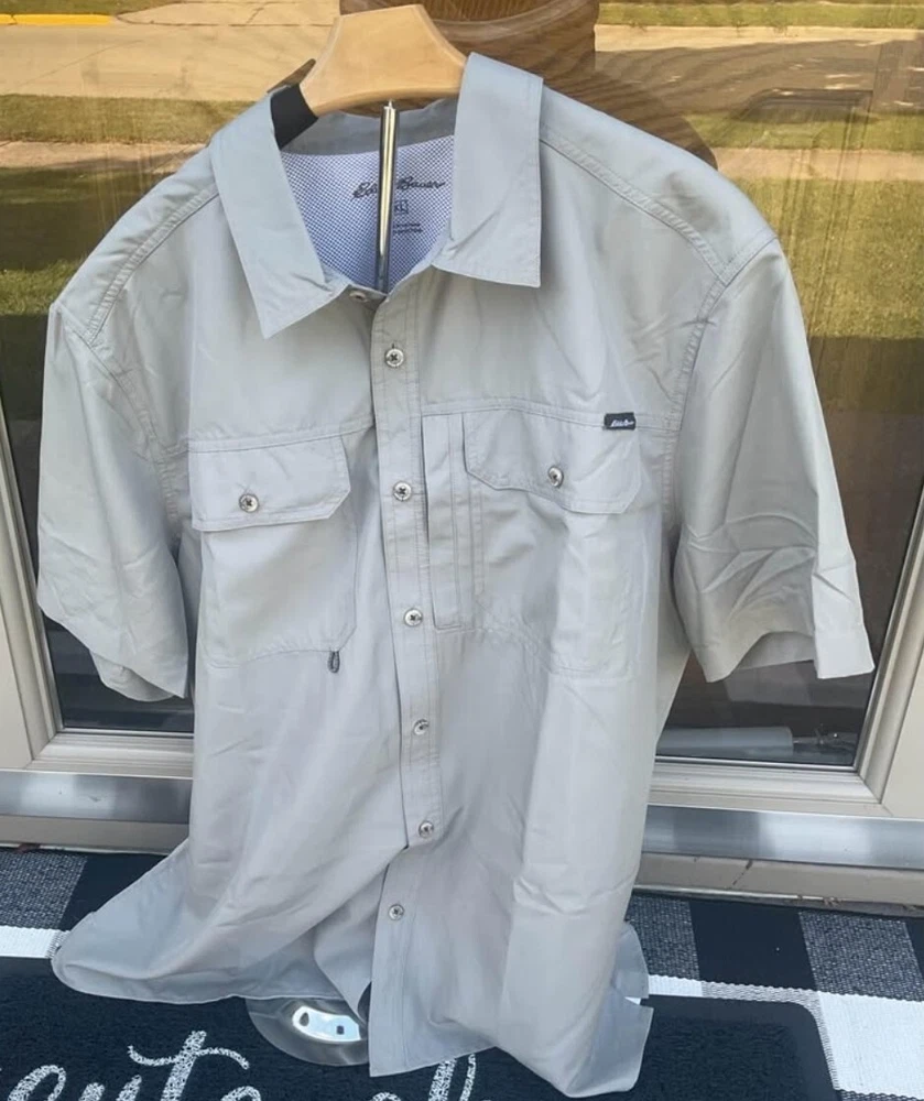 The Eddie Bauer Tech Woven Shirt is a versatile and functional button-up shirt designed for men. Made of polyester material with a woven tech fabric type, this shirt features a spread collar and short sleeves, making it suitable for various occasions such as travel, workwear, or casual outings. The shirt incorporates practical accents like breathable vents, a sunglass loop, and secure zippered pockets for added convenience. With UV protection, moisture-wicking properties, and a cooling mesh back, this shirt is ideal for outdoor activities in summer, fall, or spring. Great for golfing, fishing, hiking, gardening or yardwork as well as the office, parties, or cookouts!