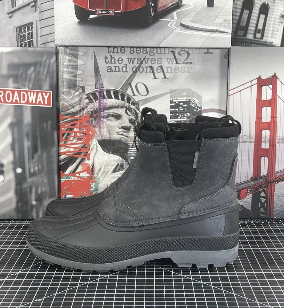 Eddie Bauer Size 11 Mens Dark Grey Paisley Waterproof #287978 Winter Boots NEW • NEW WITH BOX • NEVER WORN • MENS SIZE 11 US Elevate your winter style with these Eddie Bauer paisley snow boots. These boots feature a striking paisley pattern in black and grey, accented by the Eddie Bauer logo. The waterproof suede, polyurethane, and synthetic upper, combined with a rubber outsole, make these boots perfect for any winter or fall activity, whether it's work or play. Pull-on closure and foam insole provide both comfort and convenience, while the handmade design ensures that each pair is unique. Available in size 10 (UK) and 11 (US), these boots are a must-have for any fashion-forward man. Add them to your activewear or workwear collection today!