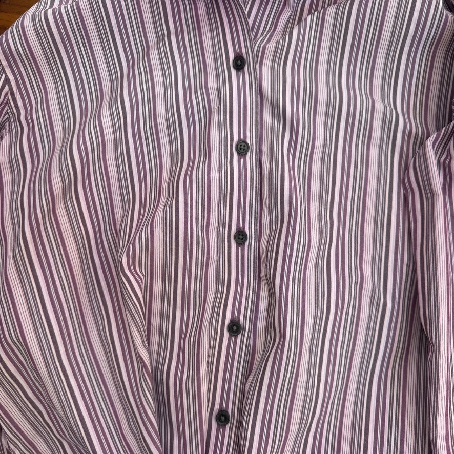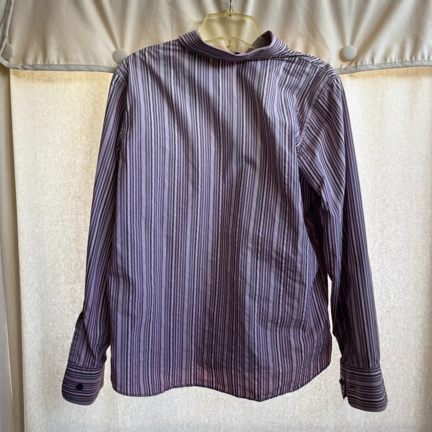 Pre-owned Eddie Bauer women’s wrinkle-resistant button-up shirt in purple and white stripe. Made from 100% cotton for breathable comfort. Classic collared style with full button front and long sleeves. Good pre-owned condition. Please see photos for details and overall condition. 📏 Measurements (Laid Flat) Chest (Pit to Pit): 22 inches Length: 26.5 inches Sleeve Length: 24.25 inches (Please compare measurements to a favorite shirt for best fit.)
